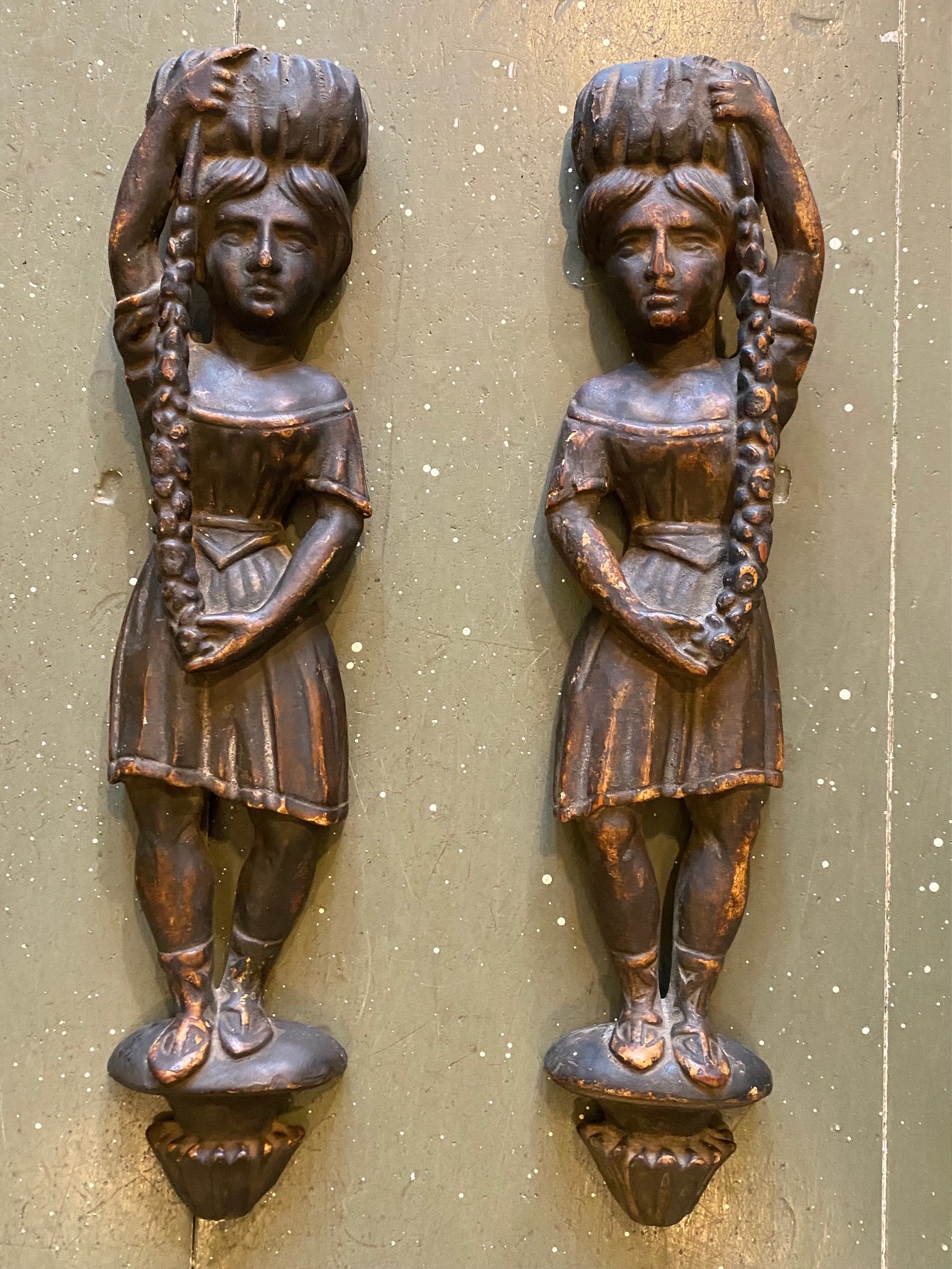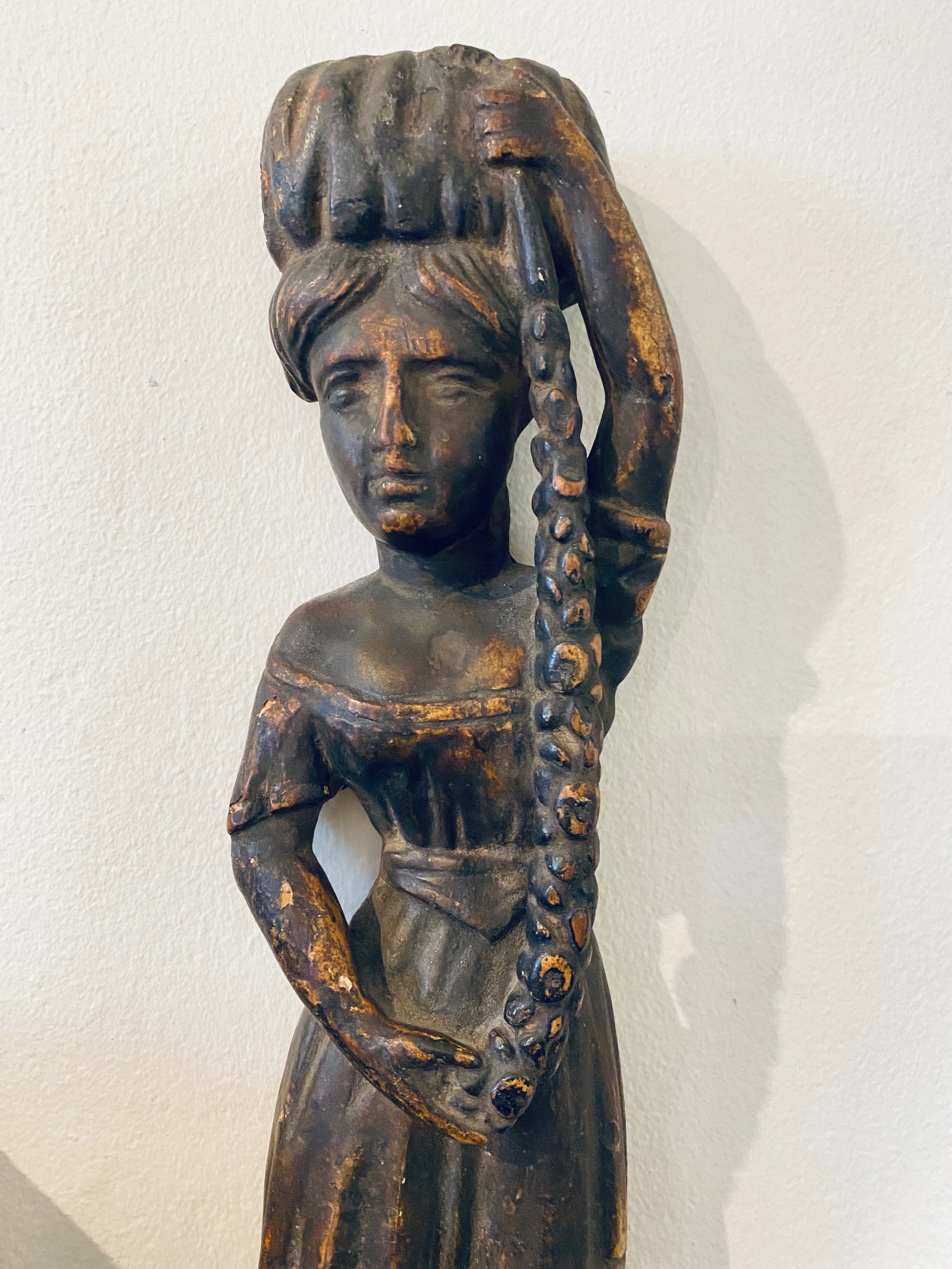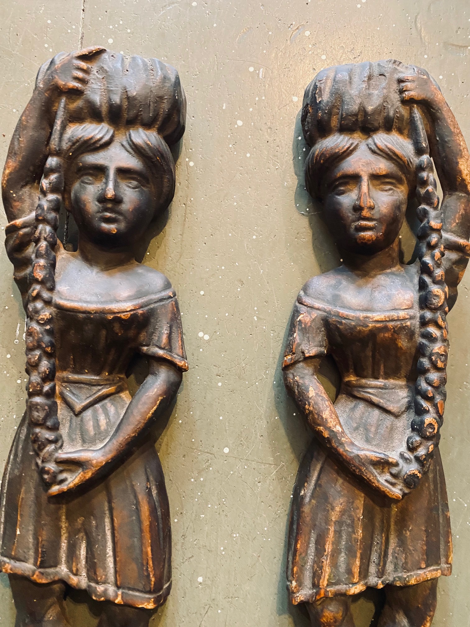 Extremely Rare and Very Special Pair of 18th Century Native American Tobacco Store Hanging Trade Figures, hand carved in the half round full length figures of two American Indian women portrayed in the classical noble fashion prominent in the 17th and 18th Centuries. The figures are from the Northeast Woodlands and clad in tunics reminiscent of Roman togas: the Indian “Princess” mythologized at the time. The companion figures are complimentary right and left images, and each wears a feather headdress, tunic and moccasins, and holds a long tobacco twist in their hands.