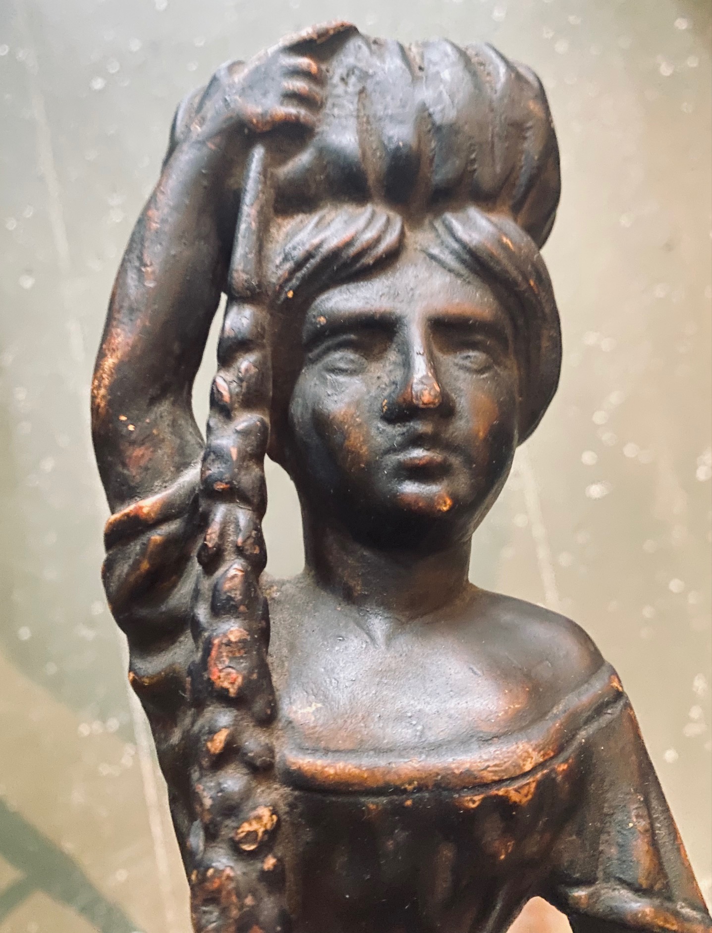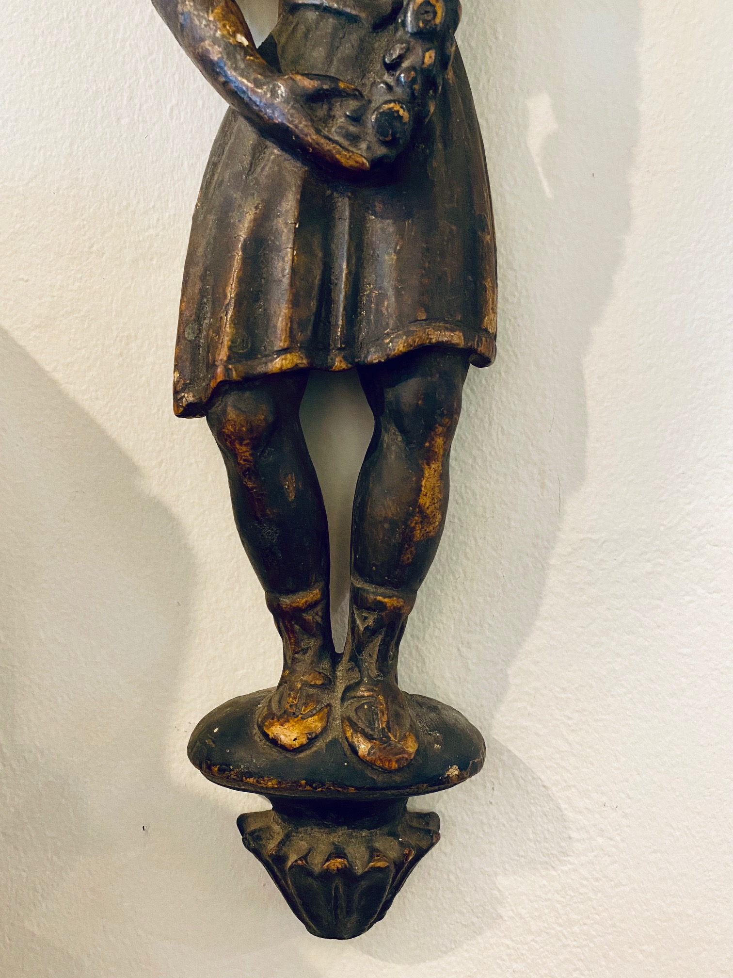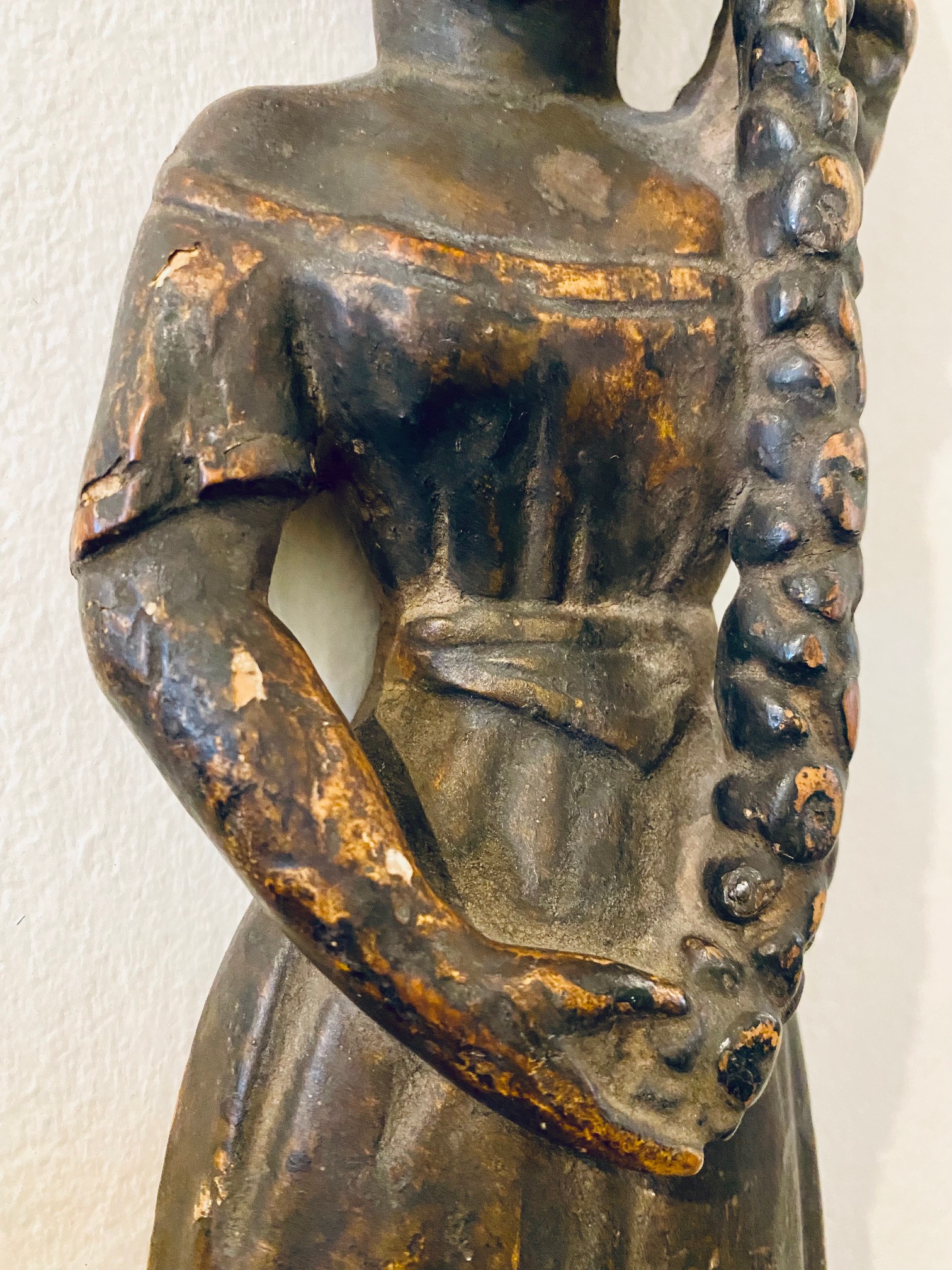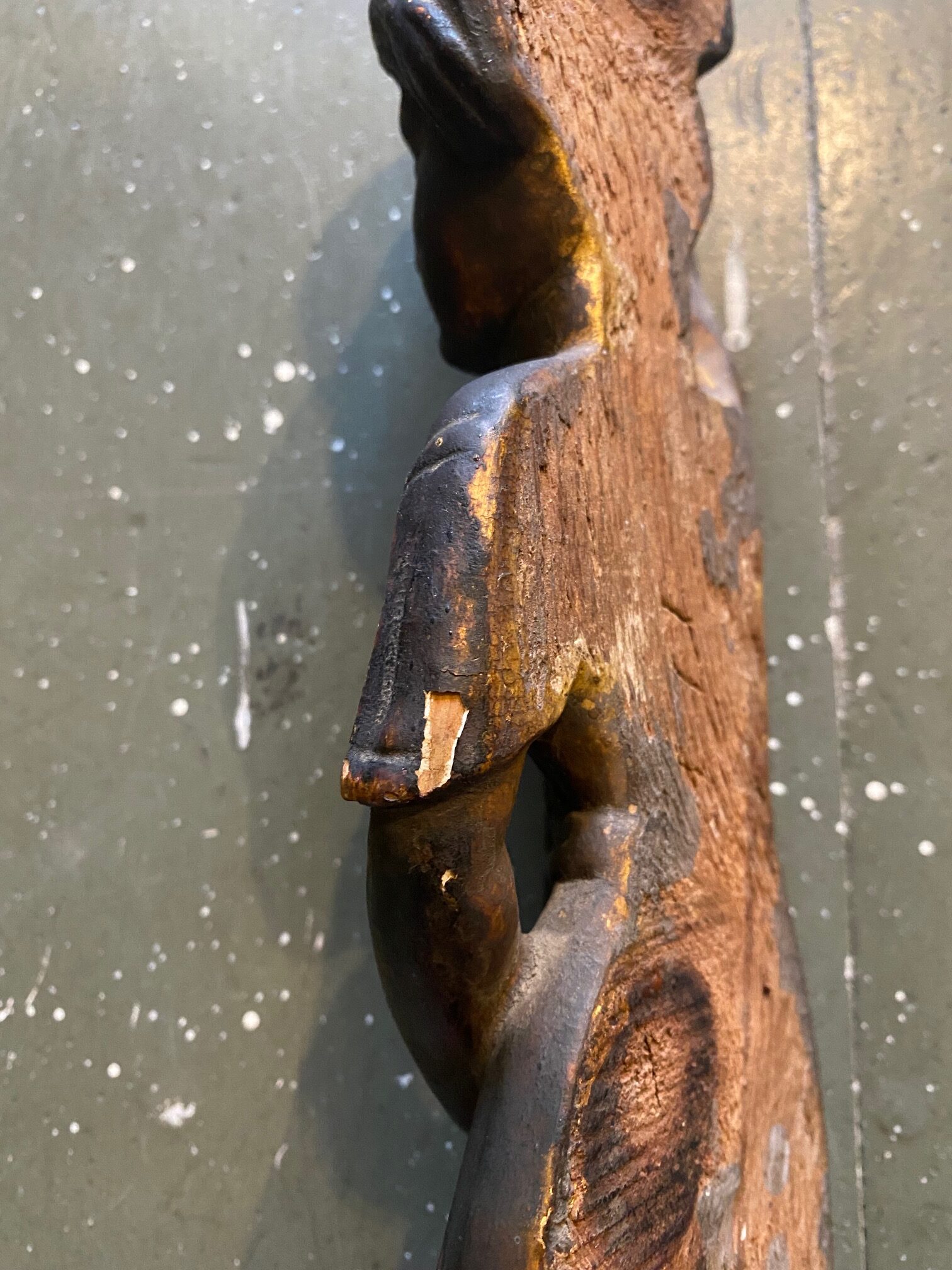 Both figures remain in remarkable condition with no breaks or loss. The surface is of course well rubbed and darkened with age, and retains a good amount of subdued gilding, all of which appears to be original.