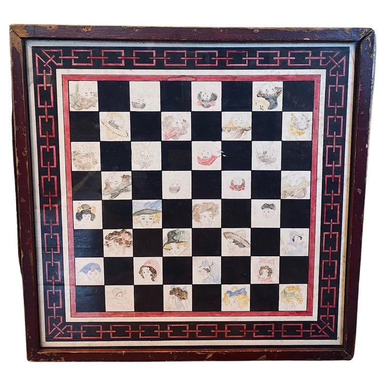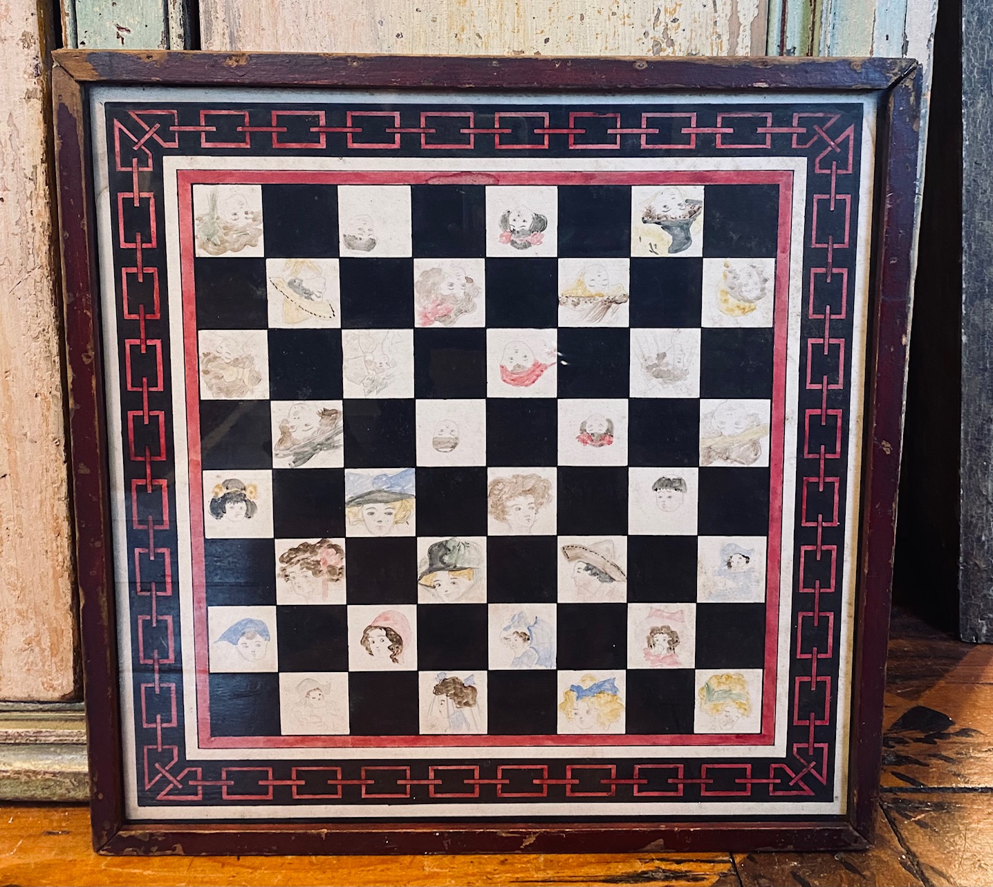 This unique hand made game board combines a country folk art approach with a touch of urban high style in the fashionable portraits (check out those hats!). The piece clearly shows its age and use, but remains in strong color and very good, firm condition.
