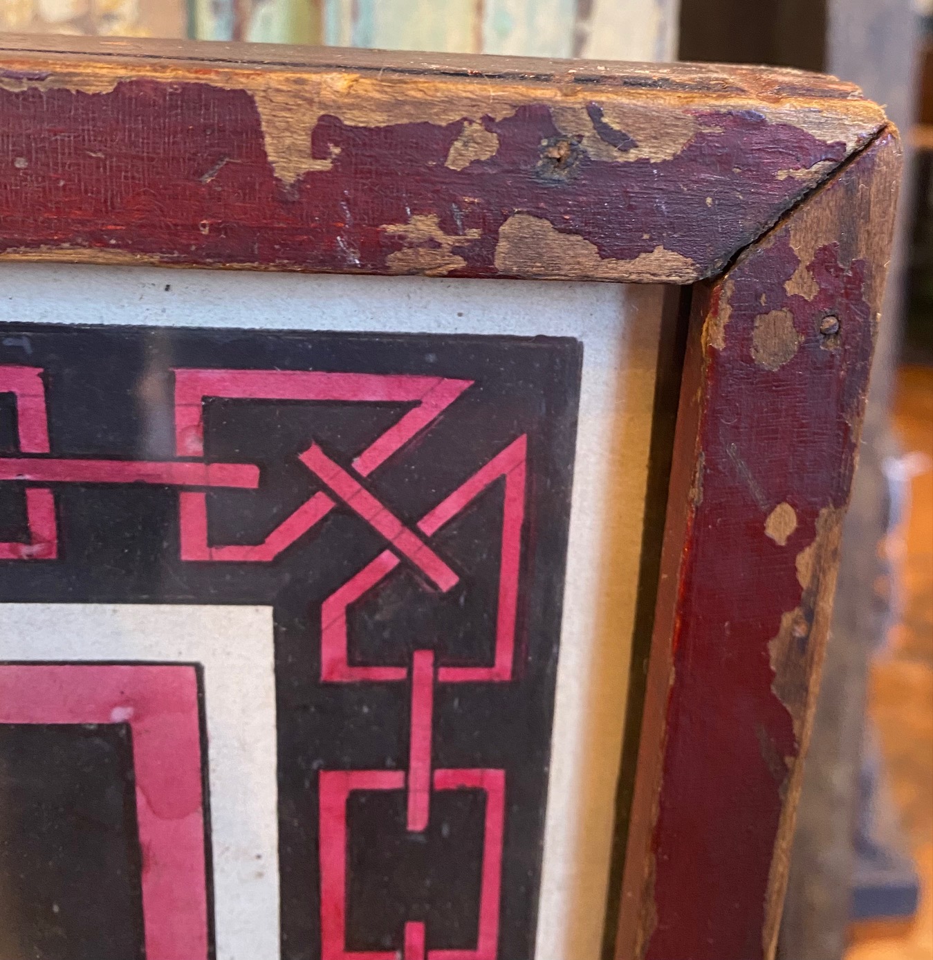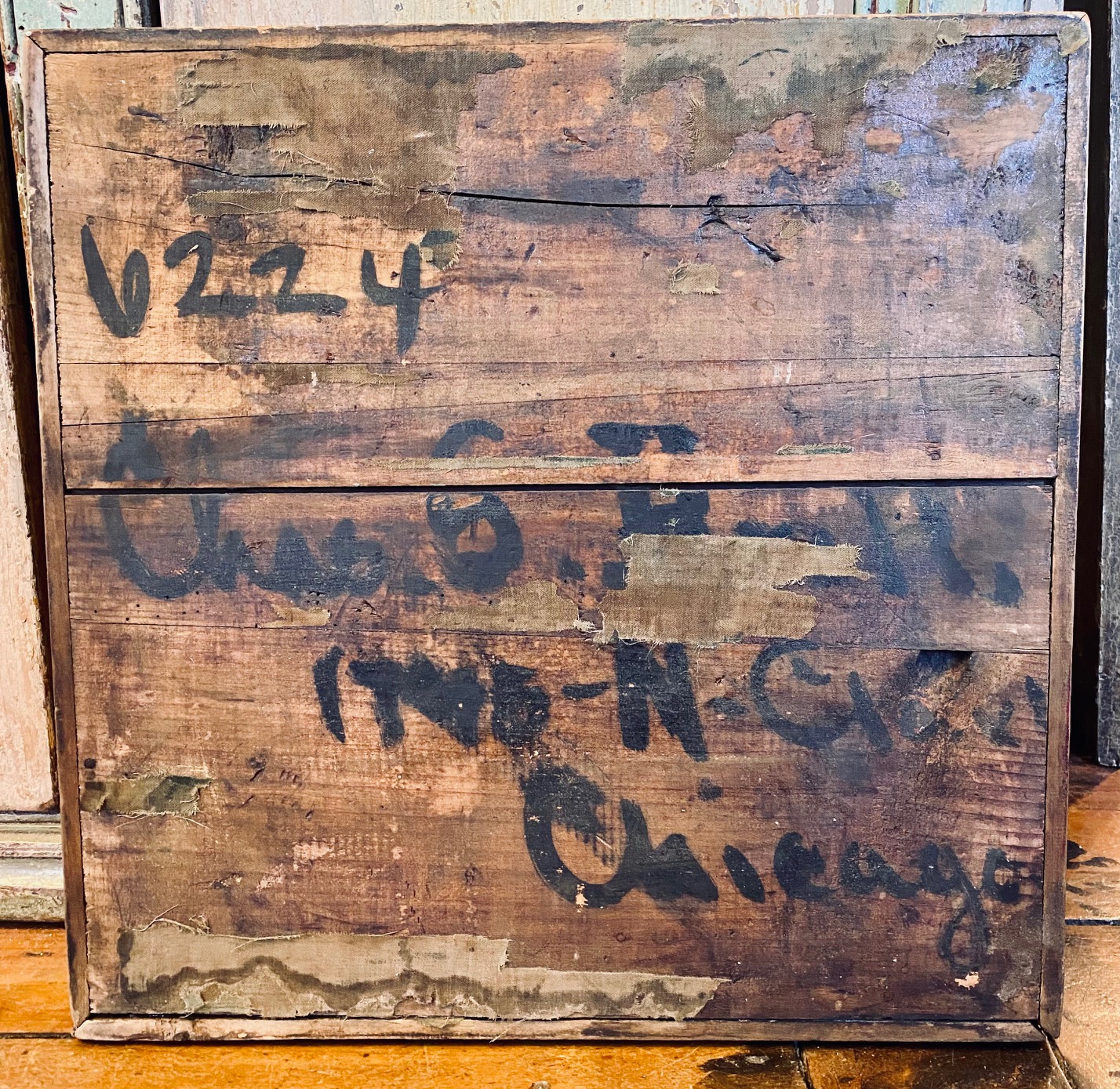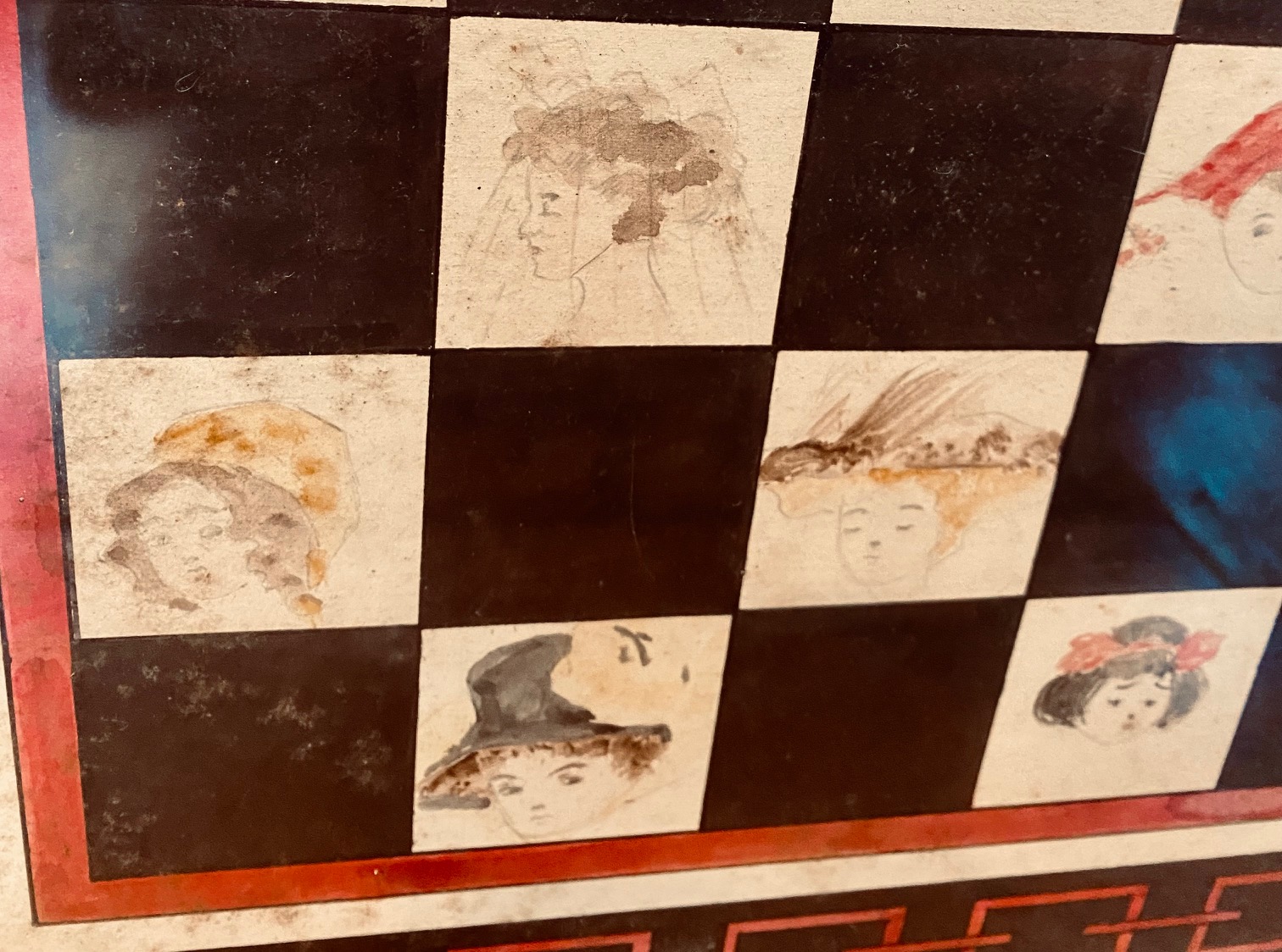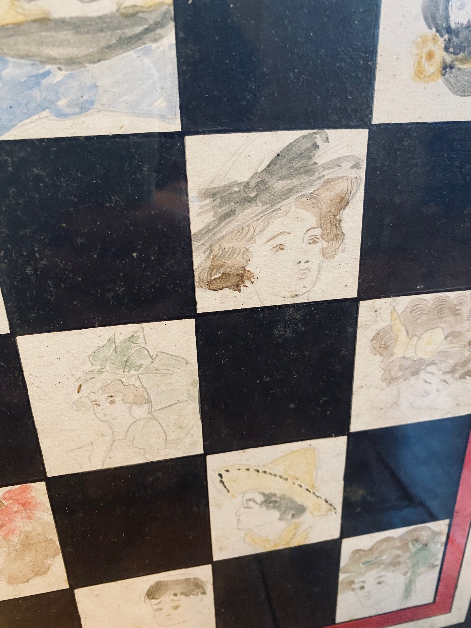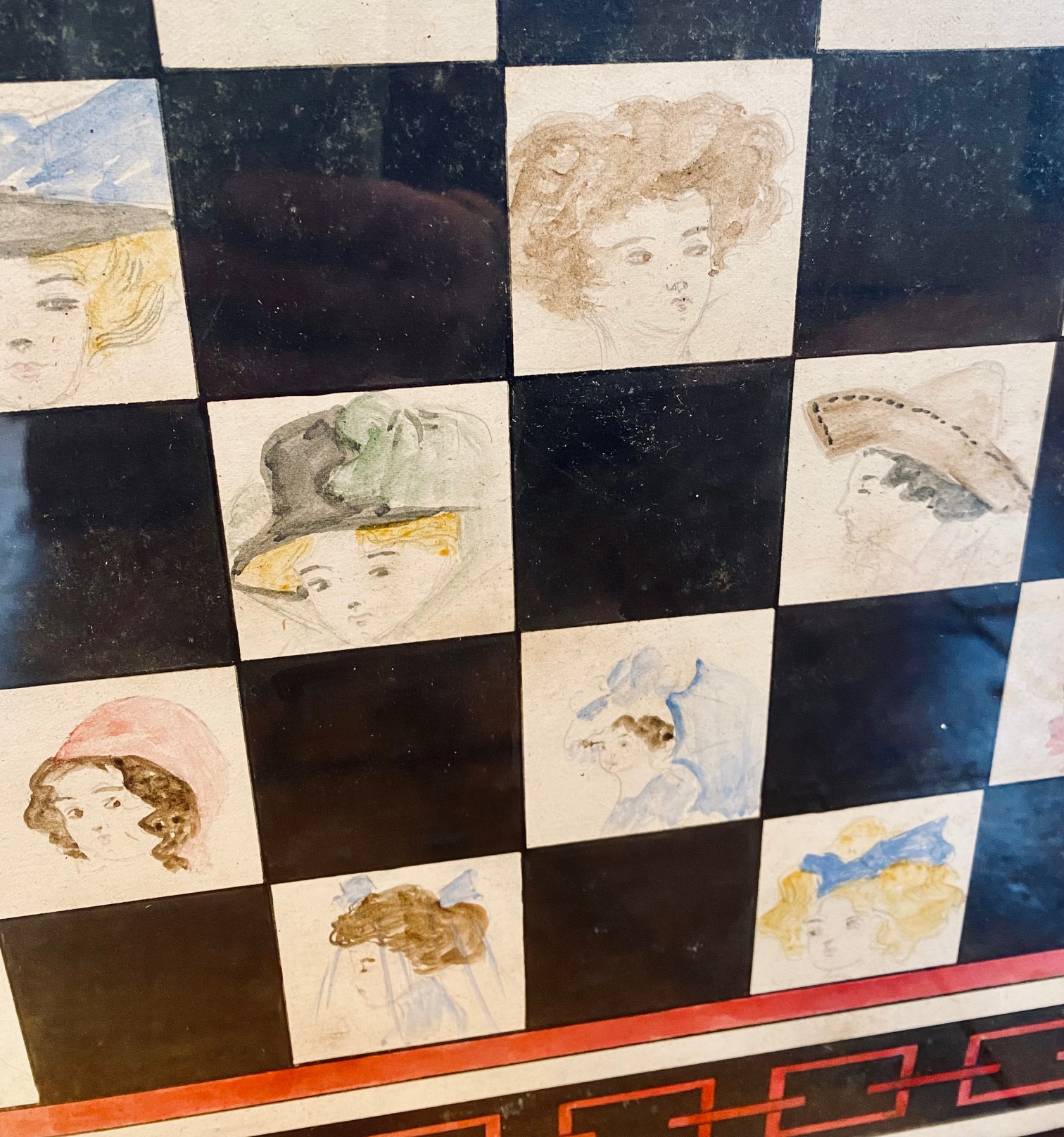 Late 19th Century Hand Made and Decoratively Painted Game Board, circa 1890s to 1910, a checker or chess board with squares individually hand painted with miniature watercolor portraits of different stylish young women… Late Victorian precursors to the Gibson Girls… enclosed within a Chinoiserie chain link border. The thick board is held in a mitered frame, the painted surface protected under a sheet of glass, and with the original rough backboard bearing a handwritten Chicago inscription with partial signature.