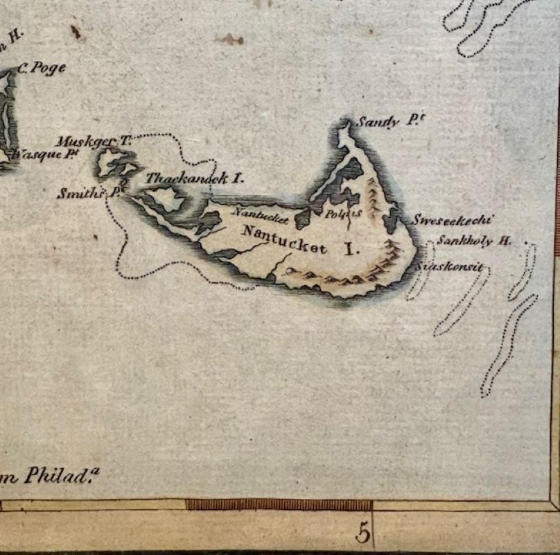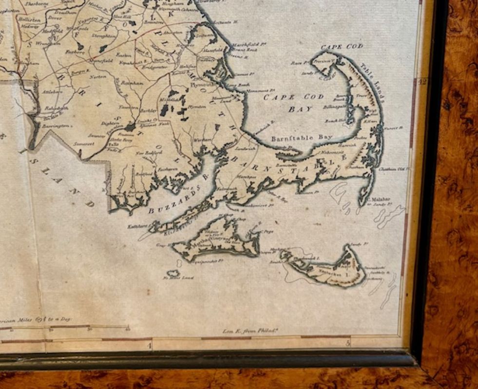 18th Century Hand Colored Map of “The State of Massachusetts from the best information,” 1796, by cartographer and illustrator John Reid published in his “American Atlas,” a period engraved map printed on woven paper, with town and county identifications, rivers, lakes, mountains and coastal details – including our archipelago of Nantucket, Tuckernuck and Muskeget Islands, titled and dated in an oval reserve lower left, and with lovely hand-painted hues that appear to be from the period. The top and bottom margins are calibrated with longitude west from London and east from Philadelphia, respectively.