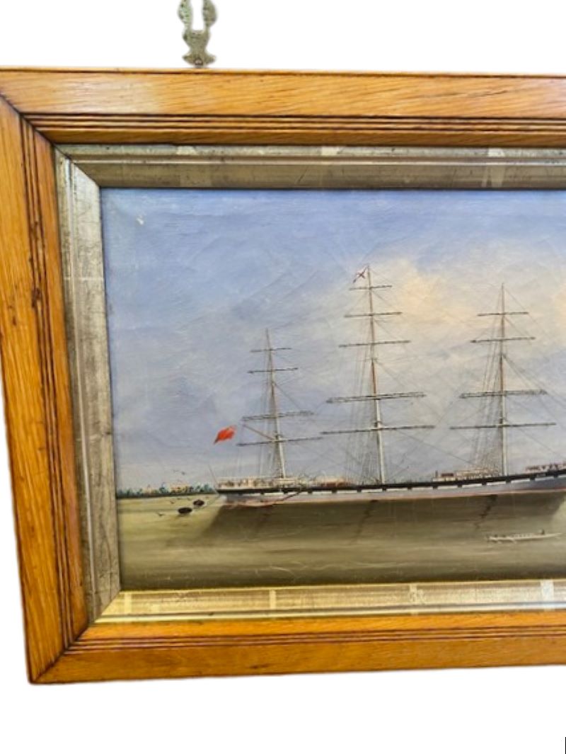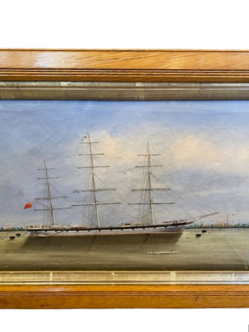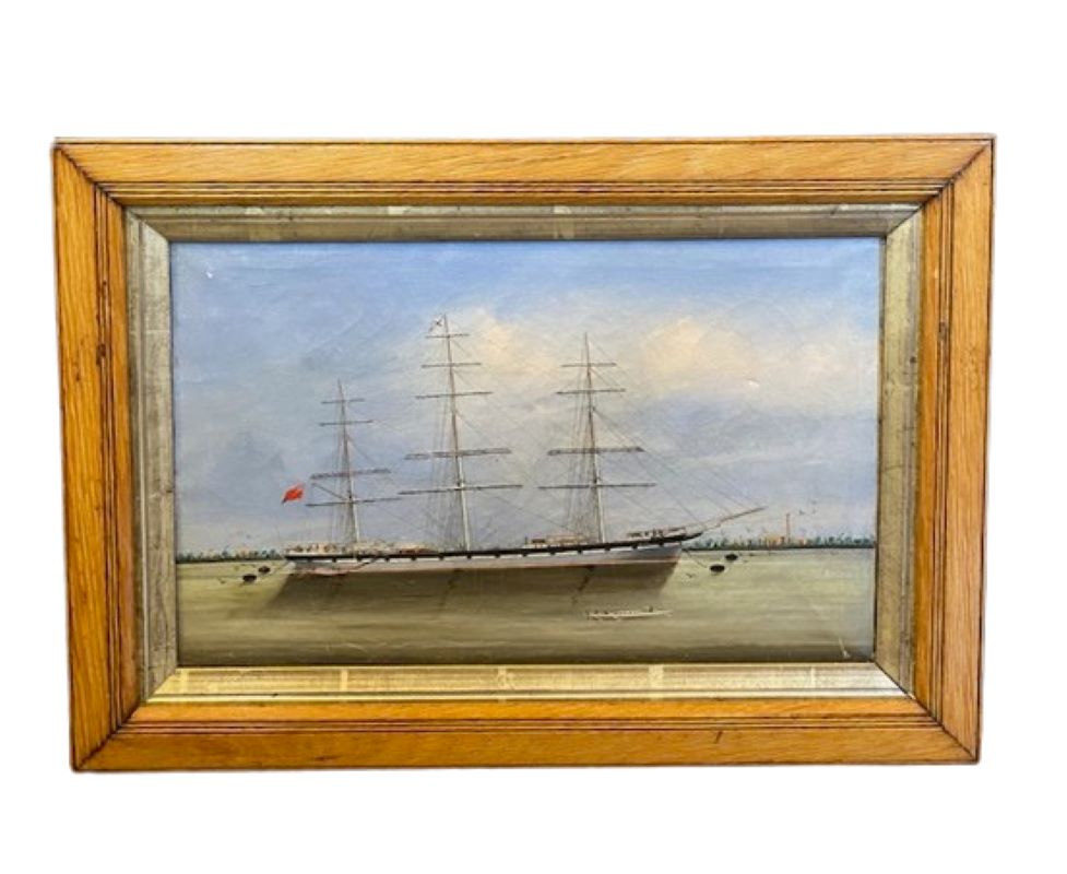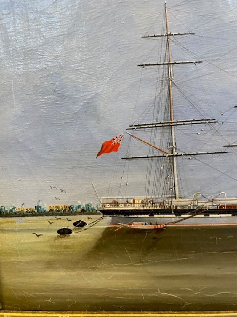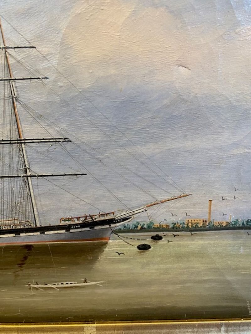 19th Century China Trade Seascape with the Ship Avon at Anchor, by Lai Fong (active: 1875 – 1905), circa 1890, an oil on canvas starboard side view of a square-rigged ship at anchor under furled sails, on placid water with low coastline visible in the background, unsigned. This is one of a series of three paintings by Lai Fong of the Avon offered here.