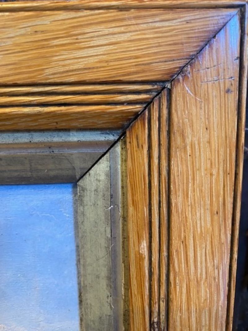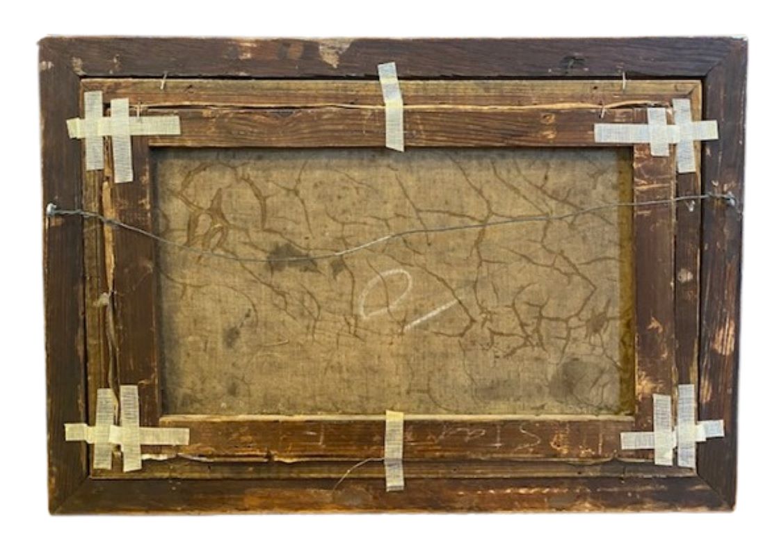 The painting is finely painted in a thin coat on a thin canvas, as is typical with China Port paintings. It has fantastic, precise detail and a lovely serene, soft palette. It remains in very good condition with only a small spot of chipped paint in the upper left and another in the lower right; there is one fingernail sized dent towards the lower right, but no tears or punctures at all. Mounted in the original hardwood frame.