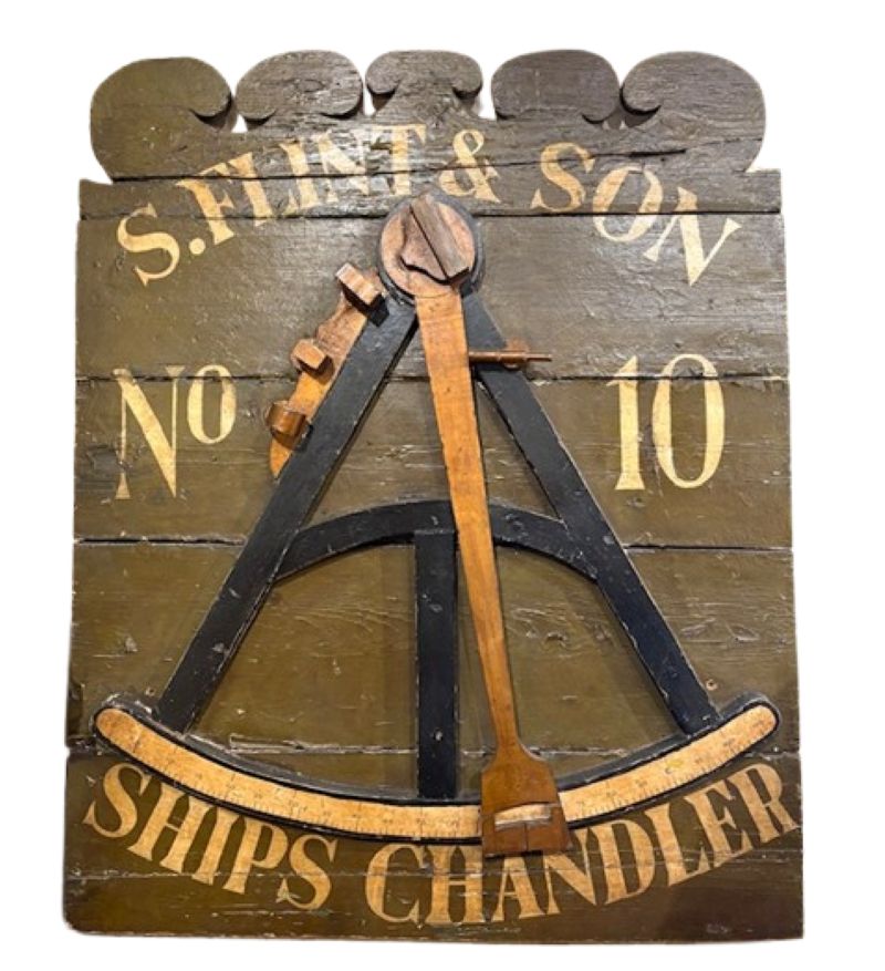 Antique Hand Carved and Decorated Wooden Ship Chandler’s Trade Sign, late 19th Century, a wooden plank sign with applied hand carved navigational sextant, advertising the premises of S. Flint & Son Ship Chandlers.