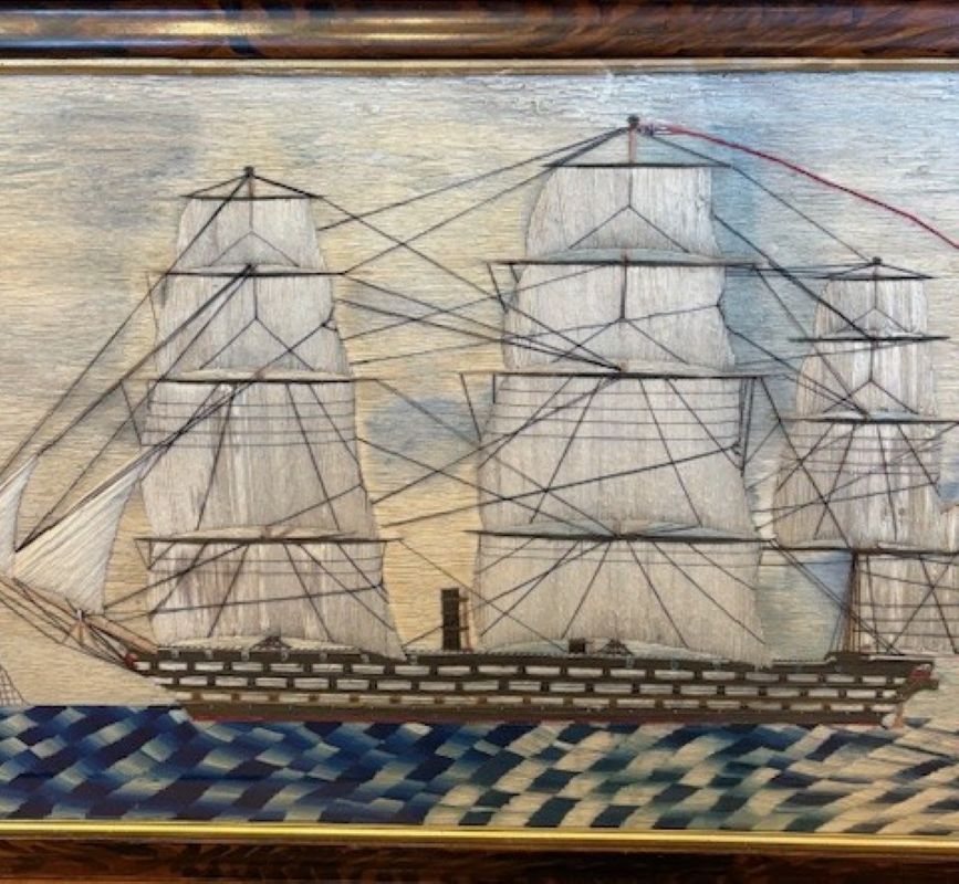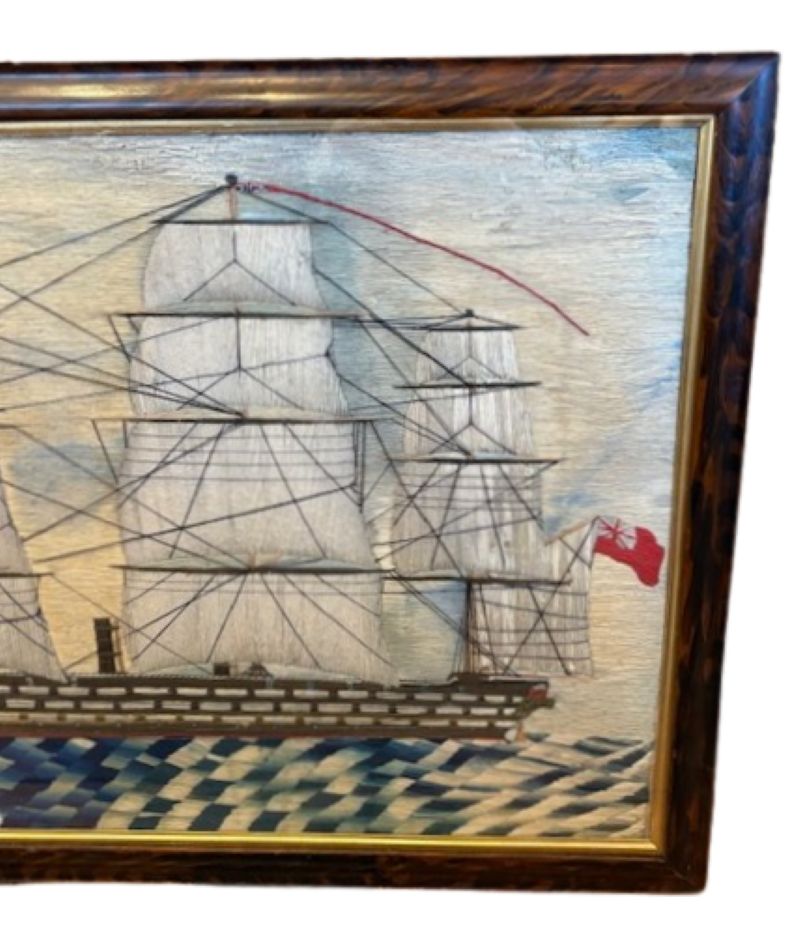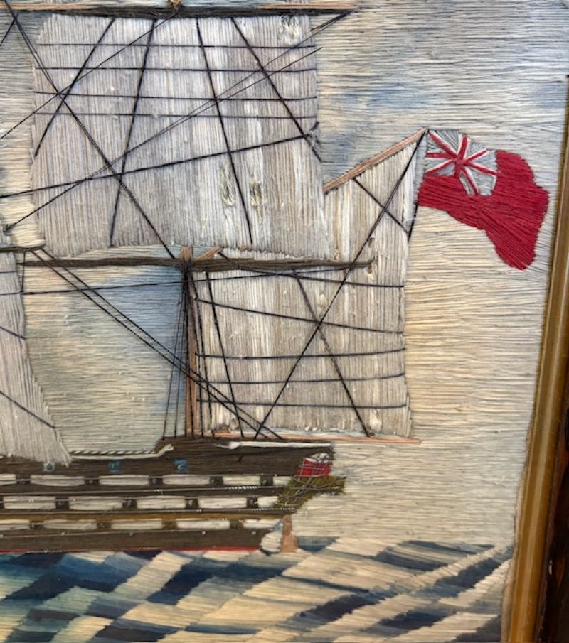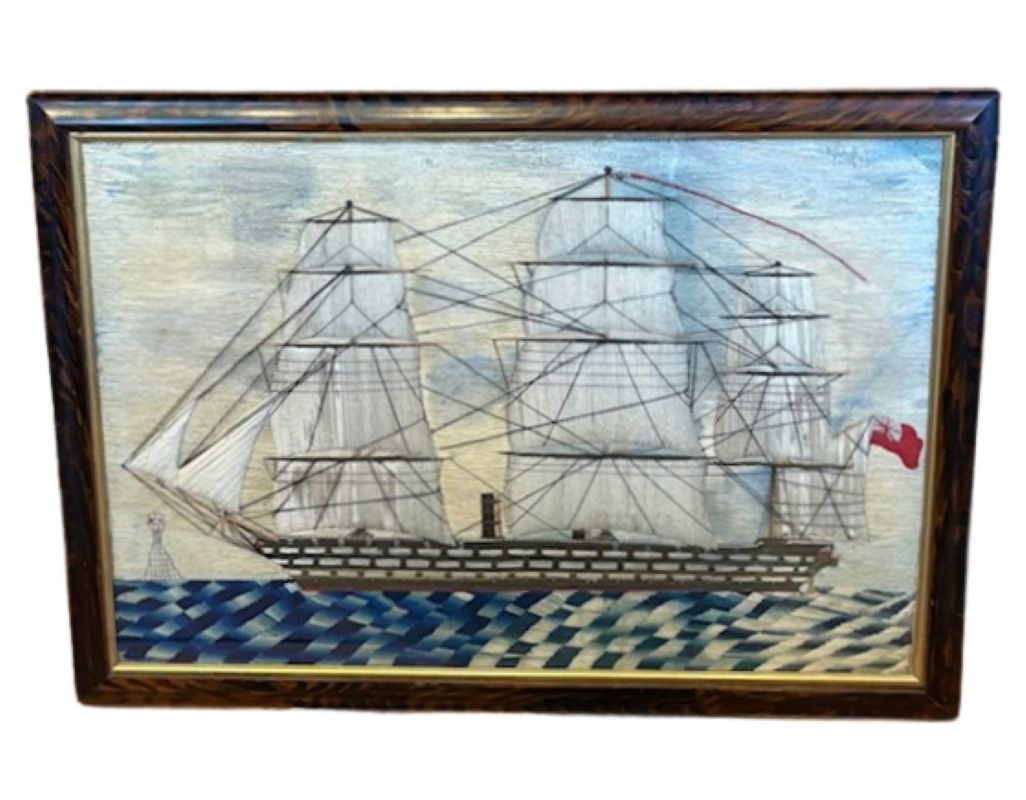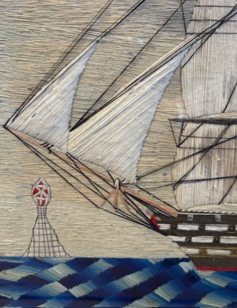 19th Century Large Sailor’s Woolie of a Triple Deck Ship-of-the-Line, circa 1870, an unusually large Sailor’s woolwork picture with a larboard side view of a triple decker Ship-of-the-Line under full sail, no steam despite presence of a smoke stack amidships, flying the Red Ensign at the stern and quite the Admiral’s pennant at the main peak, approaching an off-shore light house on a spectacular checkered sea. Note the well-defined figurehead at the bow, and the use of beads at each gunport and along the waterline, and the use of knots as masthead carvings. Large and unusual… quite the stunner.