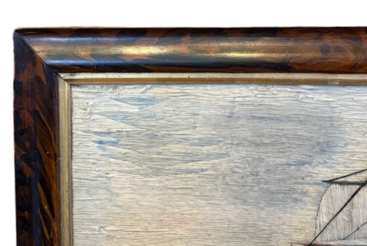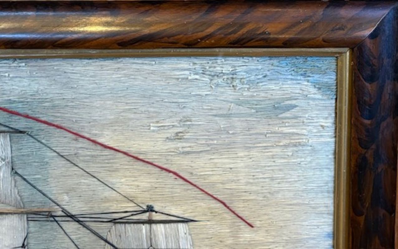 The woolie remains in good condition with very strong colors. There are some pulls to the yarn and a very small amount of old loss, but mostly along the edges and they blend in very well to the texture of the sky and sea. Mounted in a 19th Century burl frame.