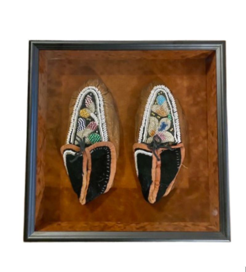 19th Century Pair of Iroquois Moccasins, New York or Ontario, mid to late 19th Century, a worn pair of moccasins with suede bodies, blue trade cloth tops with red trade cloth border, decorated with glass bead floral design and white seed bead borders; mounted in a custom fabric-lined shadowbox with ebonized frame.