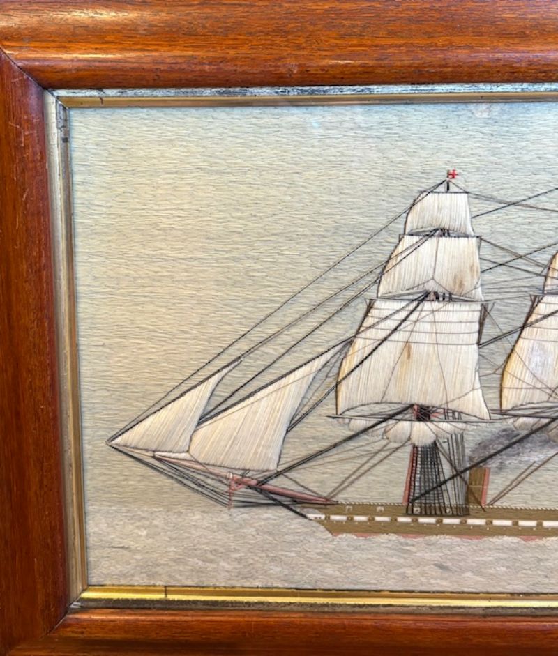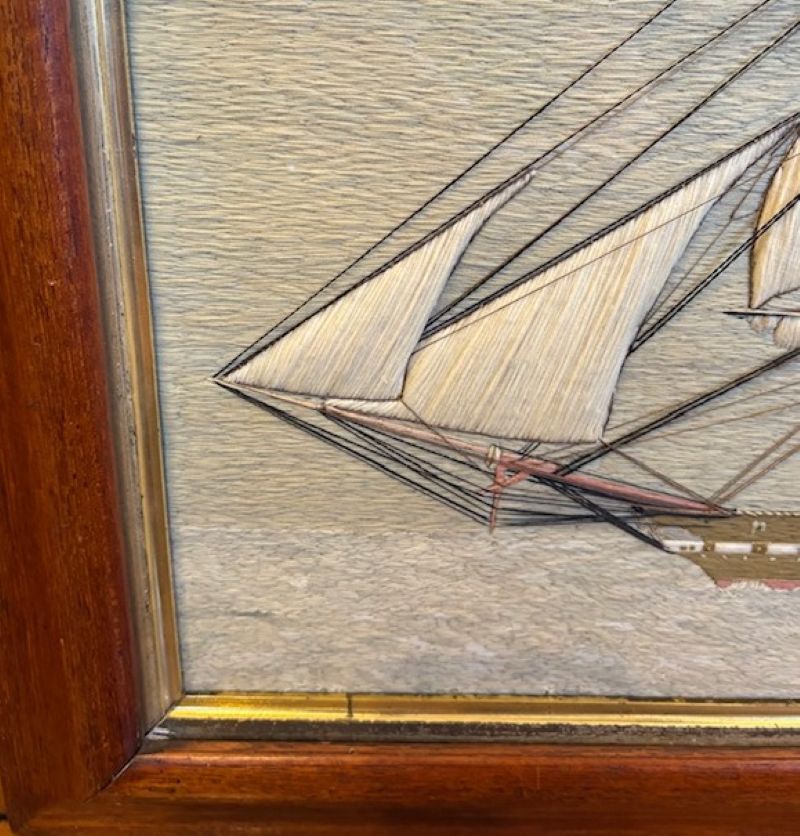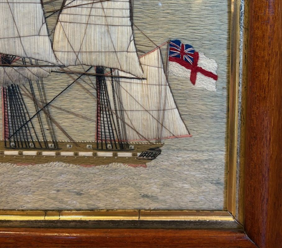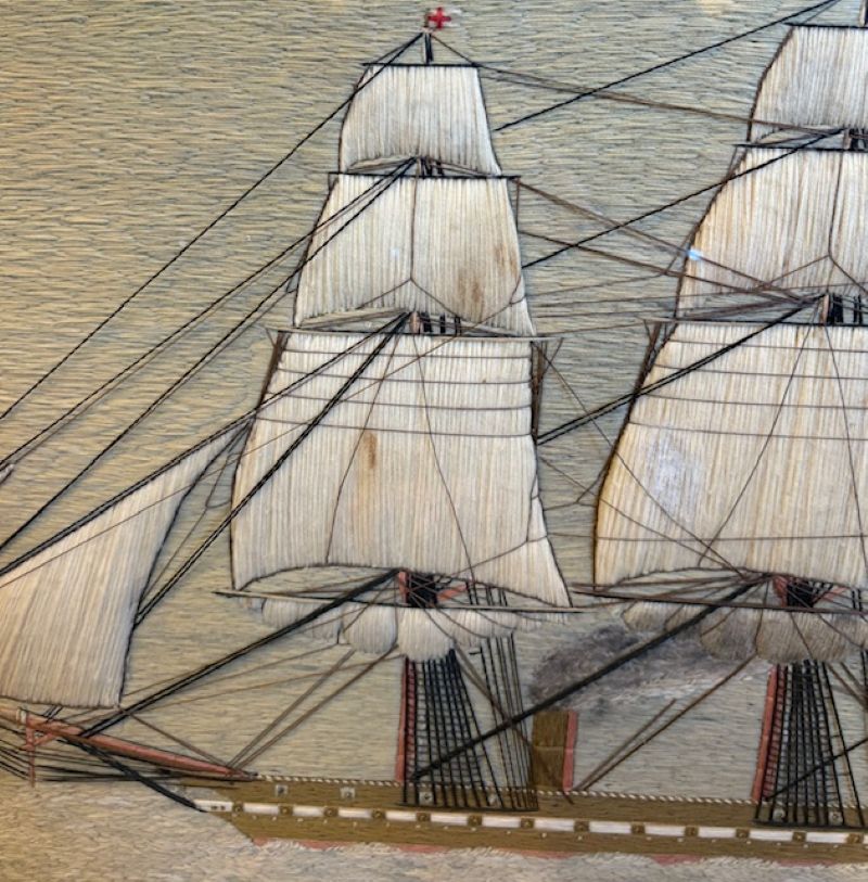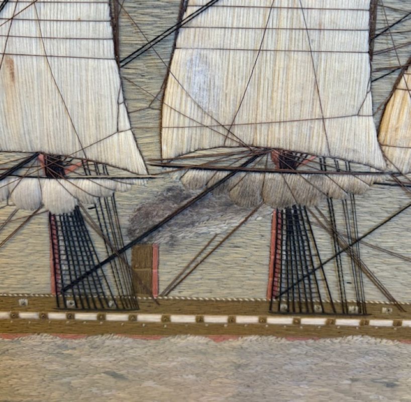 19th Century Sailor’s Woolie of a British Steam Frigate, circa 1850, a hand crafted sailor’s woolwork picture with larboard side view of a British Naval Auxiliary Steam Frigate under full sail, fore and main coarses furled, smoke billowing from stack (note the sooty discoloration on the furled mainsail, flying the Ensign of the White Fleet at the stern, Admiral’s pennant at the main peak, and burgees at all mastheads, on a subtle but very sophisticated blue-green ocean done in very complex stitches, and under a calm pastel sky. The sailor depicted complex and detailed rigging, and used quite a large variety of very accomplished stitches throughout.