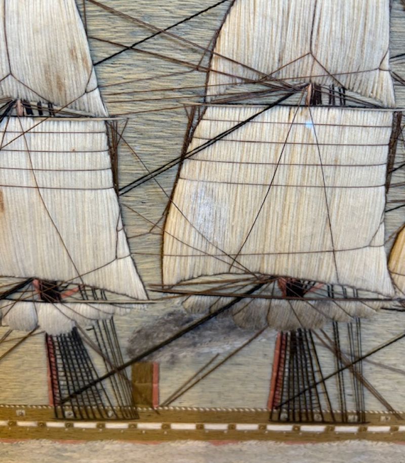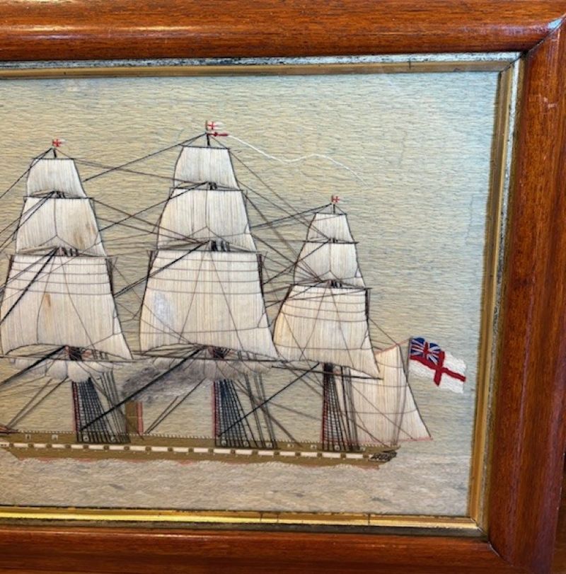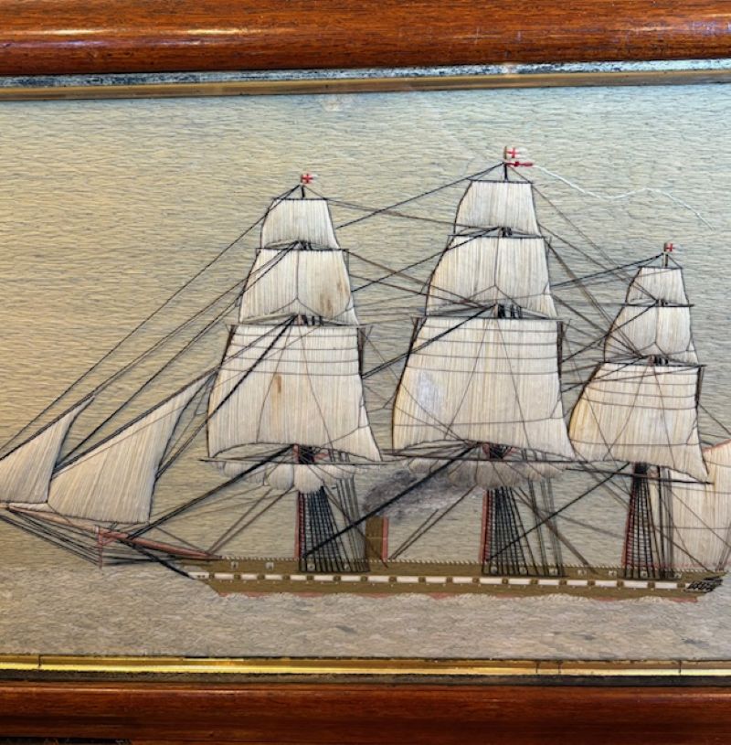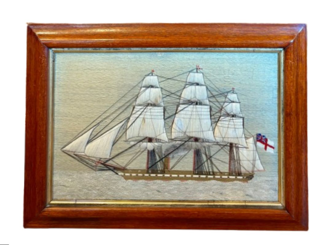 19th Century Sailor’s Woolie of a British Steam Frigate, circa 1850, a hand crafted sailor’s woolwork picture with larboard side view of a British Naval Auxiliary Steam Frigate under full sail, fore and main coarses furled, smoke billowing from stack (note the sooty discoloration on the furled mainsail, flying the Ensign of the White Fleet at the stern, Admiral’s pennant at the main peak, and burgees at all mastheads, on a subtle but very sophisticated blue-green ocean done in very complex stitches, and under a calm pastel sky. The sailor depicted complex and detailed rigging, and used quite a large variety of very accomplished stitches throughout.