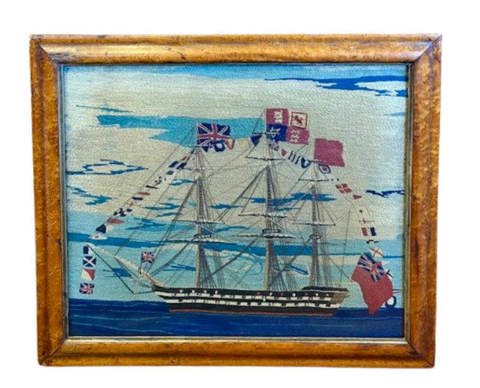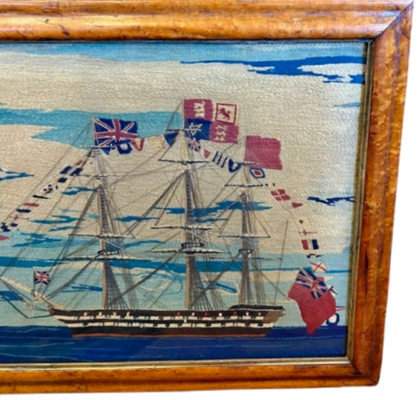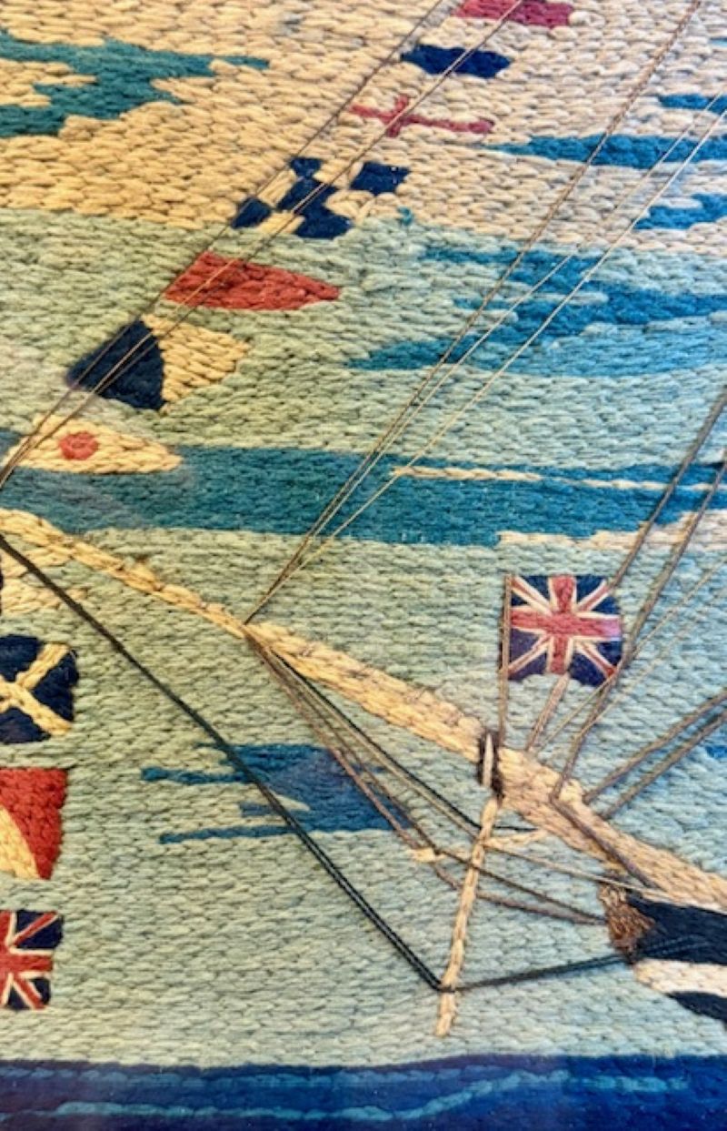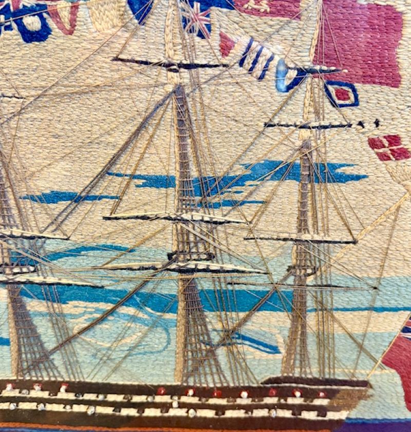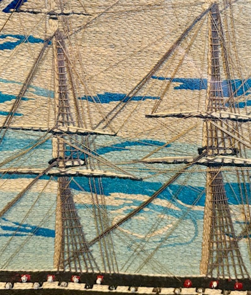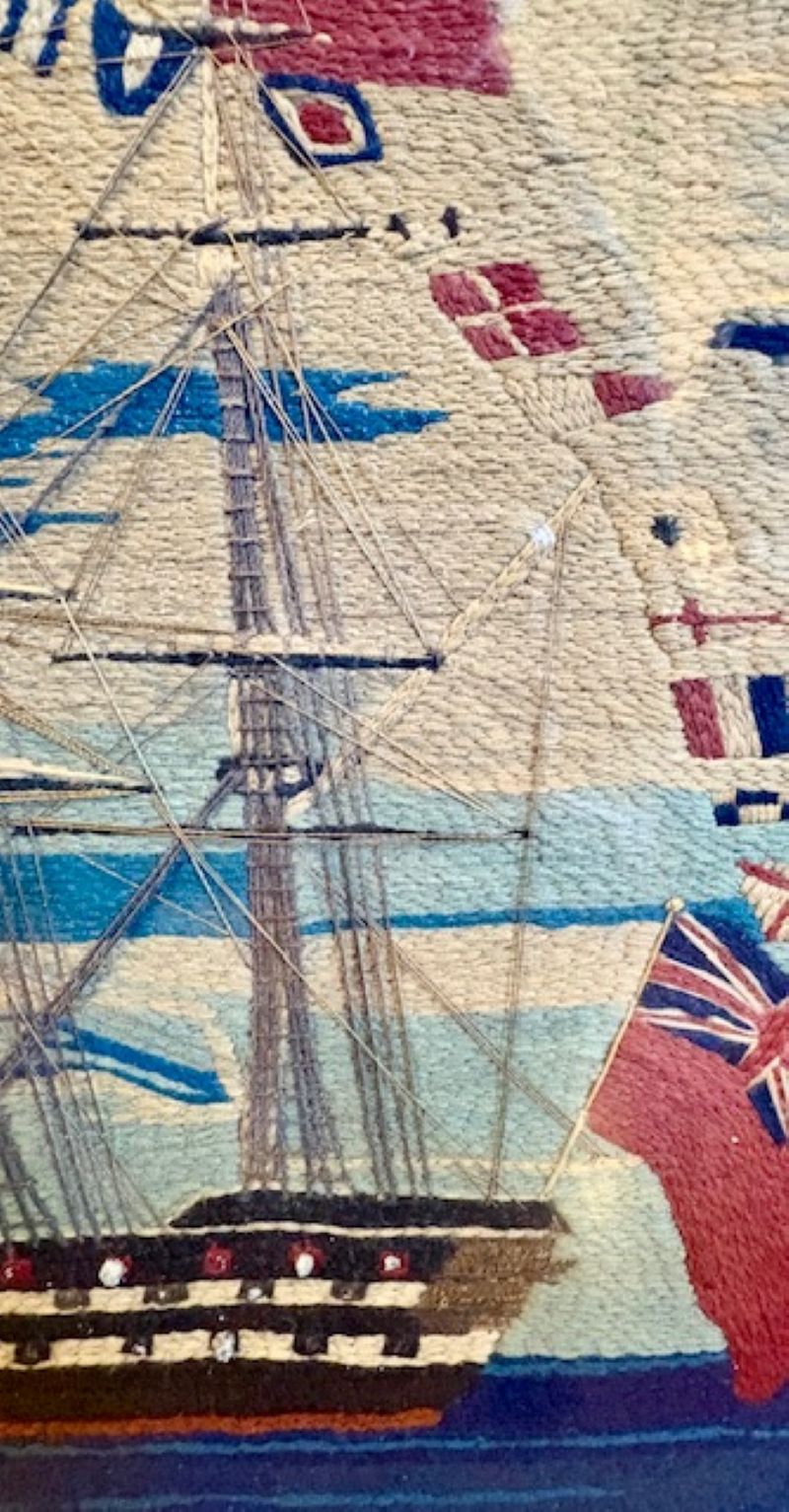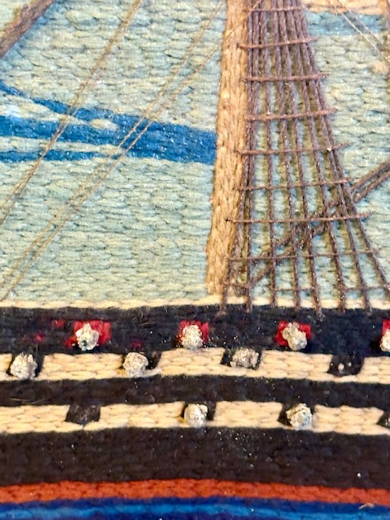This is an exceptional woolie expertly crafted with a variety of short, very short, cable, long and curved stitches. the tight and precise work is stunning. The detail to the rigging is complex and accurate. The gun barrels protruding from gunports are actually head knots. This is a top notch woolwork and by far the finest and most sophisticated we have ever had.