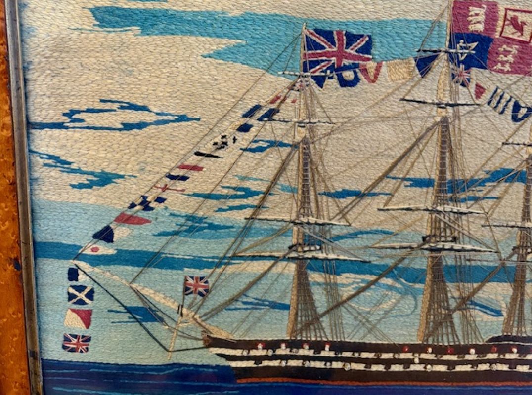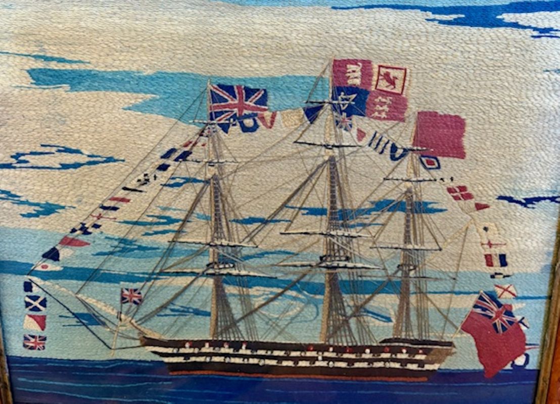 19th Century Sailor’s Woolie of Flag-Bedecked Triple Decker Ship of the Line, circa 1850