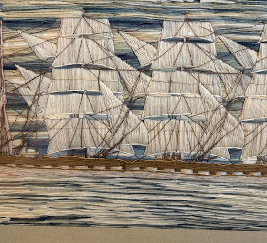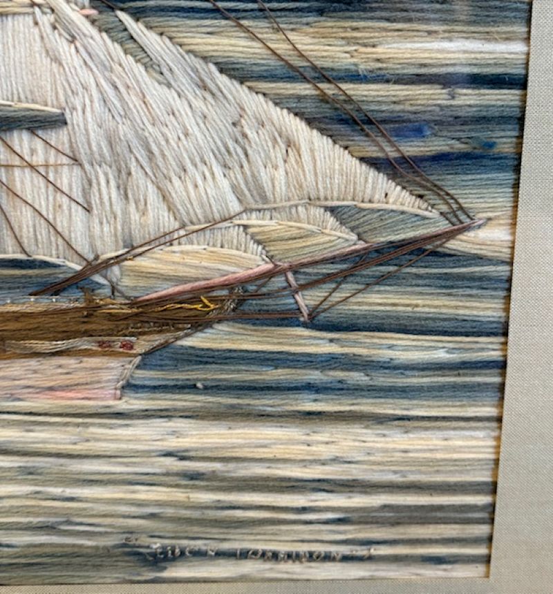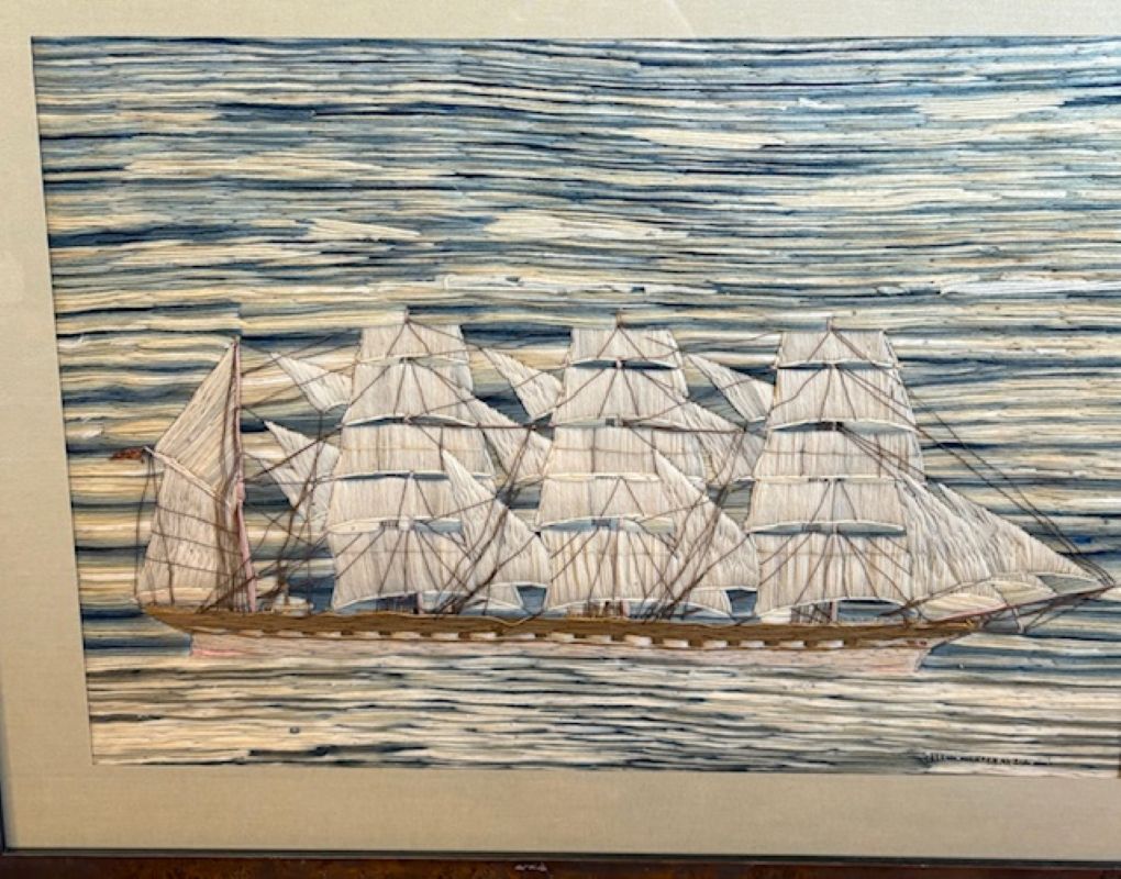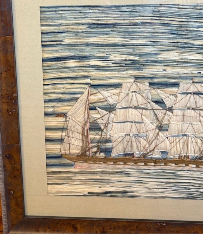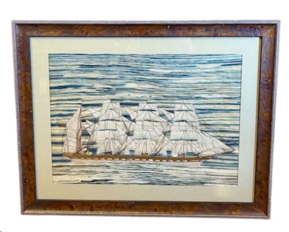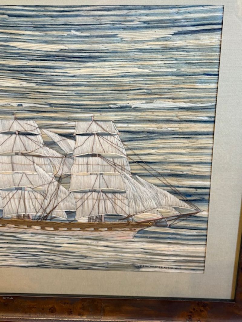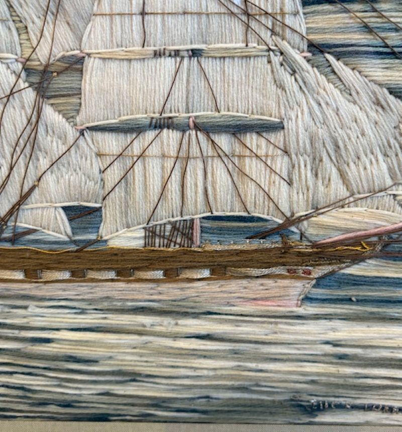 19th Century Sailor’s Woolie of the Four Masted Bark Loch Torridon, circa 1880, a sailor’s hand-crafted woolwork picture with a starboard side view of the Four Masted Bark Rigged Clipper Ship Loch Torridon, with all sails (even stuns’ls) set, pennant flying astern, and a figurehead mounted under the extreme clipper bow, set against a wild variegated sea and sky. The image was worked in mostly long stitches, with silk or mercantile cotton line used along the gunnel and false gunports, and pink highlights on the hull, bowsprit and fourth mast and gaff.
