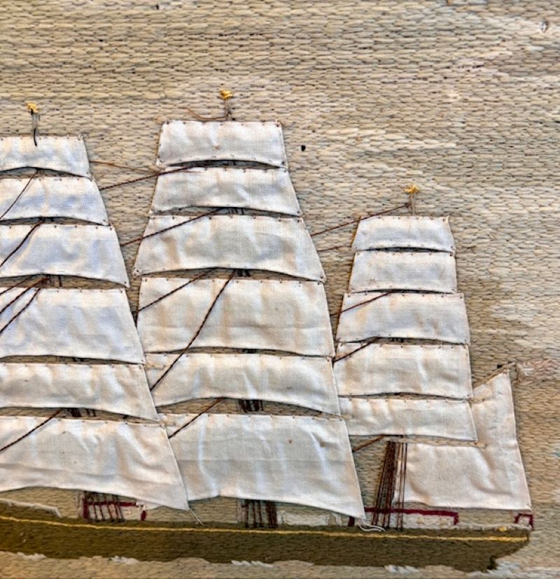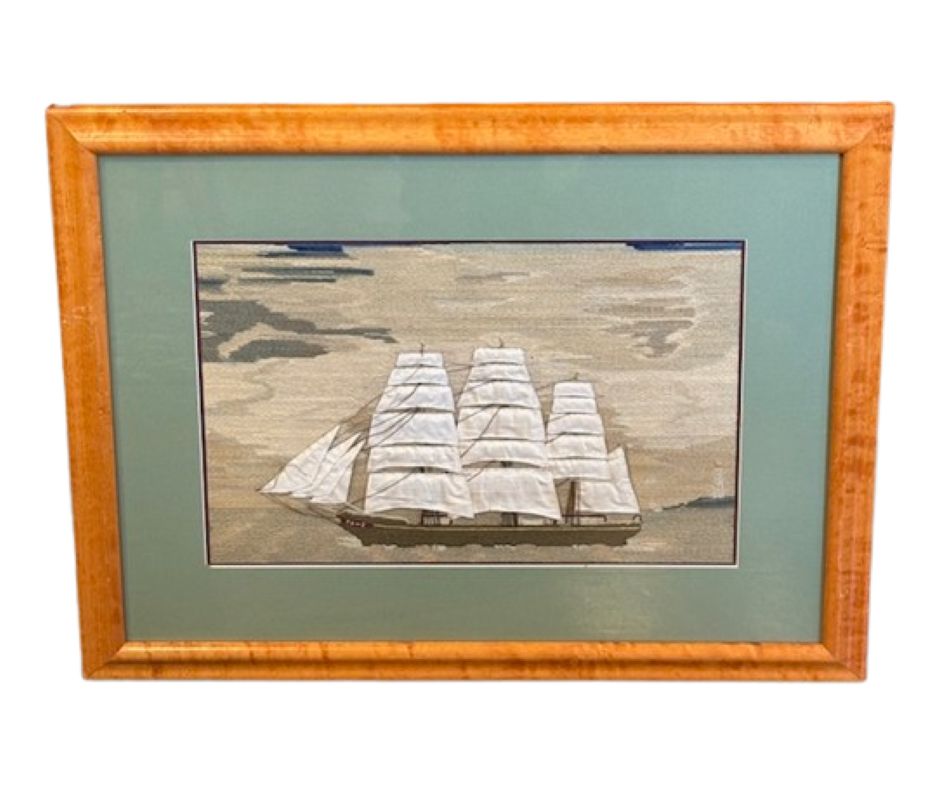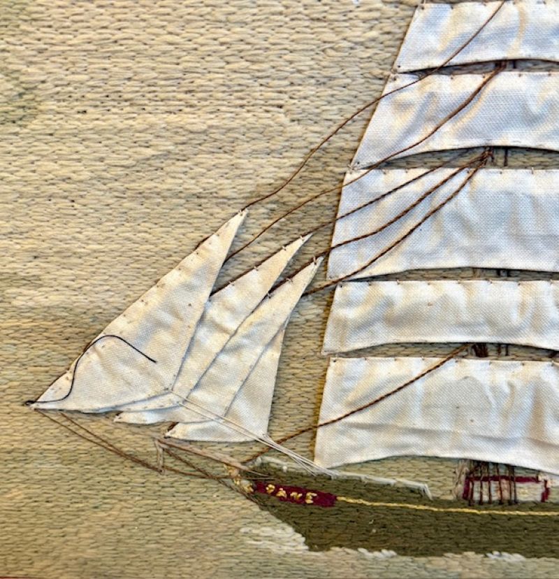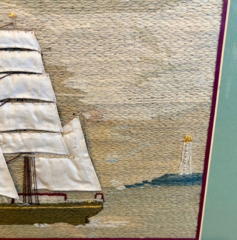 Early to Mid 19th Century Sailor’s Woolie of the Merchant Ship JANE Under Full Sail, circa 1840s, a hand-crafted sailor’s woolwork picture depicting a larboard side view of fully rigged clipper ship with British ensign flying off the spanker gaff, passing a lighthouse astern, on tranquil sea under neat cloudy sky. The woolie was constructed in the early manner of all short stitches and unusual in the use of cable stitches. The use of linen panels for the snowy white sails is stylish and also very unusual.