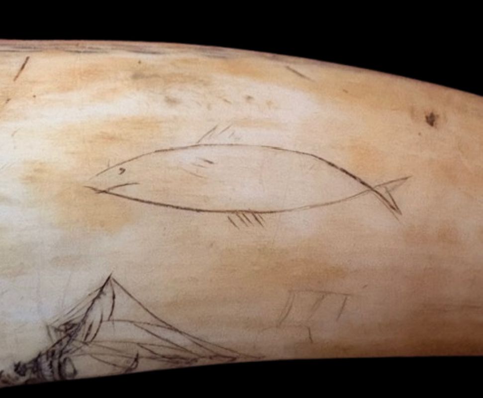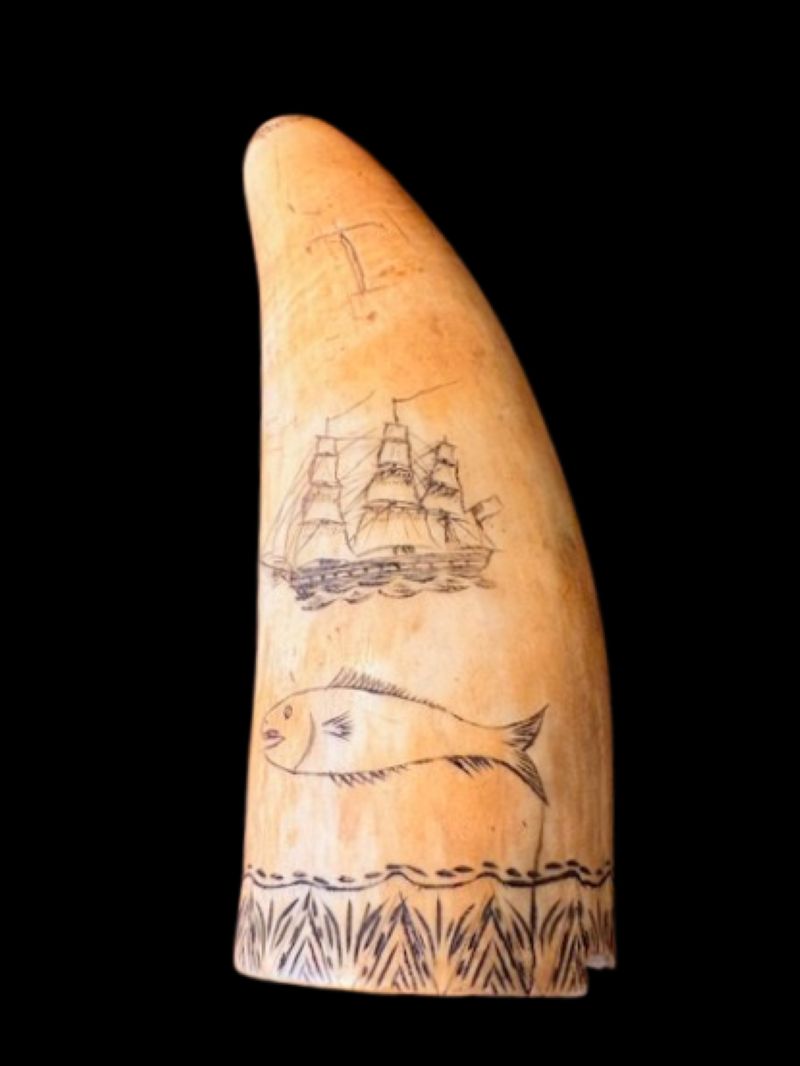 19th Century Scrimshaw Whale Tooth with Ship, Fish and More!