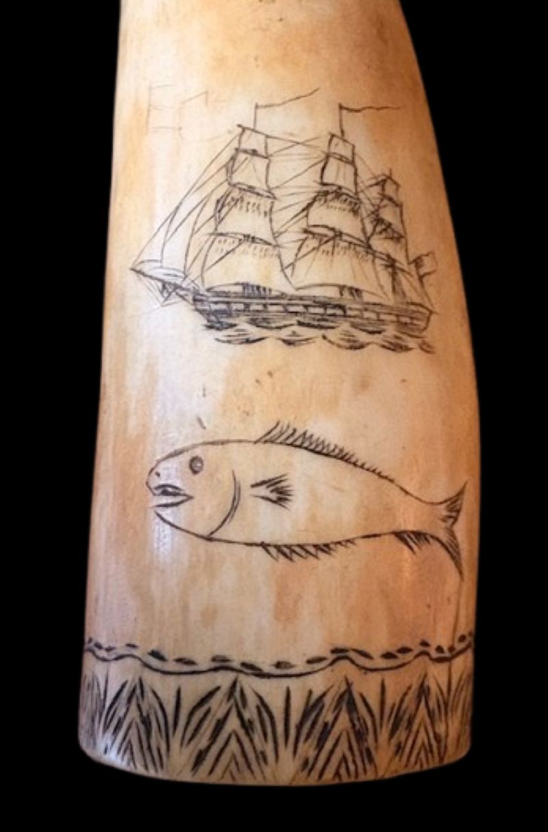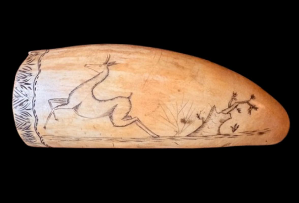 19th Century Scrimshaw Whale Tooth with Ship, Fish and More! A sailor’s scrimshaw sperm whale tooth (Physeter macrocephalon), circa 1850, with well done hand engraved image of a Ship flying American Flag, above a Fish, signed with the intial “T” at the top; the reverse having a Pronghorn Antelope leaping in a landscape; hiding at the tip of the tooth is a wild image of a Sailor’s Face; there is a second fish along one edge and a strong wrap-around border at the base.