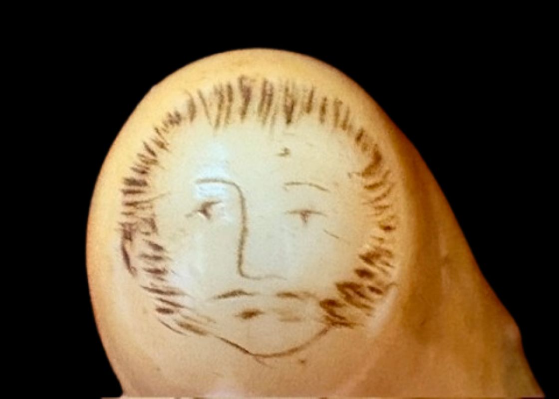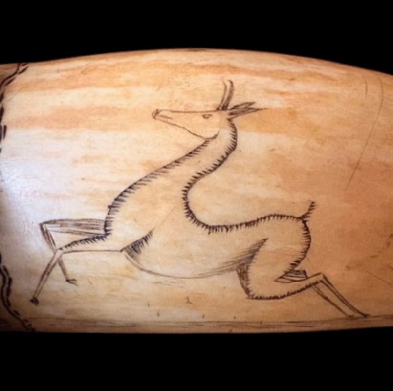 19th Century Scrimshaw Whale Tooth with Ship, Fish and More! A sailor’s scrimshaw sperm whale tooth (Physeter macrocephalon), circa 1850, with well done hand engraved image of a Ship flying American Flag, above a Fish, signed with the intial “T” at the top; the reverse having a Pronghorn Antelope leaping in a landscape; hiding at the tip of the tooth is a wild image of a Sailor’s Face; there is a second fish along one edge and a strong wrap-around border at the base. This is a very well executed tooth with surprises. At a guess this could well have been done by a sailor who deserted his whaling ship to join the ’49ers (thus that very unusual image of a Pronghorn Antelope in a high desert landscape that could be met in the Northern California mountain gold fields).