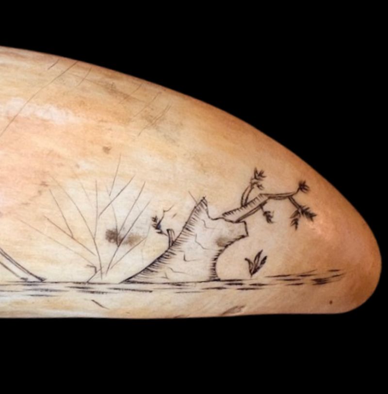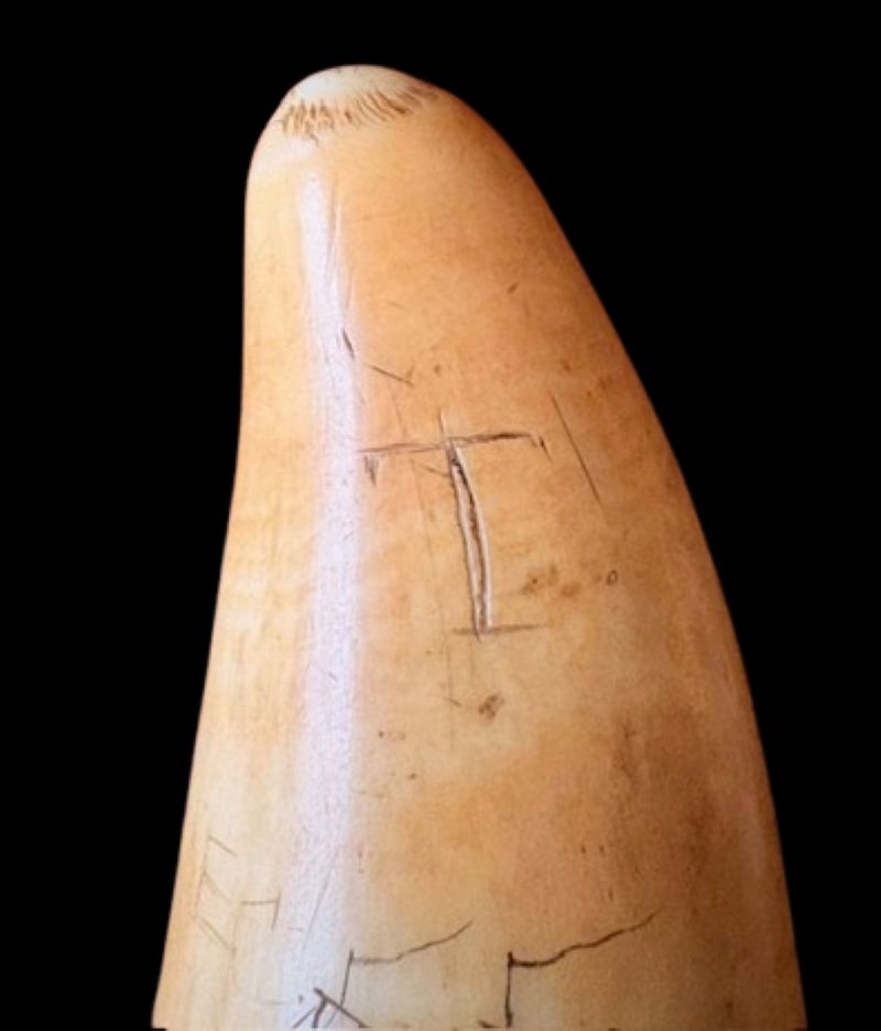 This piece of antique sailor’s folk art is engraved on a tooth from a sperm whale (Physeter macrocephalus), is well over 100 years old, and is in full compliance with federal law as specified in the Marine Mammal Protection Act (1972), Endangered Species Act (1973), and the U.S. Fish & Wildlife Director’s Order No. 210 (as amended 2014).