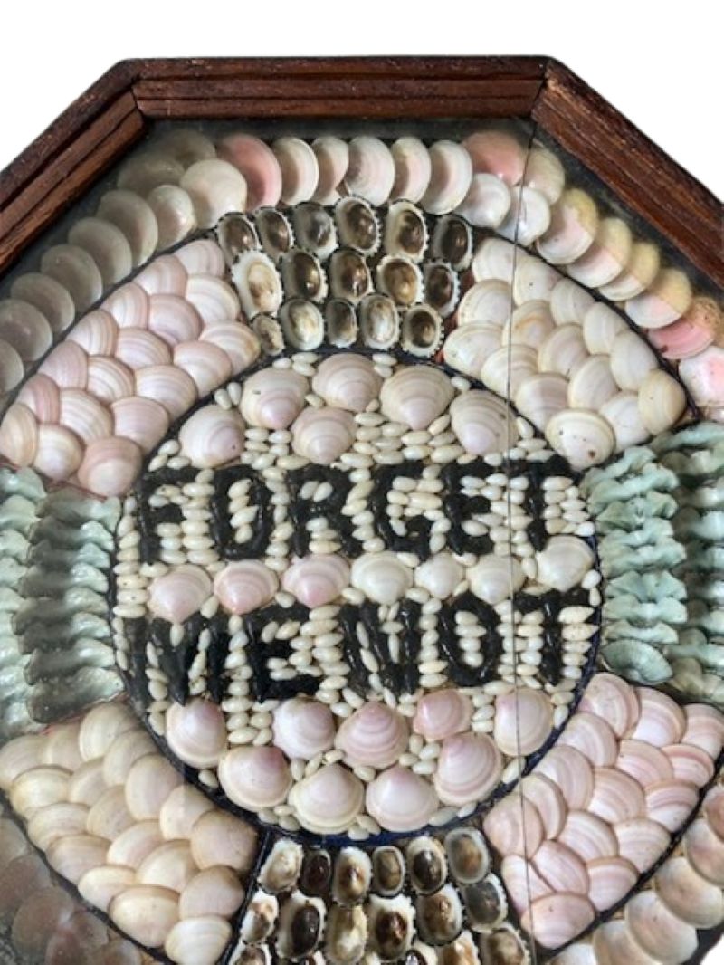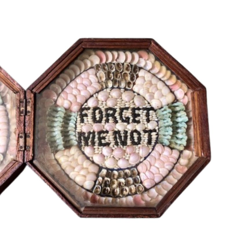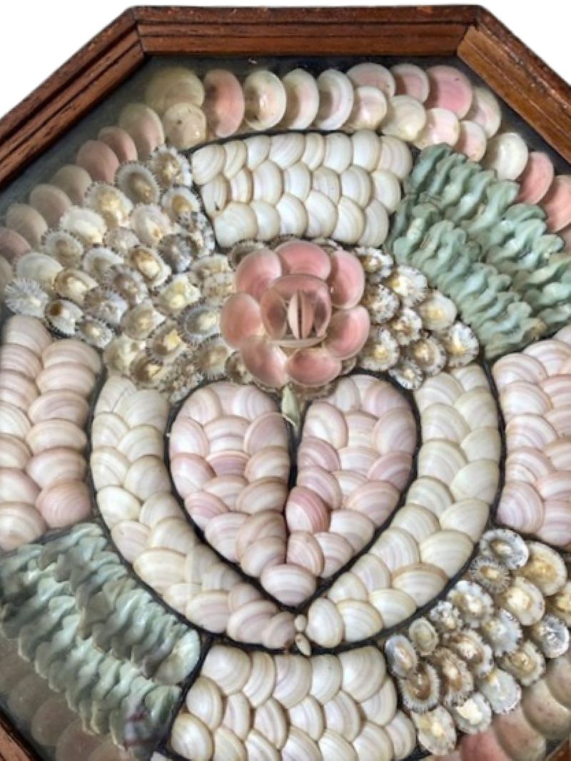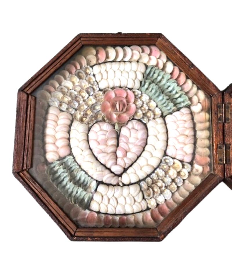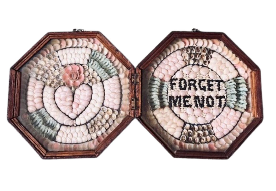 Originally made between 1830 and 1890, these “valentines” are composed of hundreds of small sea shells of various colors glued onto a backing in intricate symmetrical designs which often feature a centerpiece such as a compass rose or a heart, or a motto or sentimental message such as Love, Forget Me Not or Home Again spelt out in shells; the valentines are typically mounted in octagonal glazed cases varying from 8 to 20 inches in diameter, often hinged together as double cases.