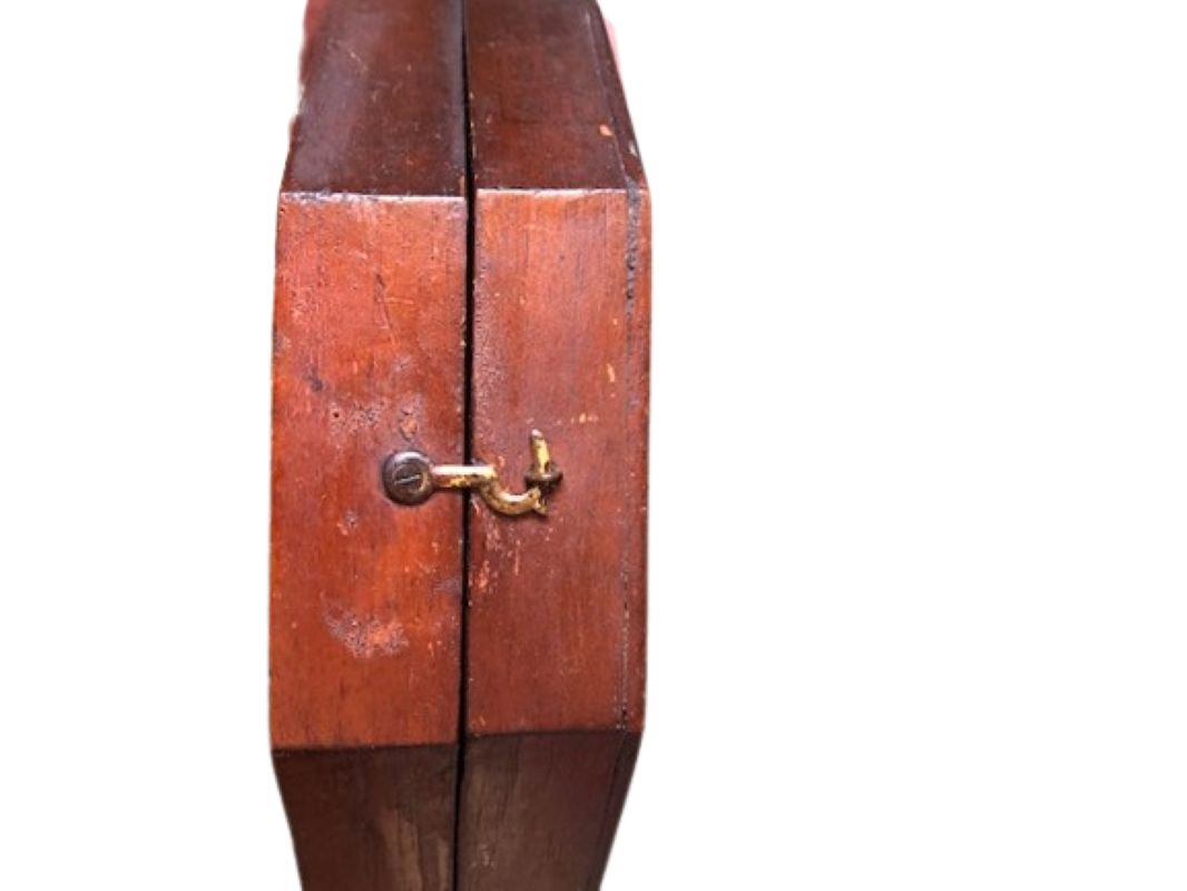 Antique Double Sailor’s Valentine, Signed and Dated “Barbados, 1915,” a pair of handcrafted shell collages mounted in mahogany octagonal shadowboxes, hinged together and mounted with a clasp, and also two hook eyes for hanging. This valentine features on one side a heart and rose pattern, and on the other side the inscription “Forget Me Not.” The case is hand inscribed on the side “Barbados, July 30th 1915.”