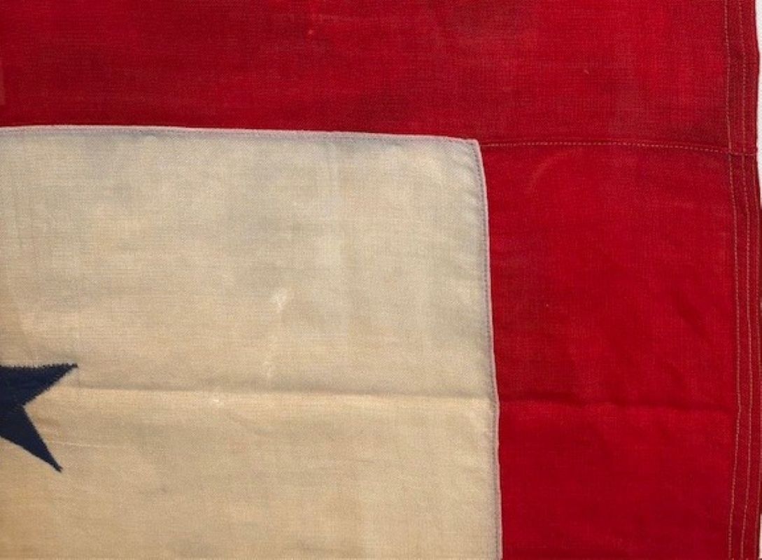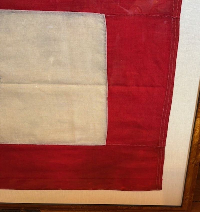The flag is structurally sound and in good condition, but does show its wonderful age in subtle fading, slight staining, and a few holes mostly along the top margin. Mounted in a new bird’s eye maple frame.