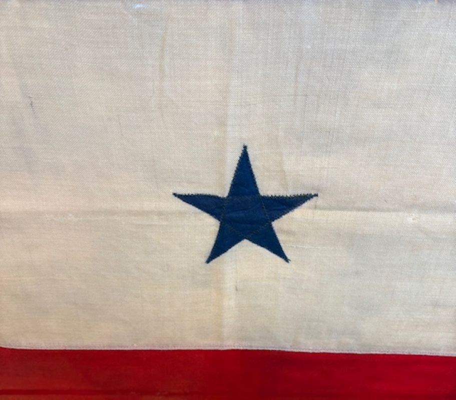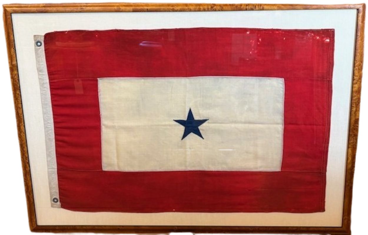 This flag was designed and patented by retired Army Captain Robert Queisser of the Ohio National guard, who wished to honor his sons who were serving in the trenches in the world war. Although not an official flag sanctioned by congress or the military, the flag became immediately popular and was flown by many families across the country. It preceded the better known Gold Star Flag honoring family members lost in service. This Size flag was intended to be displayed in one’s home window rather than flying on a pole.