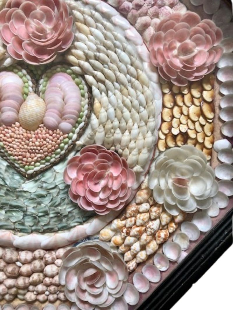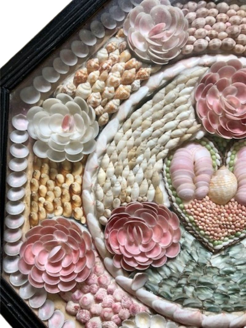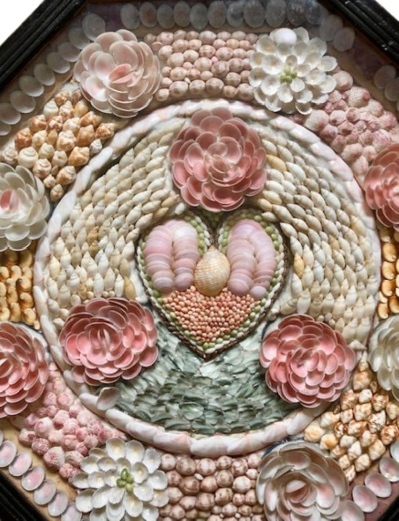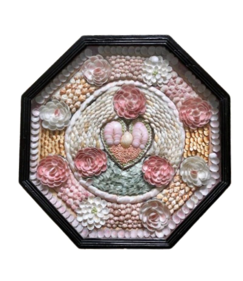 Originally made between 1830 and 1890, these “valentines” are composed of hundreds of small sea shells of various colors glued onto a backing in intricate symmetrical designs which often feature a centerpiece such as a compass rose or a heart, or a motto or sentimental message such as Love, Forget Me Not or Home Again spelt out in shells; the valentines are typically mounted in octagonal glazed cases varying from 8 to 20 inches in diameter, often hinged together as double cases.