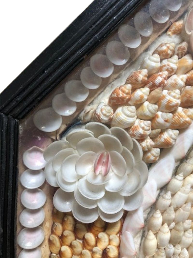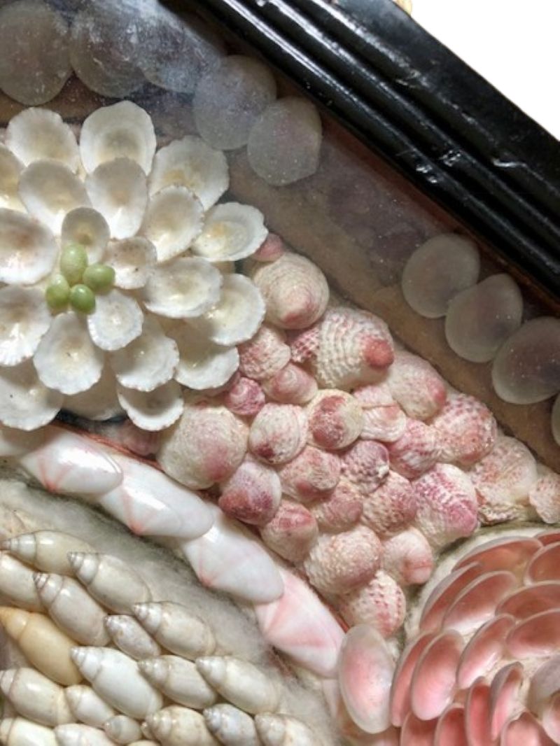 Victorians in the Age of Exploration and its accompanying Eclectic Movement embraced arts and crafts from around the world. Shell boxes are frequently seen, and even the odd shell diorama, shell constructed flower basket or bowl, or even a shell adorned piece of furniture. Much more elaborate and sophisticated, and prized, are the elaborate pictures made of various seashells mounted in a frame which became known as Sailor’s Valentines.