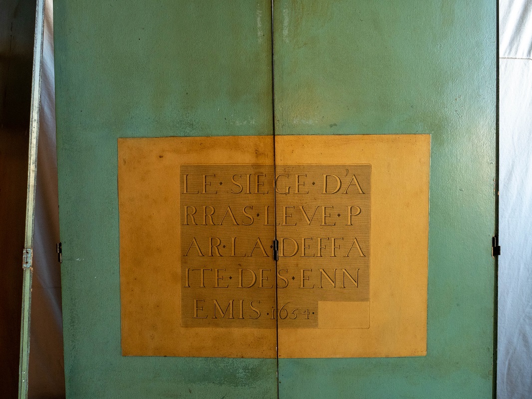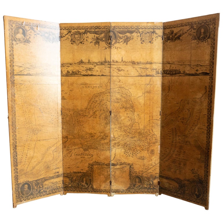 Antique Louis XIV Siege of Arras Floor Screen, 19th Century, a four panel screen with paper lithograph laid down on wooden panels, depicting the schematic plan of battle and landscape of a decisive battle in the Franco-Spanish War during the reign of the Sun King Louis XIV.: the front depicts the garrison, encampments, positions, lines of battle, and portraits of the various principles involved; the reverse bears a cartouche with descriptive title. The Battle of Arras was fought on August 25, 1654, and was a victory of a French army under Turenne against a Spanish army commanded by Don Ferdinand de Salis and the Prince de Condé.