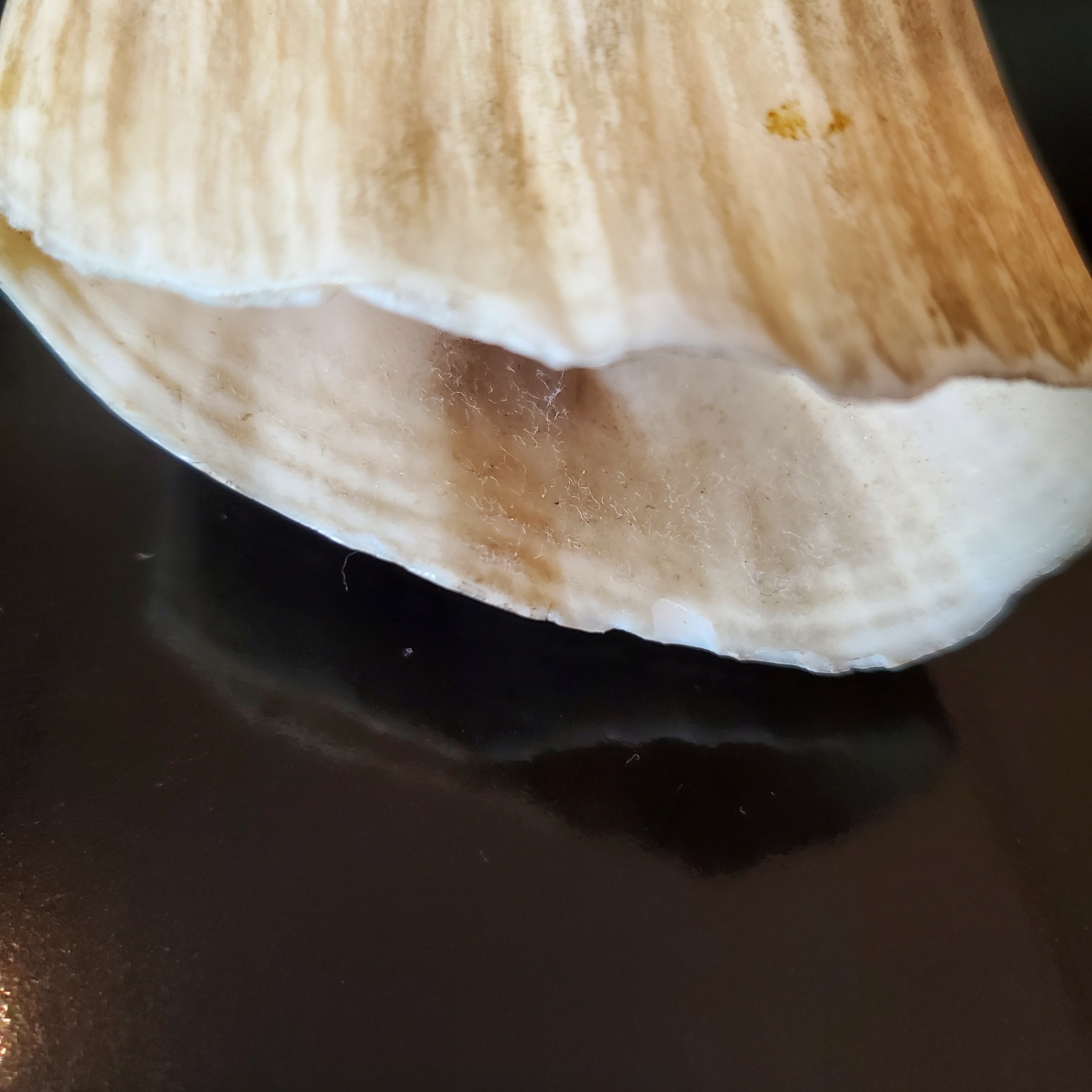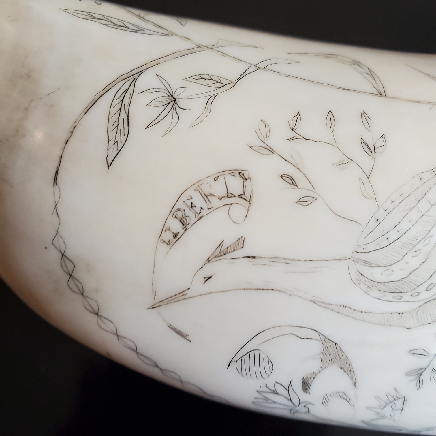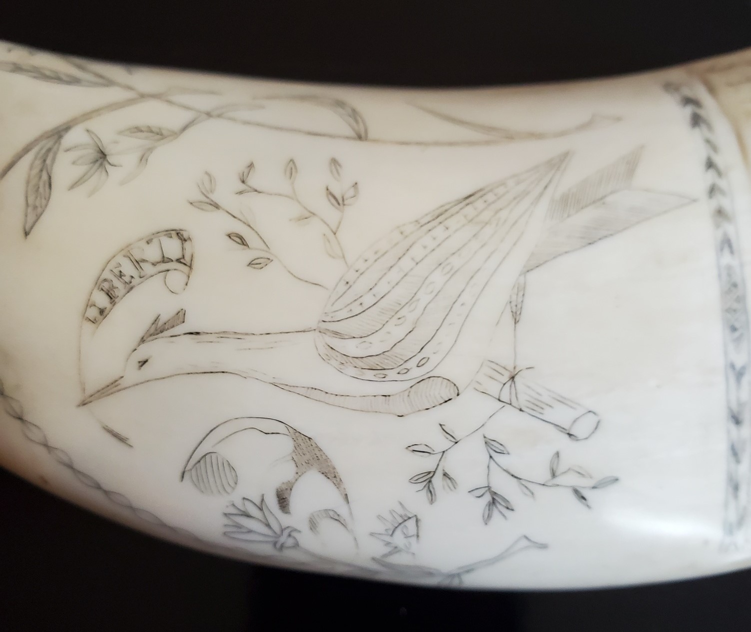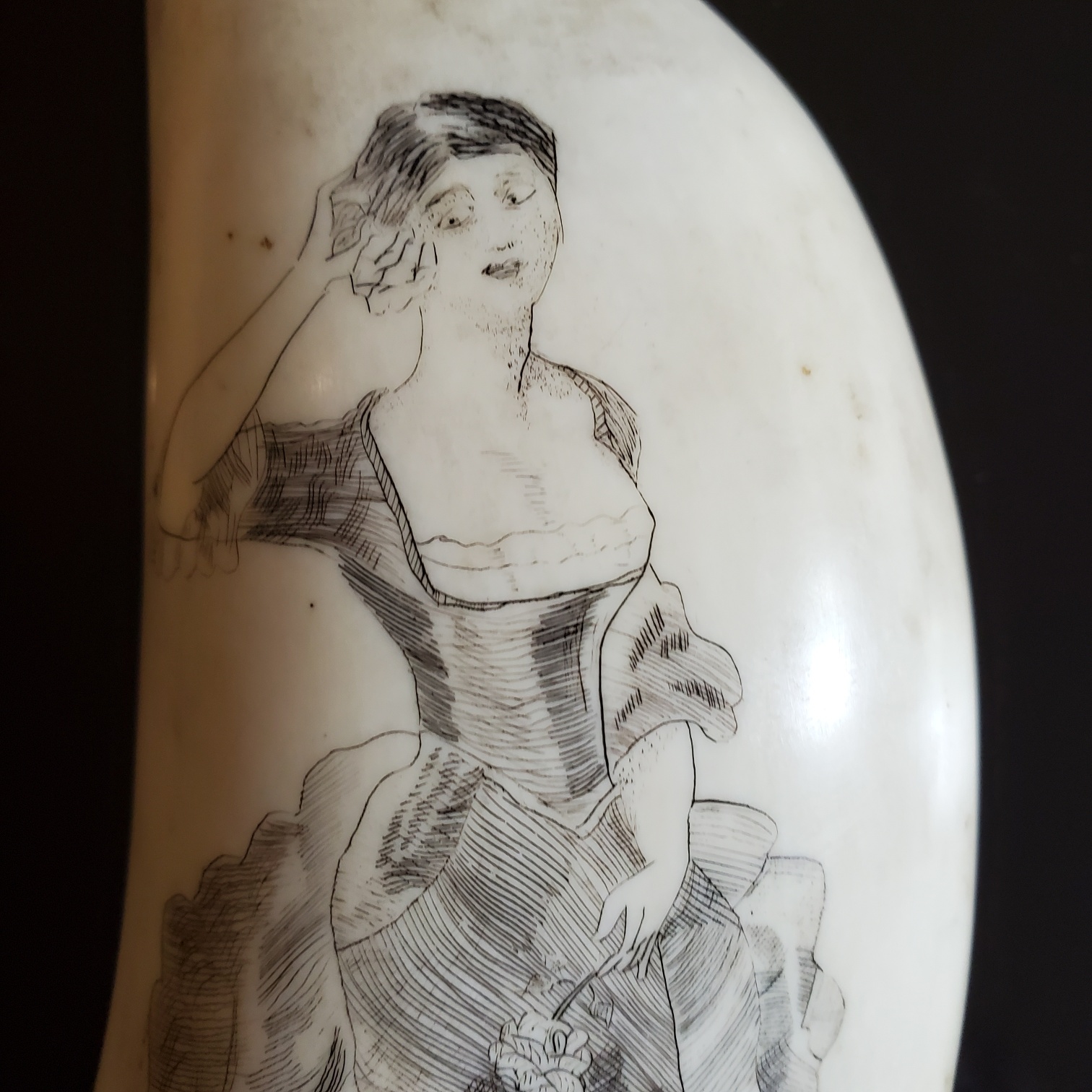 Antique Scrimshaw Whale Tooth with Portrait of Young Lady, circa 1880, an engraved full length portrait of a lovely young lady  wearing an 1870s -80s style satin hoop skirt with fitted bodice in front and full bustle in back, with a dainty shoe peaking out from beneath. She is holding a rose in one hand. and holding a sea shell to her ear with the other, clearly thinking of her beau at sea. The reverse is engraved with a dove holding a banner inscribed “Liberty,” amidst olive or tobacco branches, a gull in flight, and a clever border design. The sailor’s engraving is simple and untutored, but very effective and endearing.