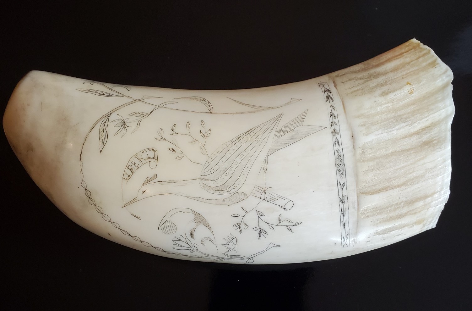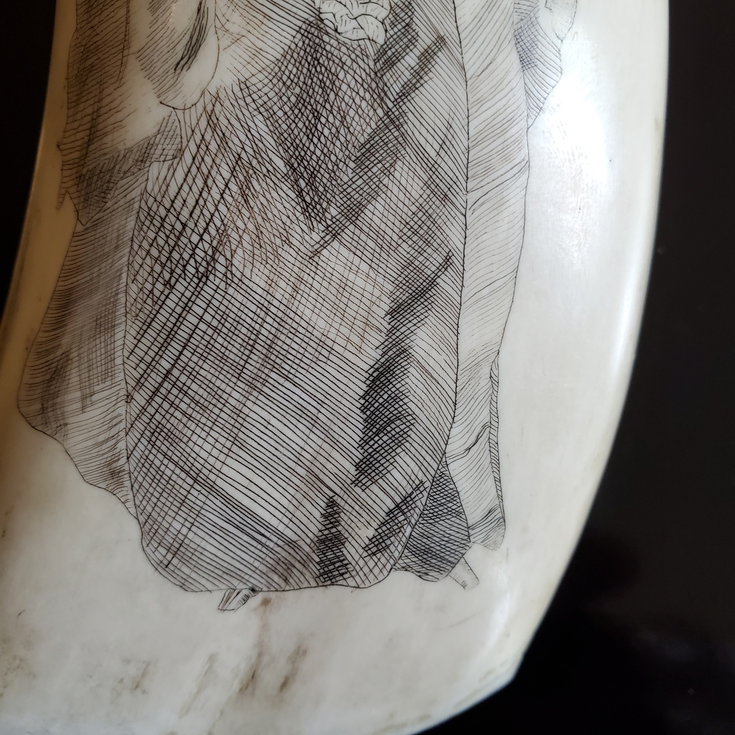 This sailor’s folk art scrimshaw is engraved on the tooth of a sperm whale (Physeter macrocephalus), is well over 100 years old, is fully compliant with the Endangered Species Act (1973) and Marine Mammal Protection Act (1972), and is completely legal for interstate commerce under federal law.