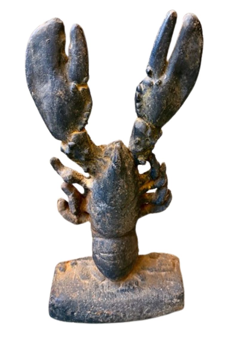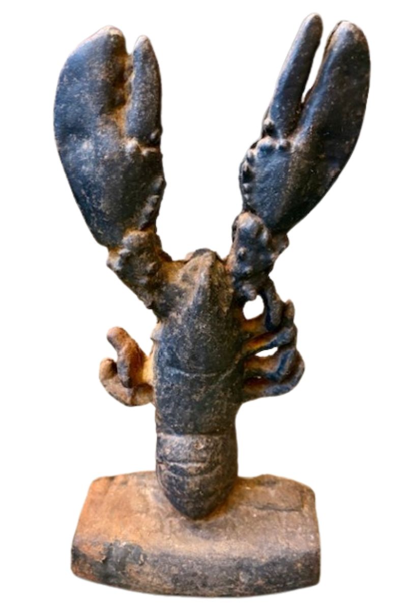 Early 20th Century Pair of Cast Iron Lobster Andirons, circa 1920, very rare fireplace andirons in form of a good old Maine lobster standing upright on tail set on rocky plinth, with claws upraised, in old, possibly original black paint. I have seen only three other pairs of these ever.
