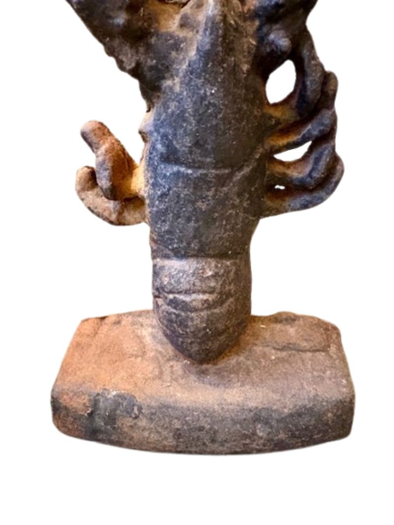 Early 20th Century Pair of Cast Iron Lobster Andirons, circa 1920, very rare fireplace andirons in form of a good old Maine lobster standing upright on tail set on rocky plinth, with claws upraised, in old, possibly original black paint. I have seen only three other pairs of these ever, with one selling for $5000 some years ago.
