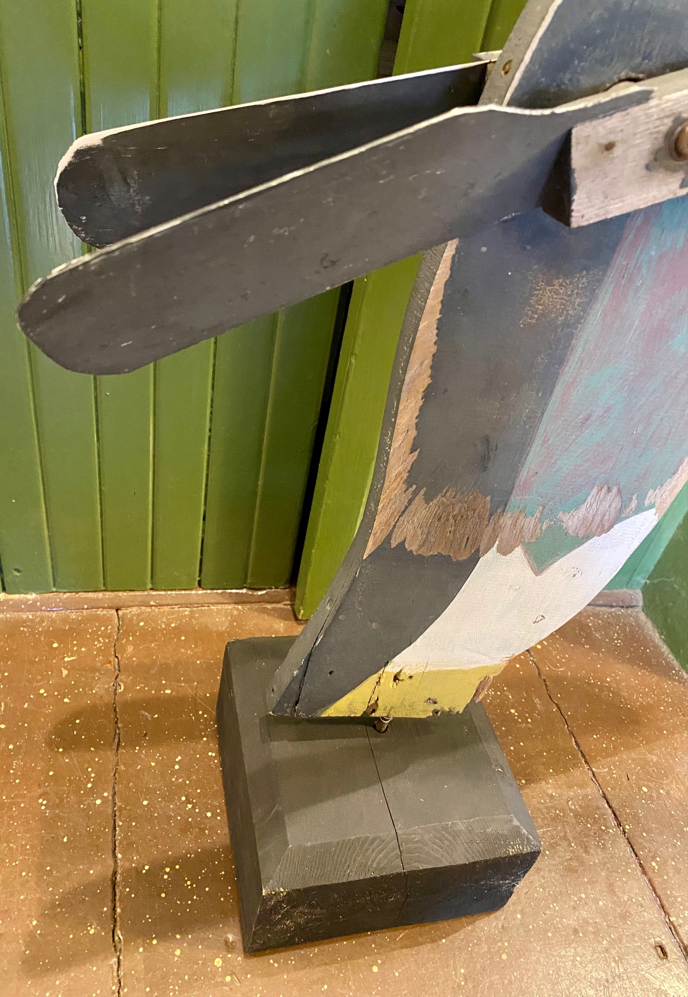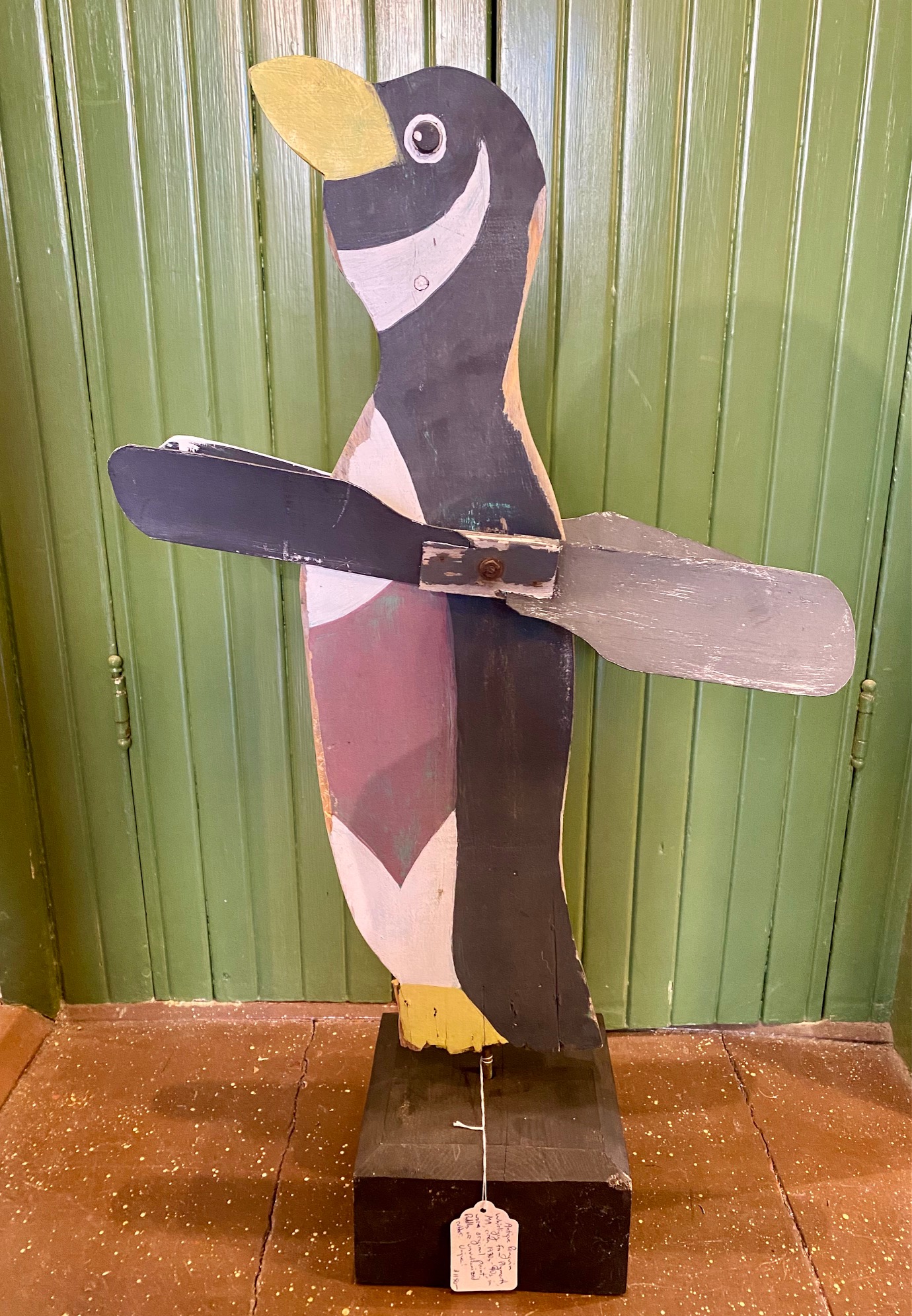 Early Vintage Penguin Whirligig from Plymouth, Massachusetts, circa 1930s – 1940s, a hand cut and painted wooden flat silhouette of a large penguin in worn original paint. The paddles are original as well, and made of un-vulcanized rubber. A unique and very whimsical piece of folk art. Mounted on a chamfered wooden block.
