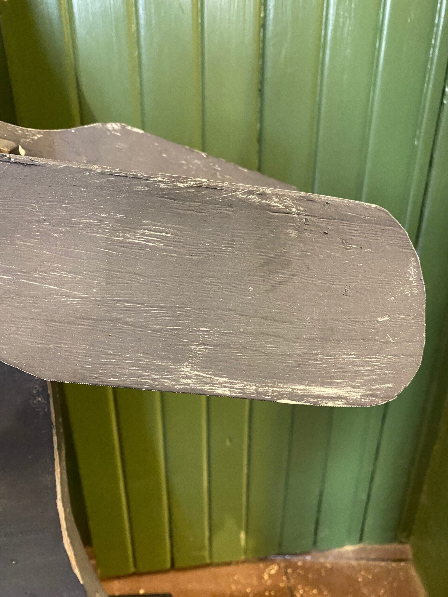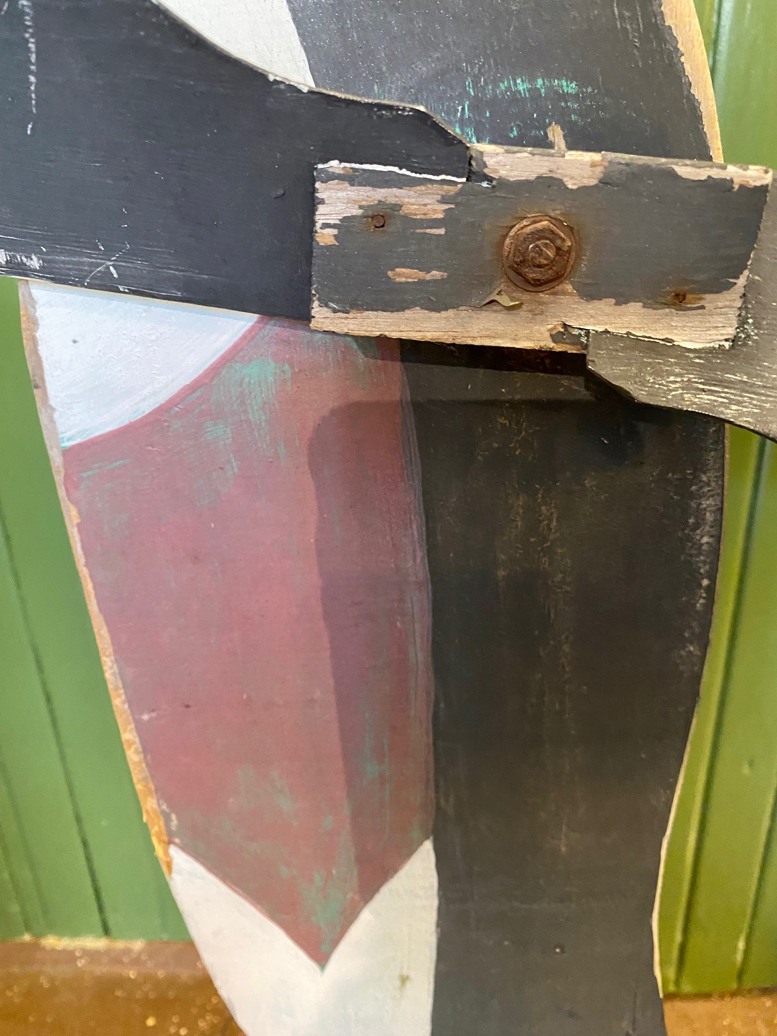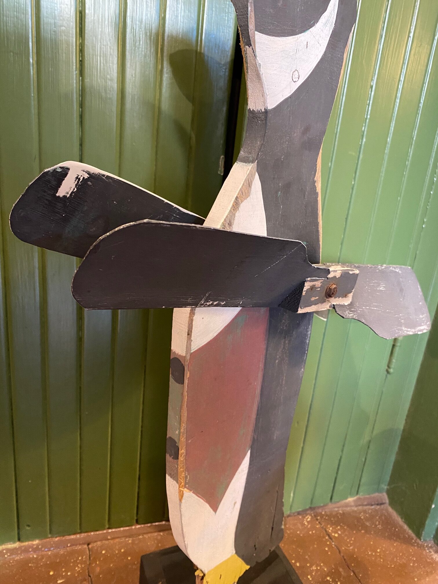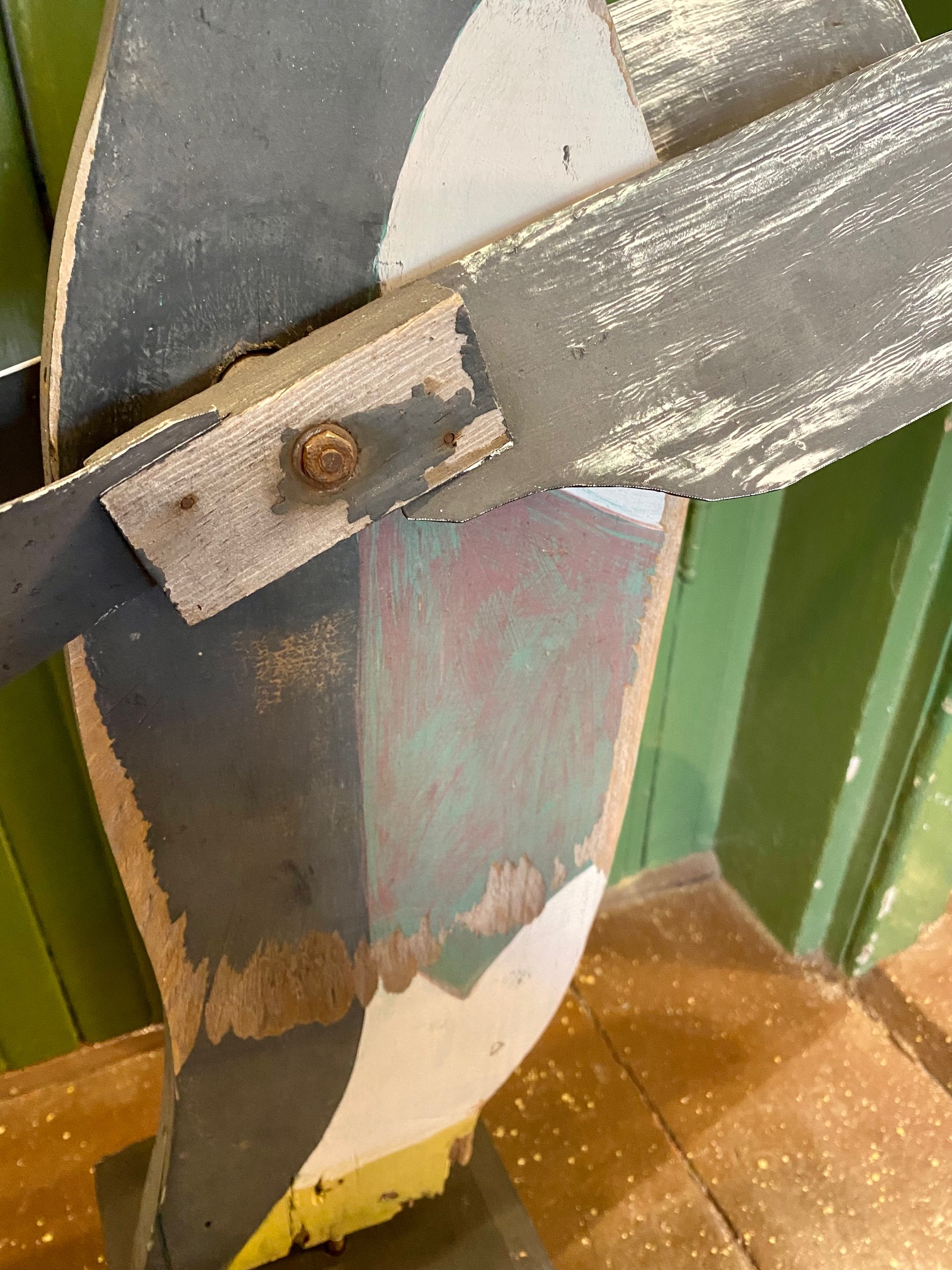 The whirligig remains in very good condition, but clearly shows its use. There is a small amount of wood erosion and loss at the bottom. The chin shows chafing from the wind-driven paddles, especially on the right side. Likewise there is similar chafing on the lower body, again especially on the right side. The effect is actually very pleasant and I think enhances the folk art appeal.