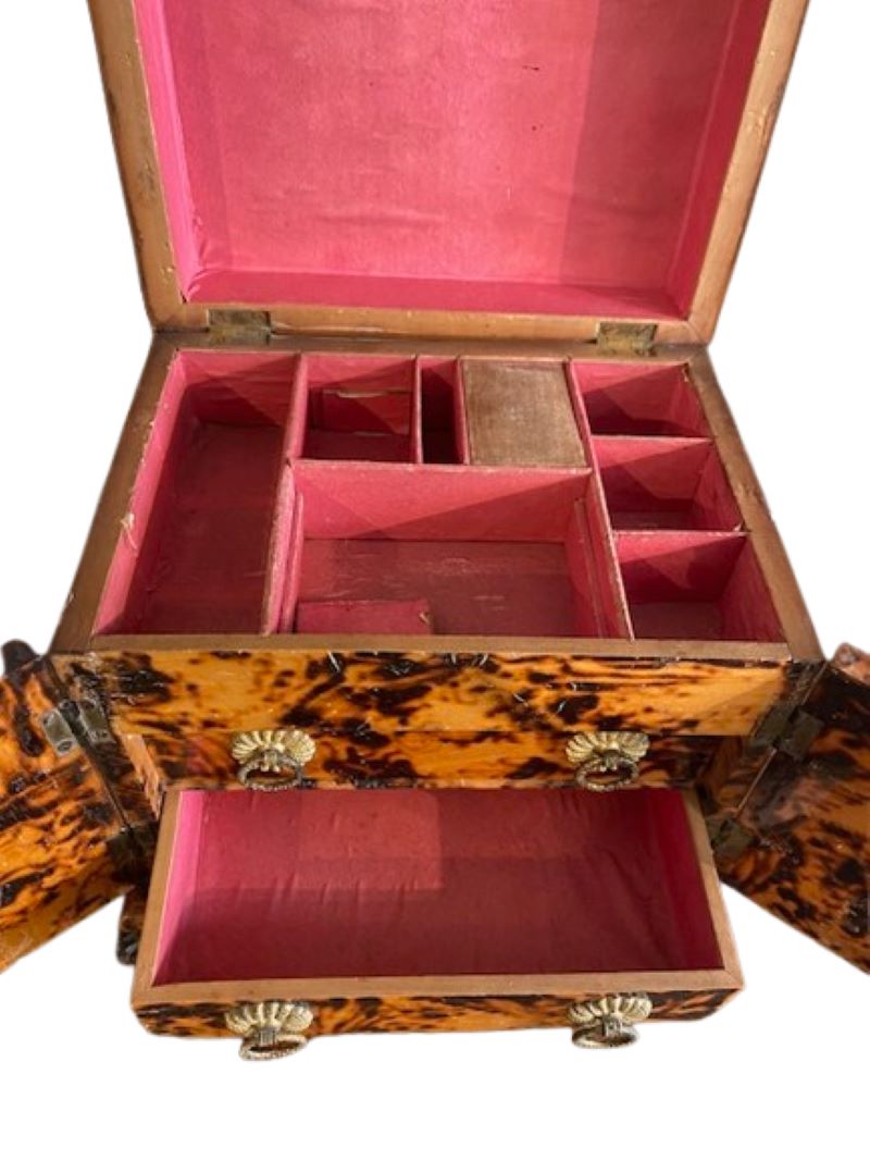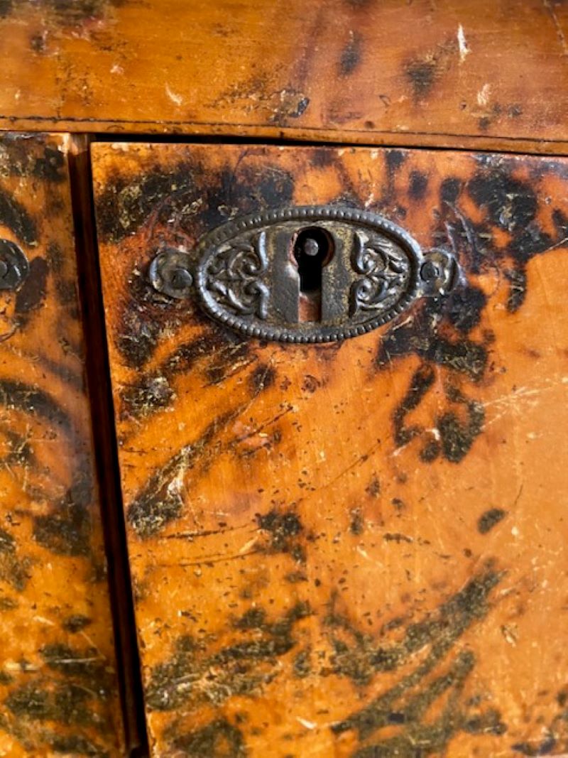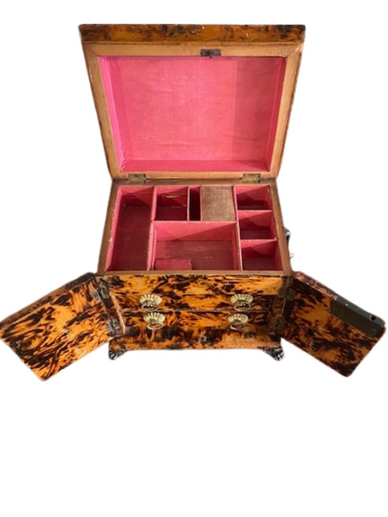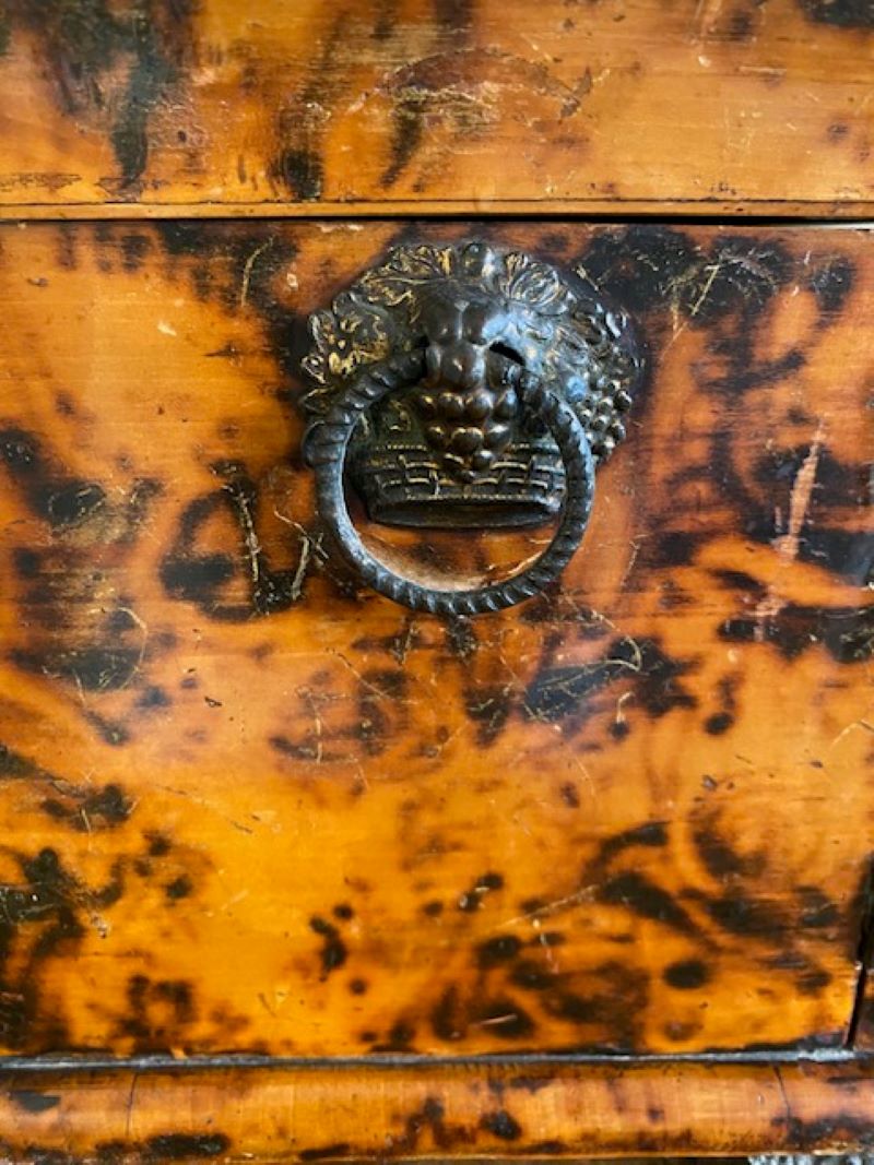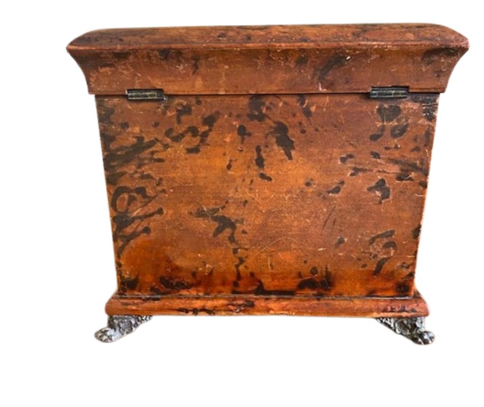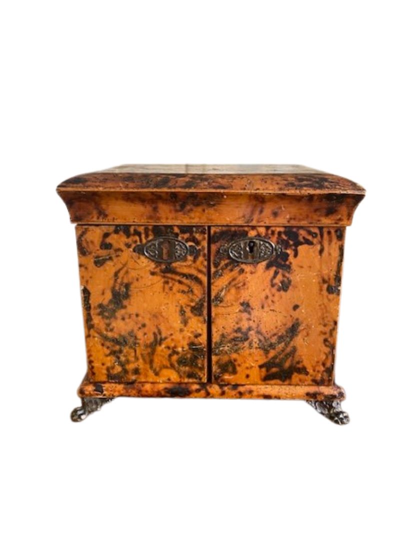 19th Century English Faux Tortoise Shell Grain Painted Wooden Dresser Box, circa 1830, a Regency style sewing or jewelry box crafted of a hardwood, likely maple, hand painted inside and out as faux tortoise shell, mounted with brass repousse oval escutcheons, fruit basket side bail handles, and lion’s paw feet; the hinged lid lifts to reveal a paper-lined fitted compartment, above two doors which reveal two drawers brass repousse rosette pulls.