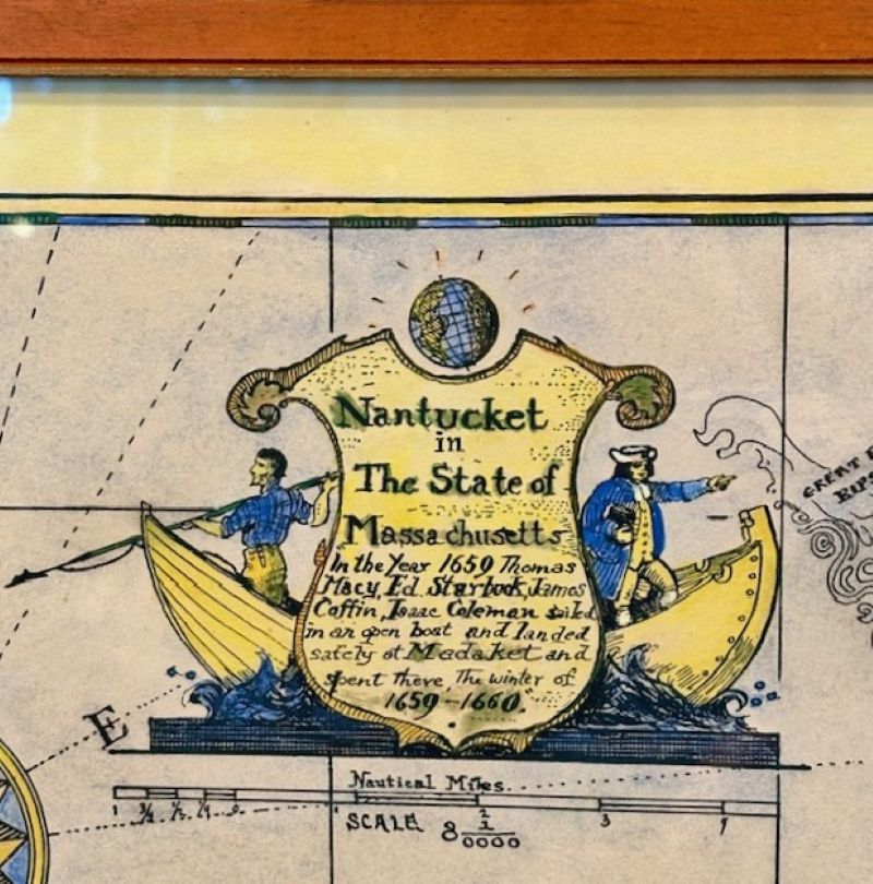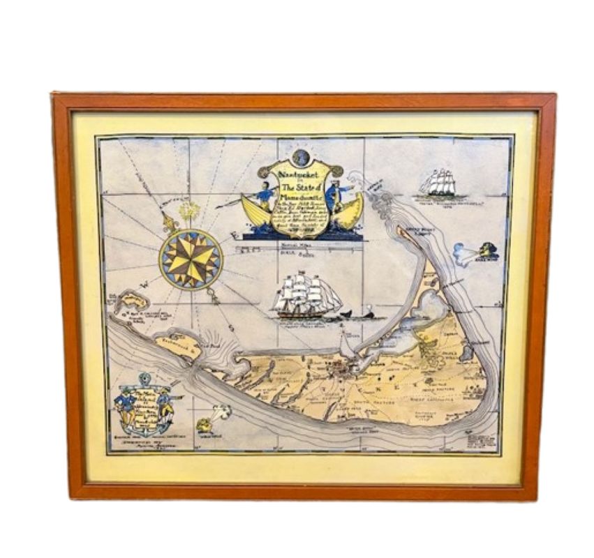Map of Nantucket by Austin Strong (1881 – 1952), circa 1921, an original print on paper whimsical map of Nantucket Island by Robert Louis Stevenson’s step- grandson, noted stage set designer, artist and Nantucket cultural icon Austin Strong. The map illustrates the geographic locations and features on the island, in addition to Austin’s own invented Nantucket Coat-of-Arms with Harpooner and Quaker flanking an inscribed shield; compass rose; anthropomorphic East Wind and West Wind; whale ship and clipper ship and frolicking sperm whales; signed and dated in the lower left; the map was hand colored in soft watercolors, either by Austin or the original purchaser of the map; mounted in its original simple pine frame.