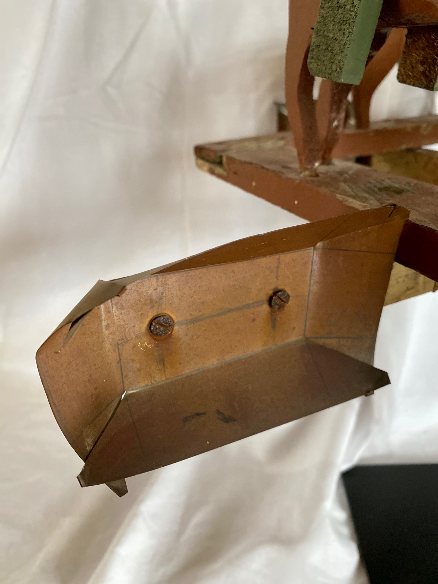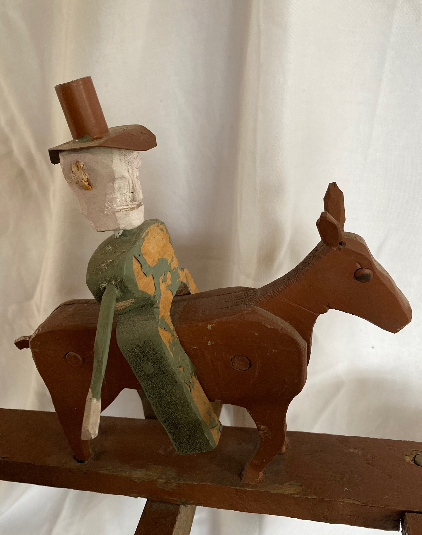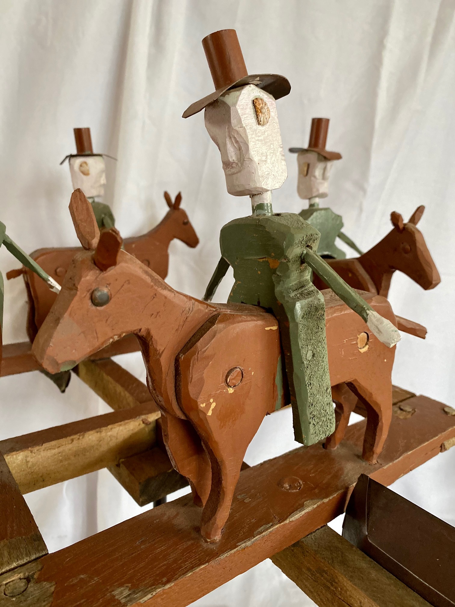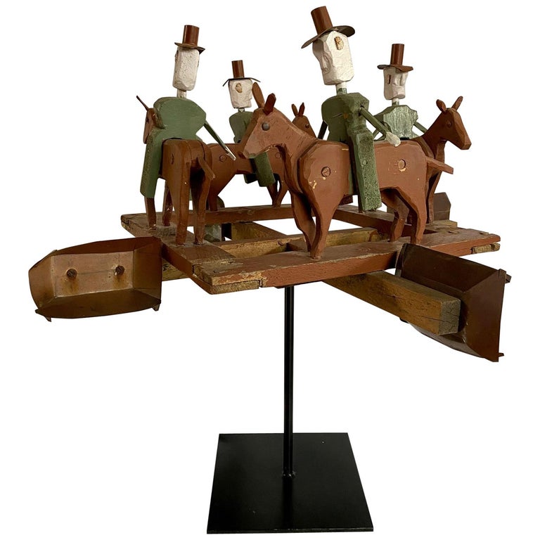 Mid 20th Century Folk Art Cowboy Rodeo Whirligig, circa 1940s to 50s, comprising four carved and painted cowboys mounted on horseback riding in a circle as turned by the wind. each naive figure has a carved head with detailed features, on simple bow-legged body, with carved stick arms ending in detailed hands, and wearing a Stetson made of copper pipe and sheet. Each rider is astride a wonderfully naive steed with tall alert ears, tack eyes and a long straight out tail. The men are painted with white faces and green clothing; the horses are painted brown. The figures are set on an open square frame atop cross-bars that hold broad copper shaped paddles to catch the wind. The entire gig is presented on an iron museum mount. The sculpture has a great whimsical mood, with the grumpiest looking cowboys you’ve ever seen, and mounts with ears so prominent they look like startled mules! Despite having started its life working outside in the wind and weather, the whirligig remains in surprisingly good condition. There is the expected wear to the original paint, especially on the front of one dude; and two of the cowpokes are missing one arm. Whirligig: 12-1/2 in High x 24-1/2 in Long x 24 in Wide Mounted: 23-1/2 in High