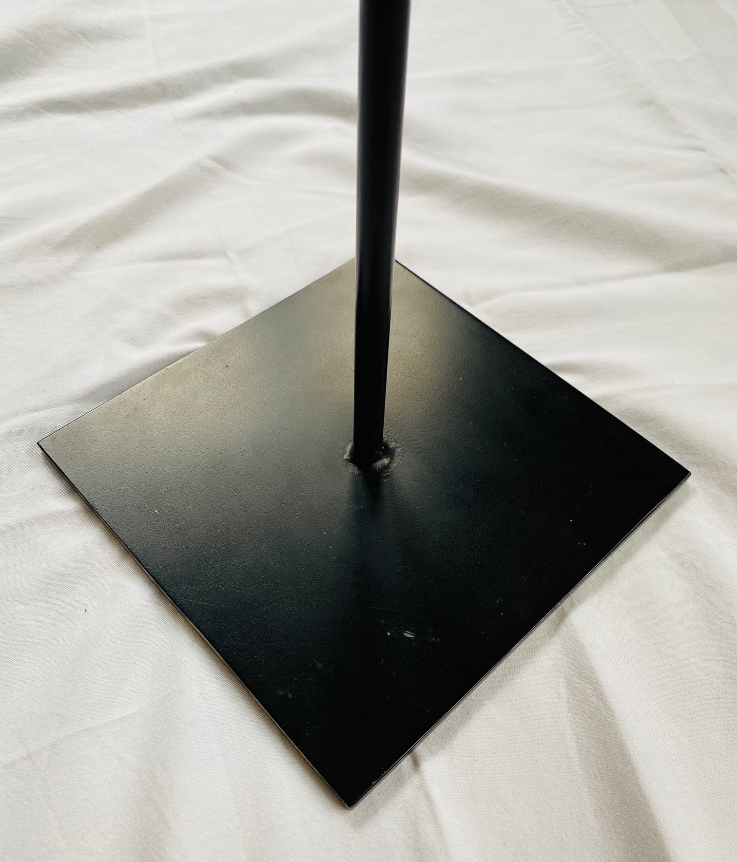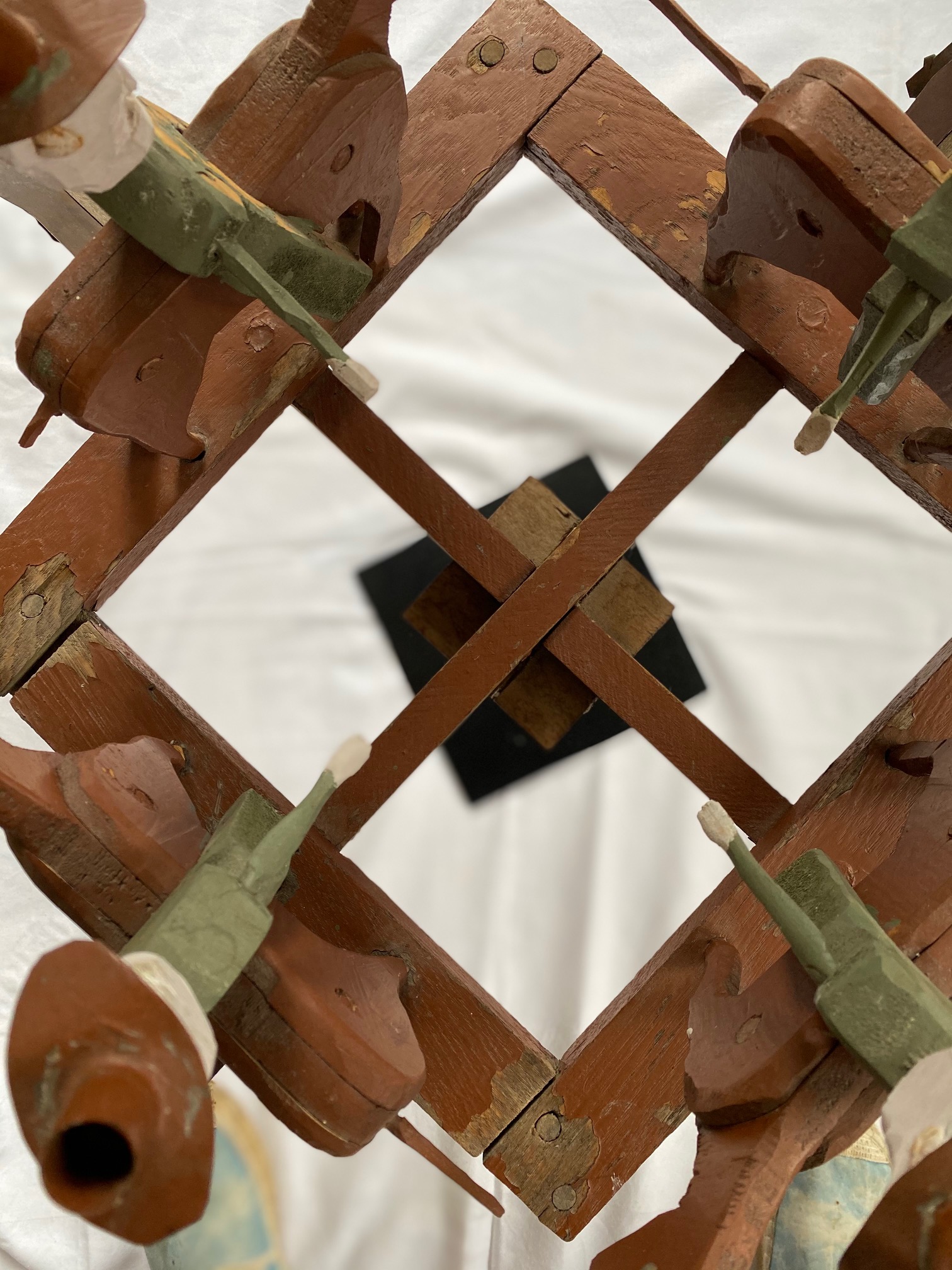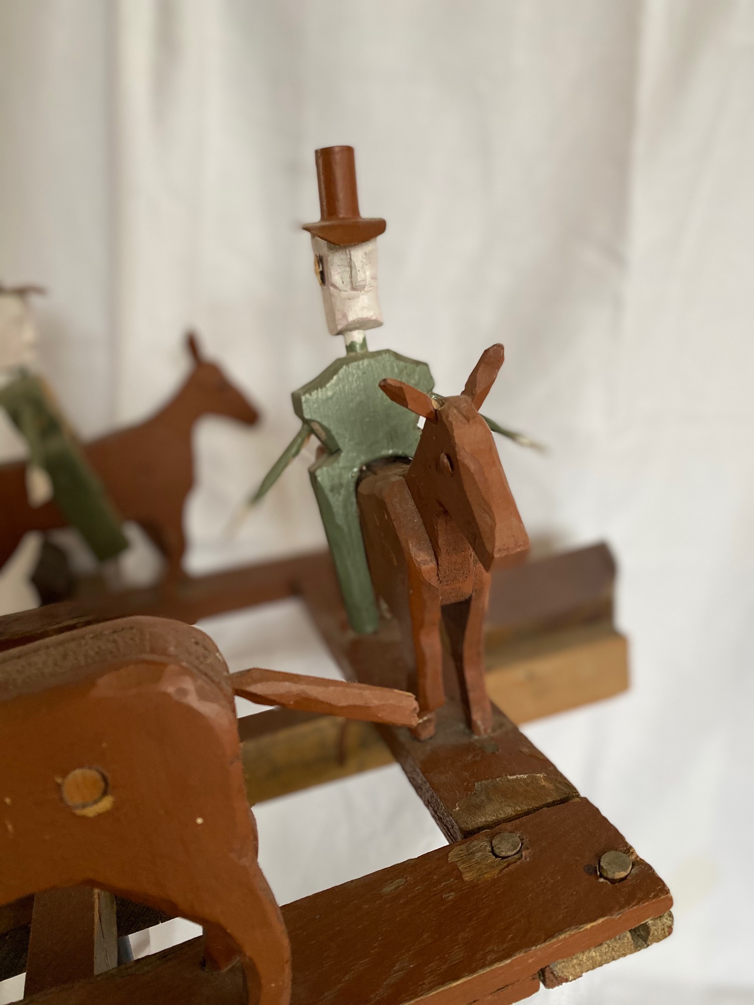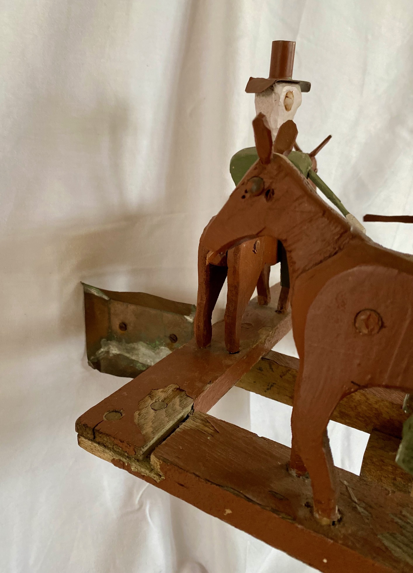 Mid 20th Century Folk Art Cowboy Rodeo Whirligig, circa 1940s to 50s, comprising four carved and painted cowboys mounted on horseback riding in a circle as turned by the wind. each naive figure has a carved head with detailed features, on simple bow-legged body, with carved stick arms ending in detailed hands, and wearing a Stetson made of copper pipe and sheet. Each rider is astride a wonderfully naive steed with tall alert ears, tack eyes and a long straight out tail. The men are painted with white faces and green clothing; the horses are painted brown. The figures are set on an open square frame atop cross-bars that hold broad copper shaped paddles to catch the wind. The entire gig is presented on an iron museum mount. The sculpture has a great whimsical mood, with the grumpiest looking cowboys you’ve ever seen, and mounts with ears so prominent they look like startled mules! Despite having started its life working outside in the wind and weather, the whirligig remains in surprisingly good condition. There is the expected wear to the original paint, especially on the front of one dude; and two of the cowpokes are missing one arm. Whirligig: 12-1/2 in High x 24-1/2 in Long x 24 in Wide Mounted: 23-1/2 in High