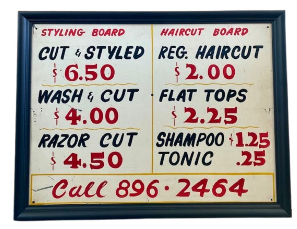 Early Vintage Barber Shop Sign, circa late 1950s to early 1960s, a hand-painted sheet metal sign with old prices for old hair cuts. The sign remains in very good condition with only a few scrapes to the paint, and having screw holes drilled in the corners and center. Believed to have come from Los Angeles. Mounted in a custom ebonized frame.