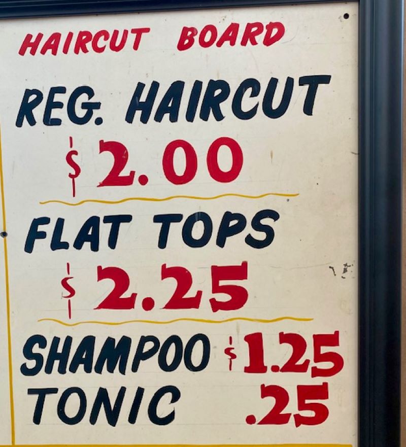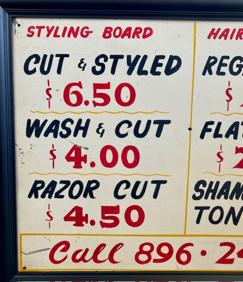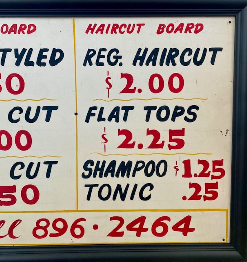 Early Vintage Barber Shop Sign, circa late 1950s to early 1960s, a hand-painted sheet metal sign with old prices for old hair cuts. The sign remains in very good condition with only a few scrapes to the paint, and having screw holes drilled in the corners and center. Mounted in a custom ebonized frame.