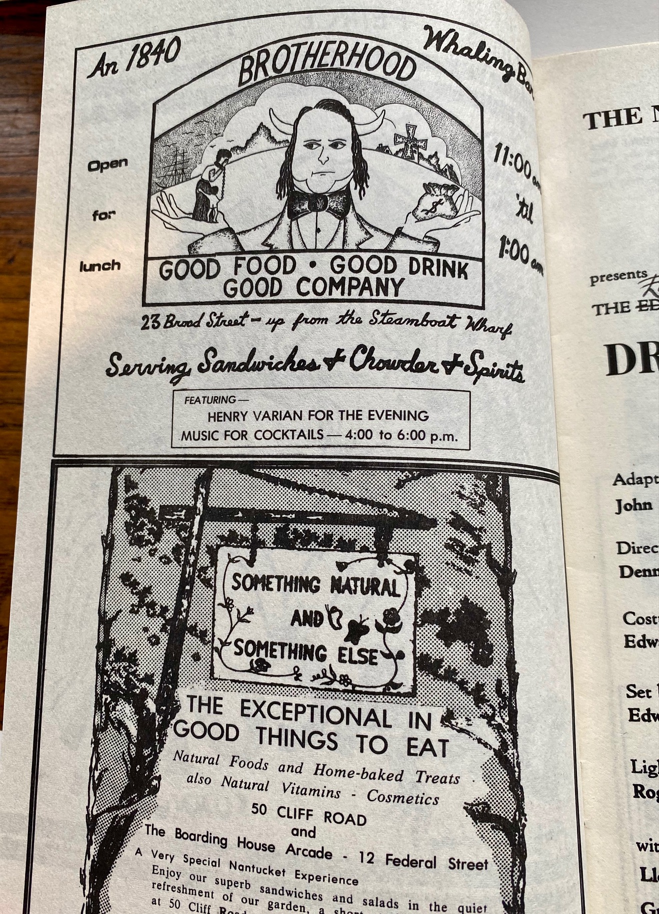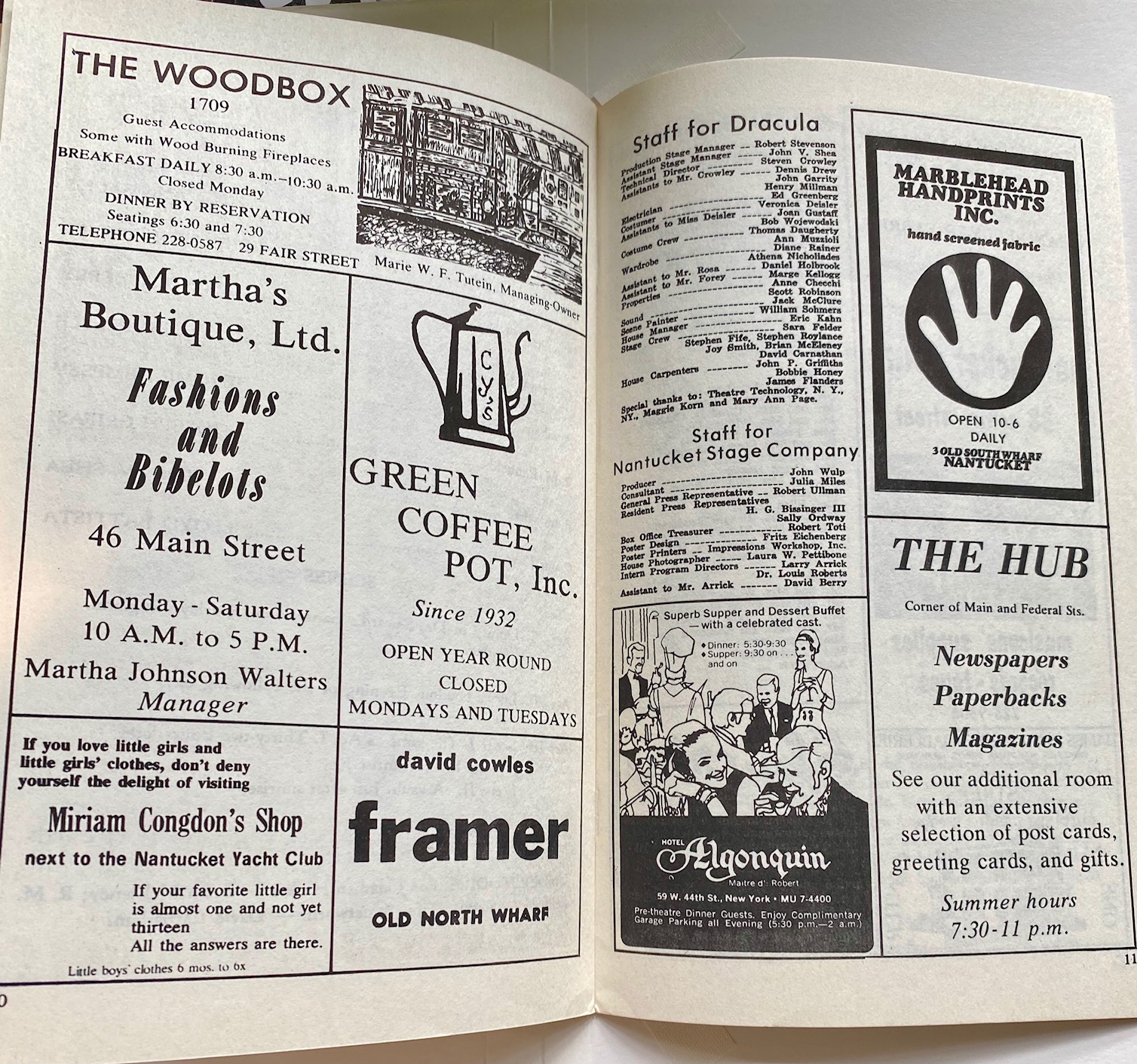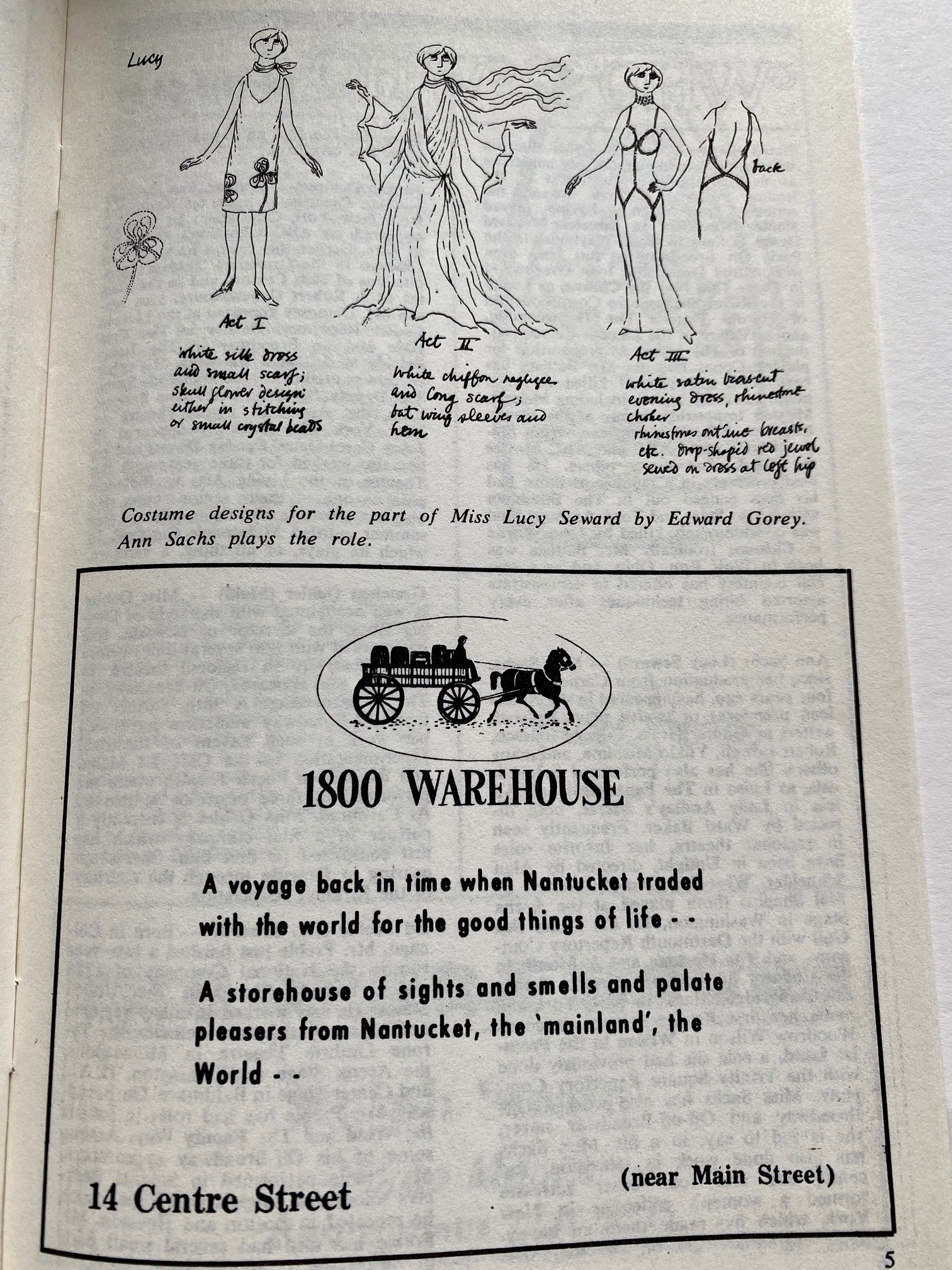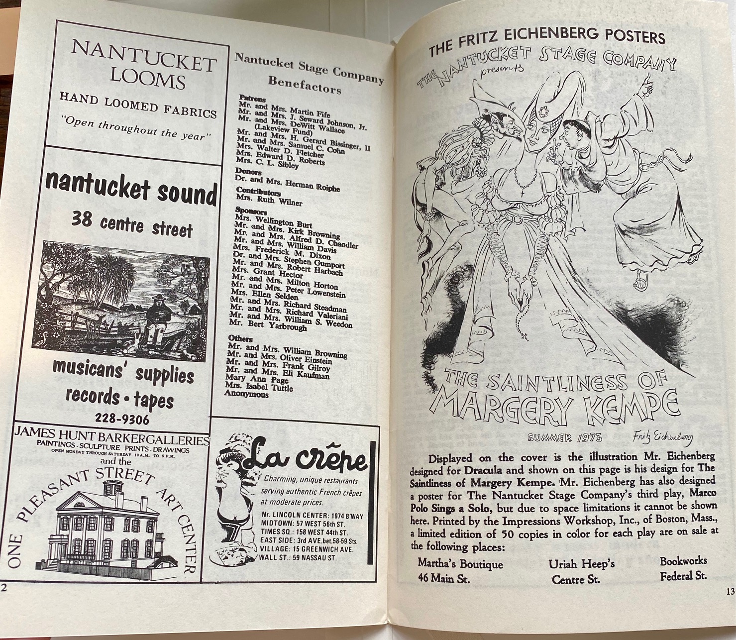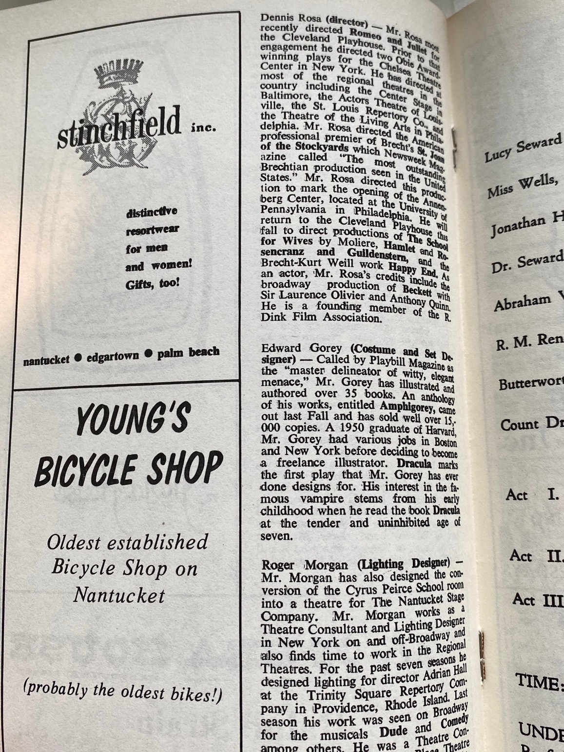 Original Program for the Nantucket Stage Company Production of “Dracula”, signed by Edward Gorey, 1973. The Nantucket Stage Company (which became the Straight Wharf Theatre, premiered this amazing production with stage sets and costume design by Edward Gorey, striking graphics by Fritz Eichenberg, and directed by John Wulp. The play featured John Shea in one of his earliest roles (best known later for starring as Lex Luther in the TV Superman series, as well as many film roles). In an interesting side note, Meryl Streep auditioned for the part of Lucy, but it had already been cast. After its successful opening on Nantucket, the production went on to it’s acclaimed run on Broadway. The program contains many photographs and Gorey designs, as well as great advertisements from island businesses of the day.