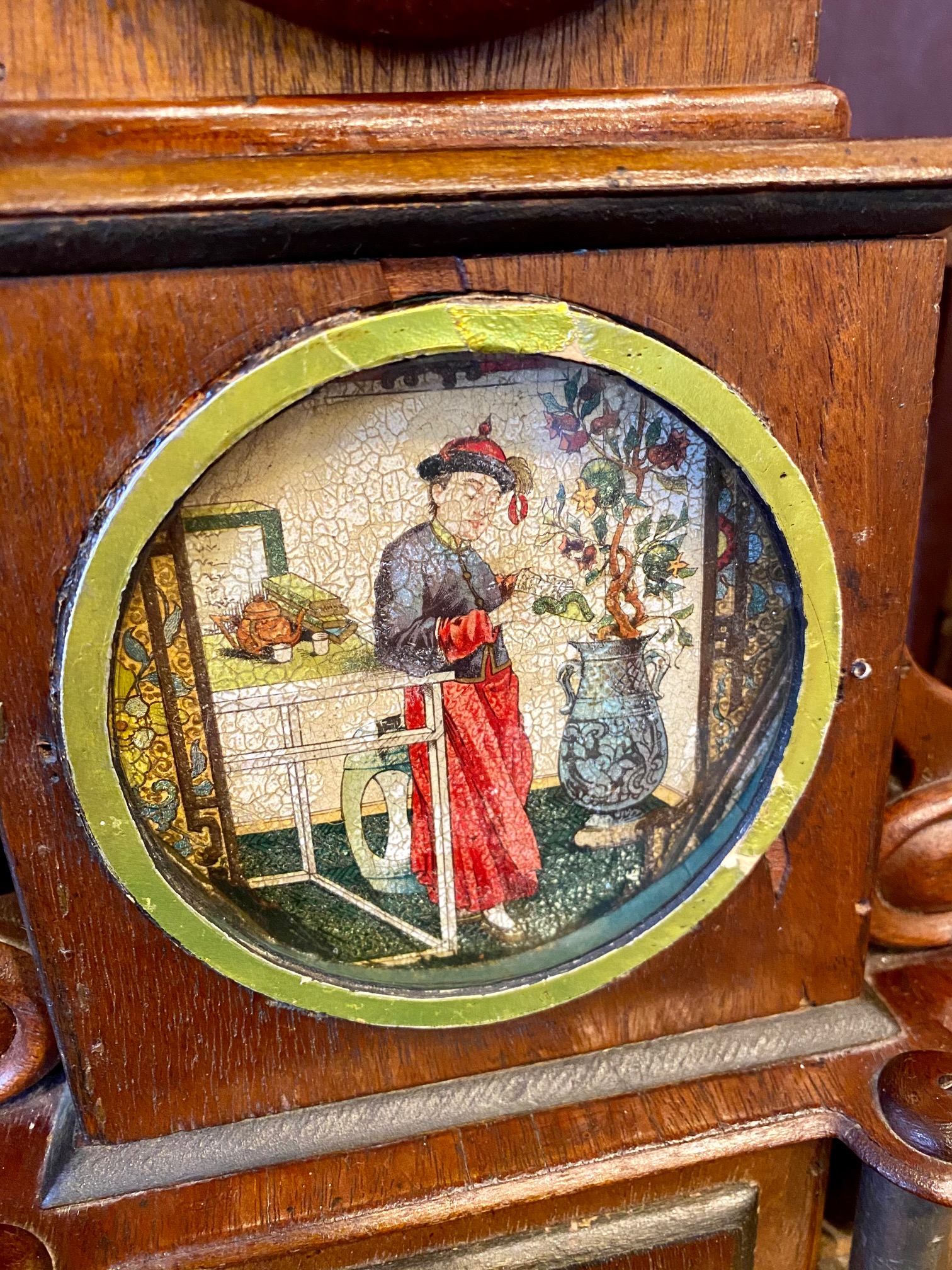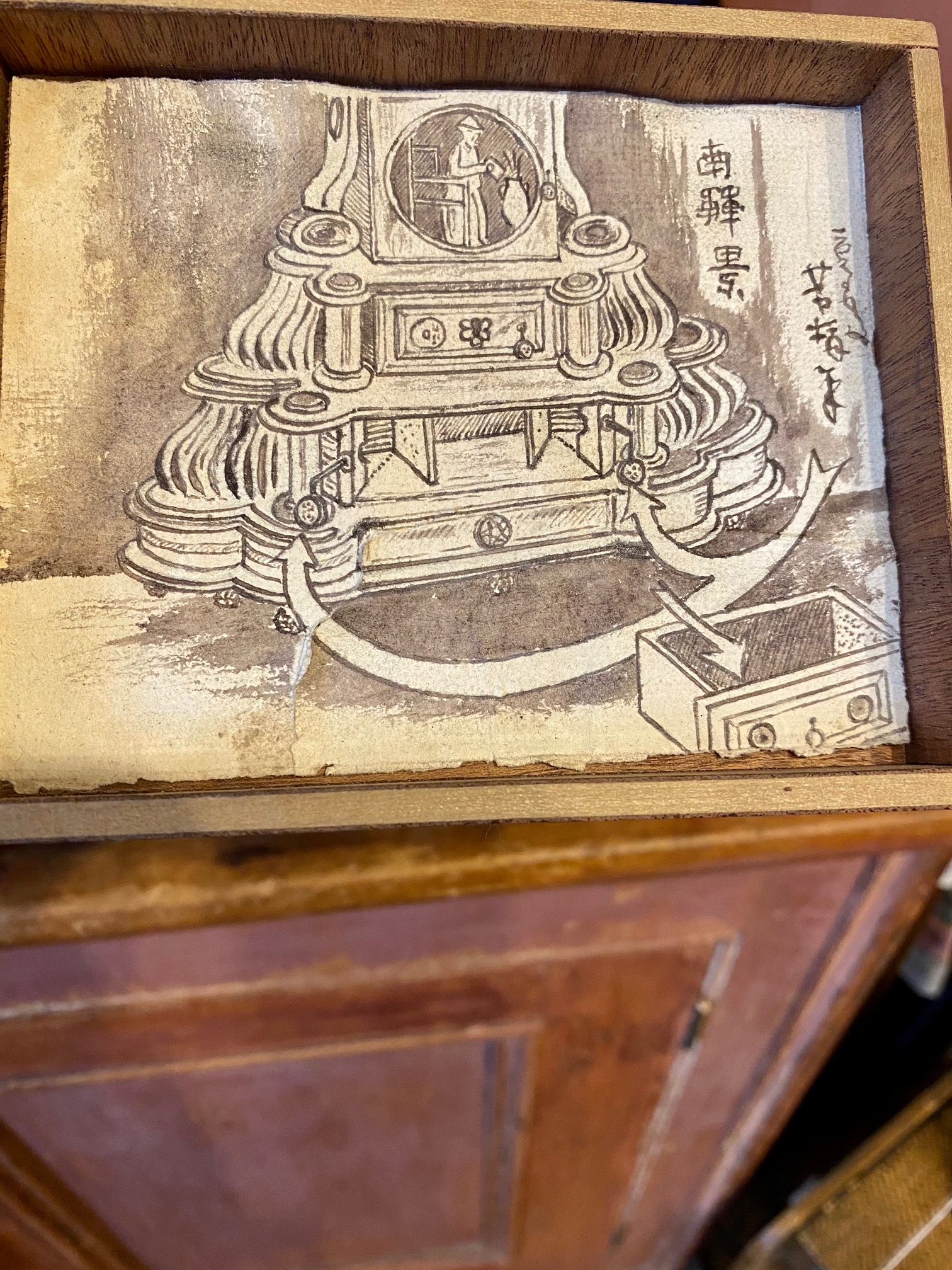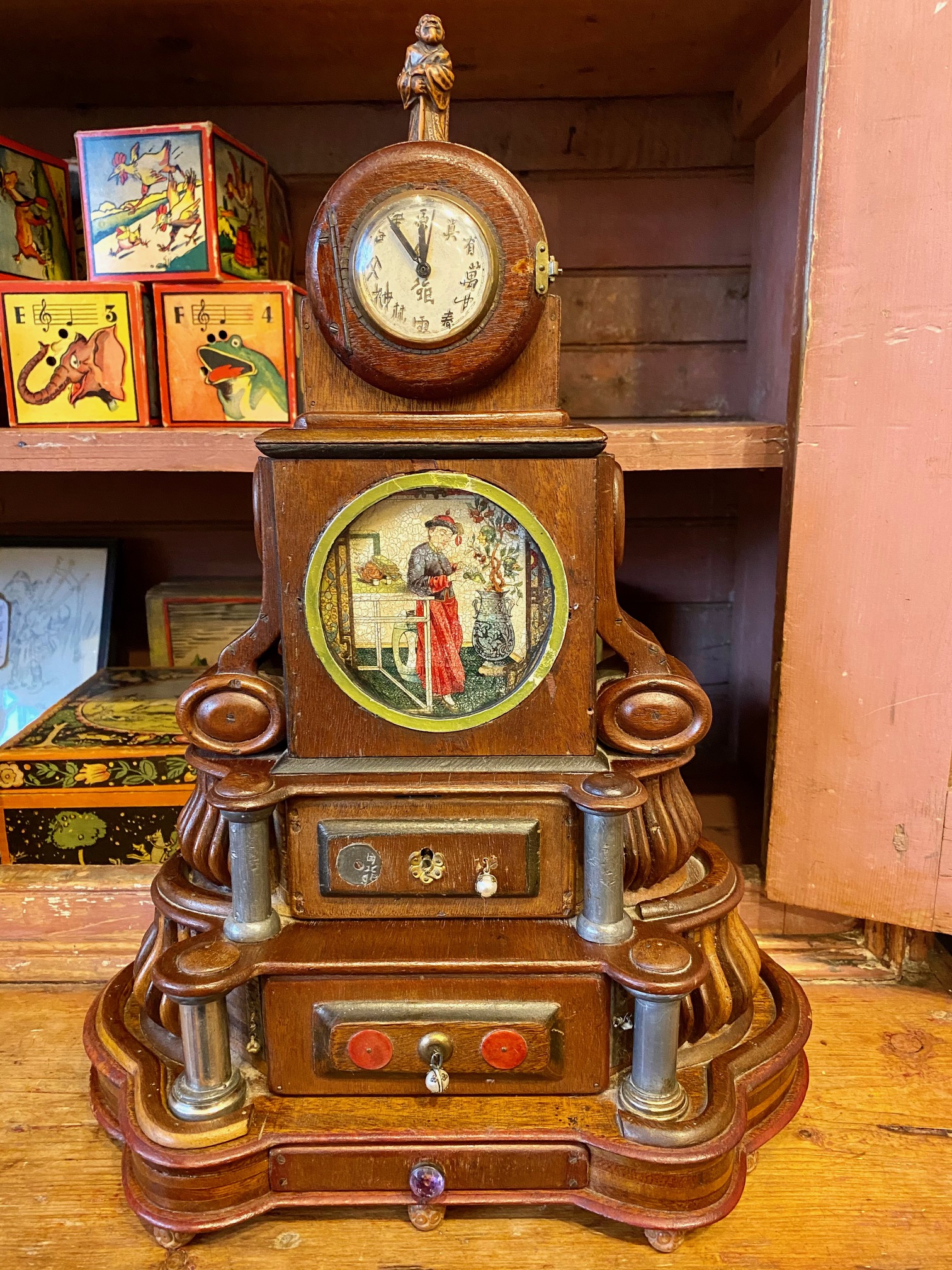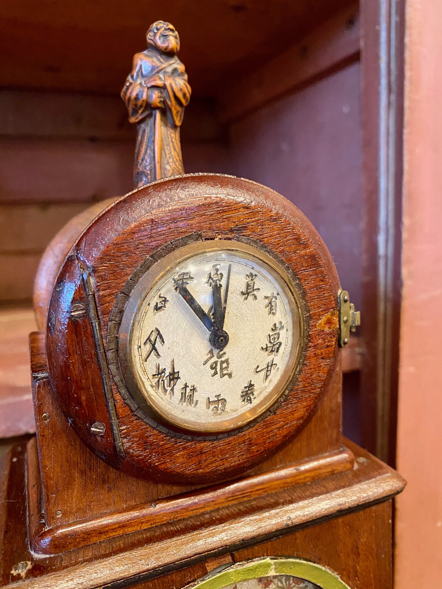 Turn of the Century Chinese Carved Mahogany Mantle Clock, circa 1900, in a Western Art Nouveau to Art Deco transitional style with a period wind-up mechanical clock, featuring an Immortal figure on the top, Chinese numerals on the dial, painted panels, pearl drop pulls and two interior secret compartments. In addition to the watercolor painted panels, there are also hand drawn illustrations in the interior instructing how to open the secret compartments. This is a Western style clock though clearly made for Chinese domestic use. I infer that it was made in Shanghai, a Chinese city which adopted the western muse and became one of the great Art Deco capitals of the world. Blending cultures, this is an extremely rare piece… a gem.