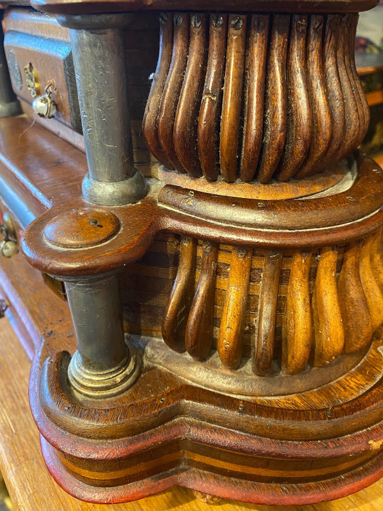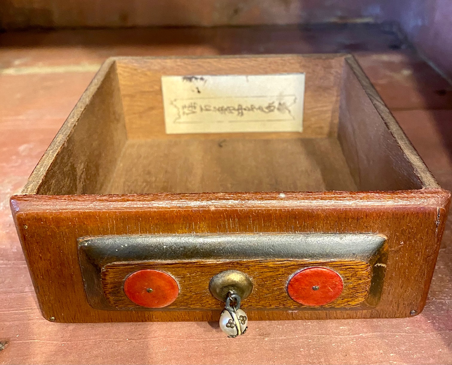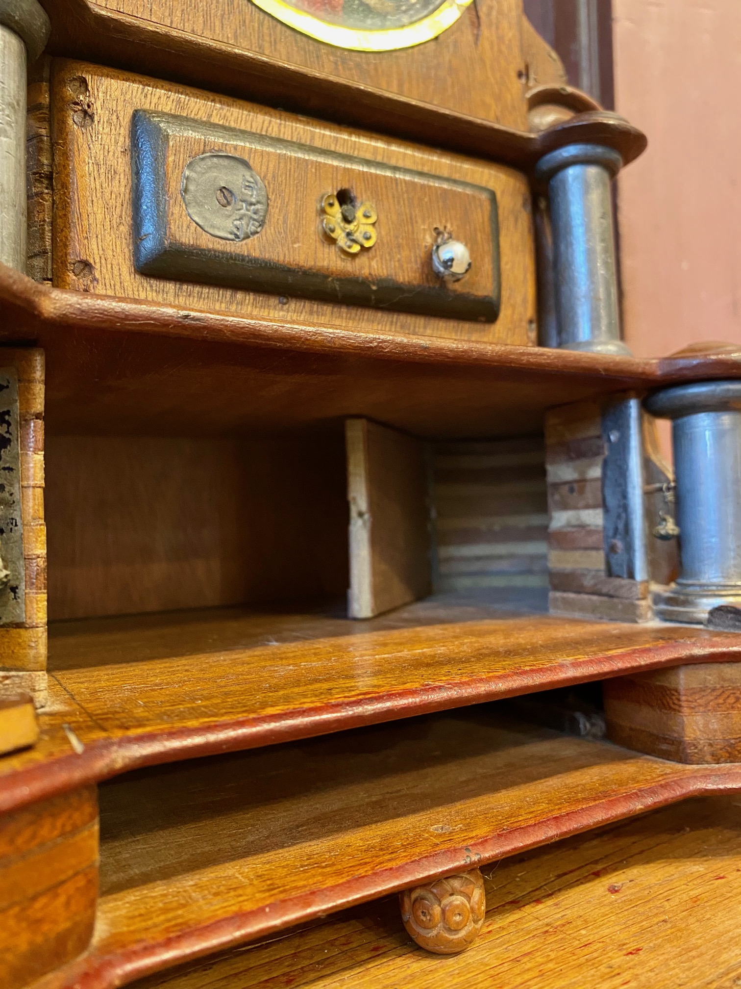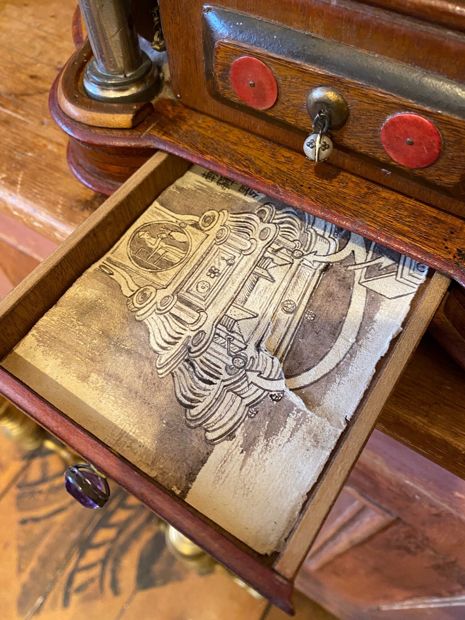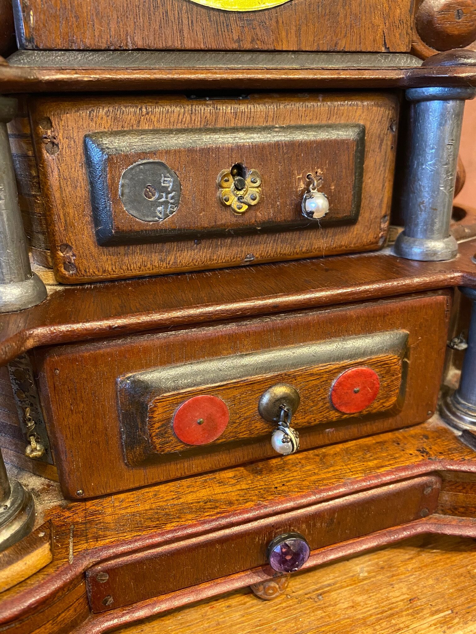 Turn of the Century Chinese Carved Mahogany Mantle Clock, circa 1900, in a Western Art Nouveau to Art Deco transitional style with a period wind-up mechanical clock, featuring an Immortal figure on the top, Chinese numerals on the dial, painted panels, pearl drop pulls and two interior secret compartments. In addition to the watercolor painted panels, there are also hand drawn illustrations in the interior instructing how to open the secret compartments. This is a Western style clock though clearly made for Chinese domestic use. I infer that it was made in Shanghai, a Chinese city which adopted the western muse and became one of the great Art Deco capitals of the world. Blending cultures, this is an extremely rare piece… a gem.
