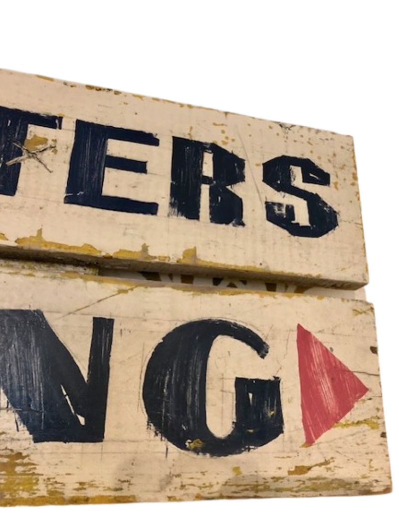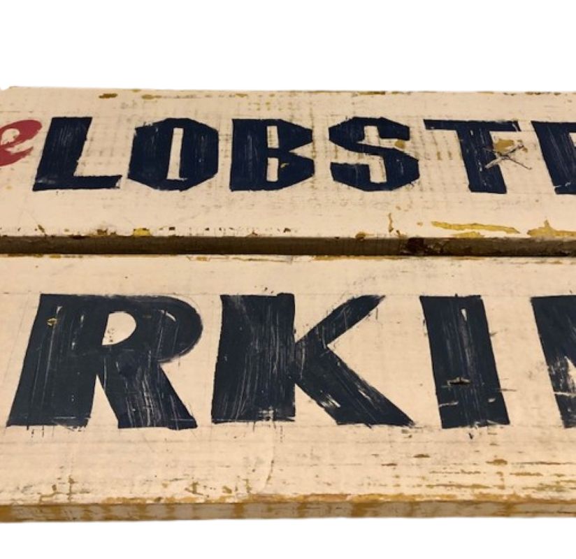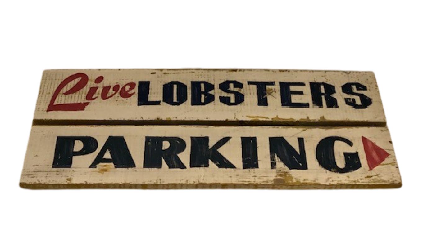 Unintentionally Whimsical Lobster Pound Sign, circa 1970, a great vintage hand-painted two board trade sign for a lobster pound. I love the idea of advertising where lobsters can park!