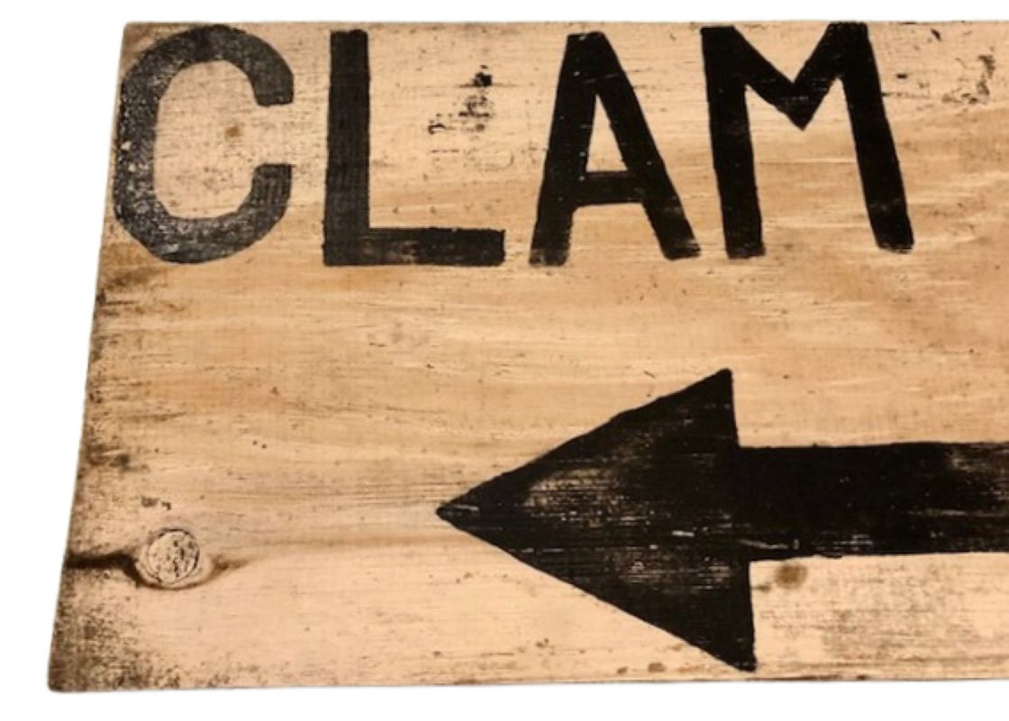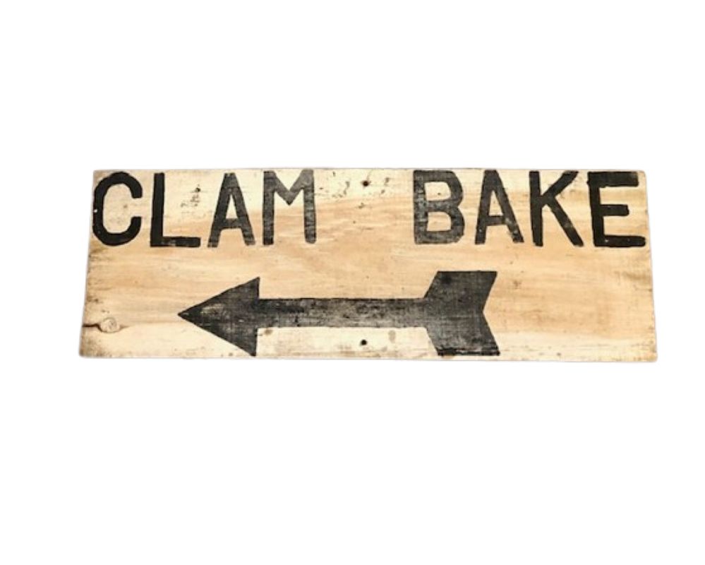 Vintage Clam Bake Sign, circa 1960s, a hand painted wooden trade sign for Clam Bakes. A classic and time-honored New England tradition and favorite for natives and tourists alike, alas now not as common as they once were.