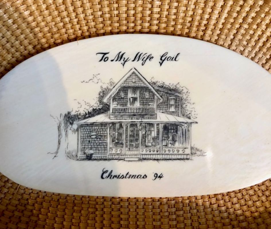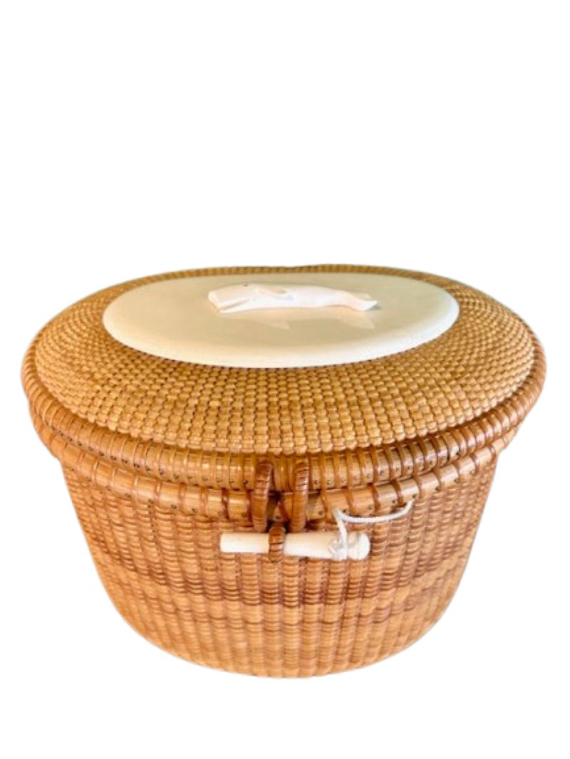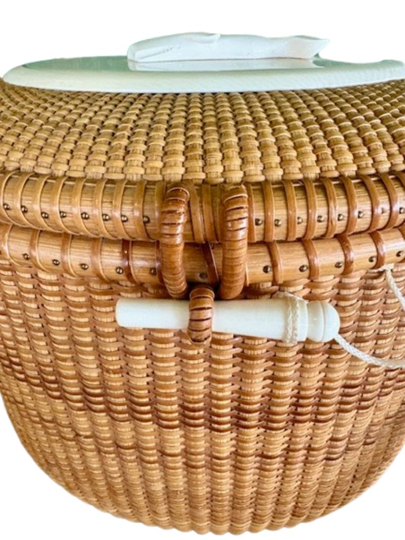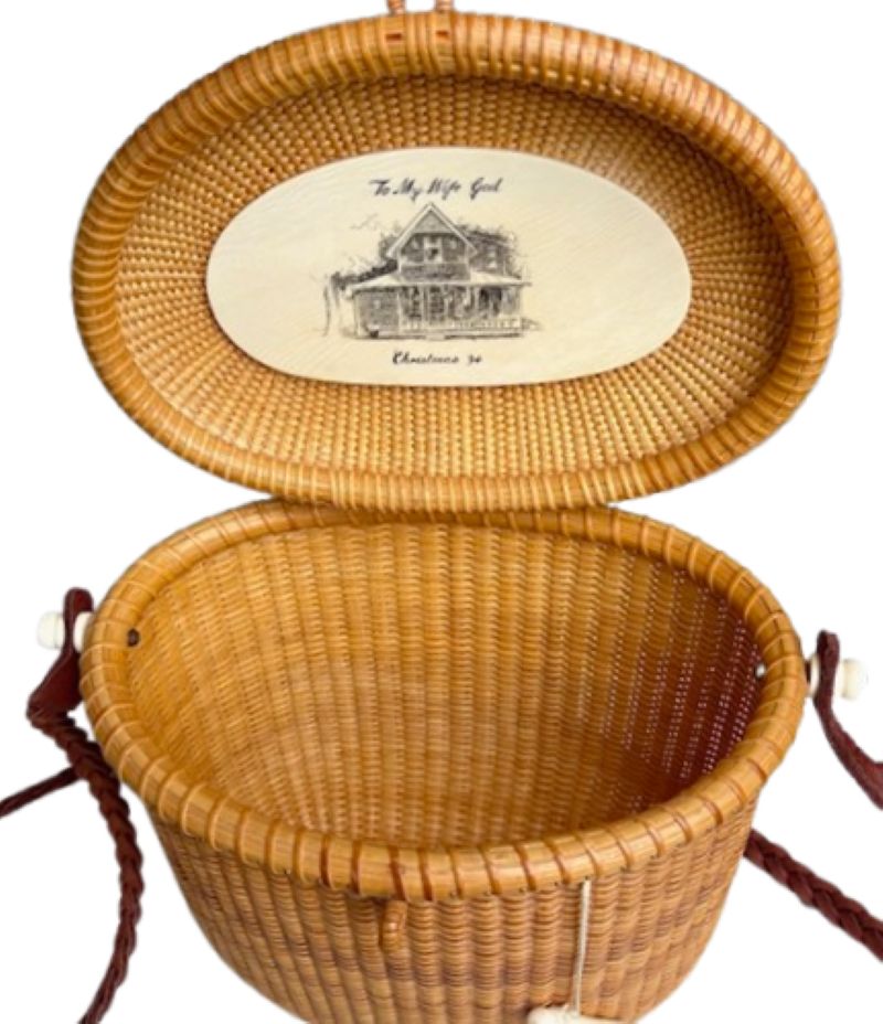 Larry Brewster has been making Nantucket baskets for over 30 years, often using scrimshaw by New Bedford artist Alan Doucette. This purse is a very early basket by Brewster, and is in his largest size. It remains in excellent color and condition.