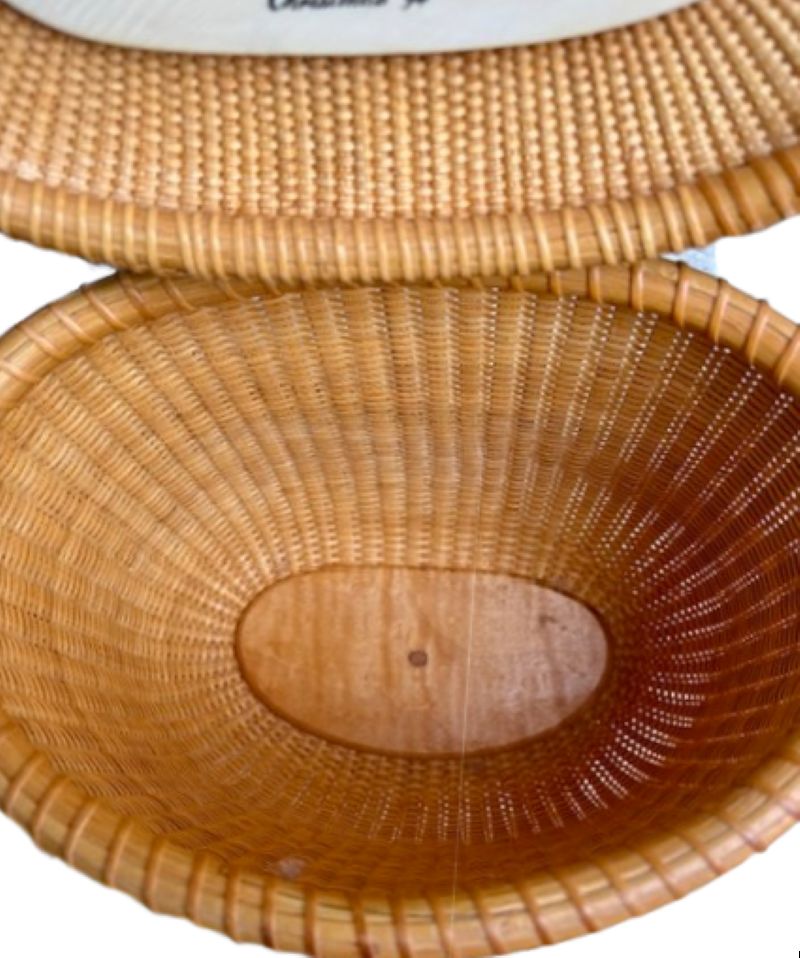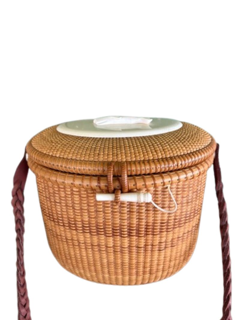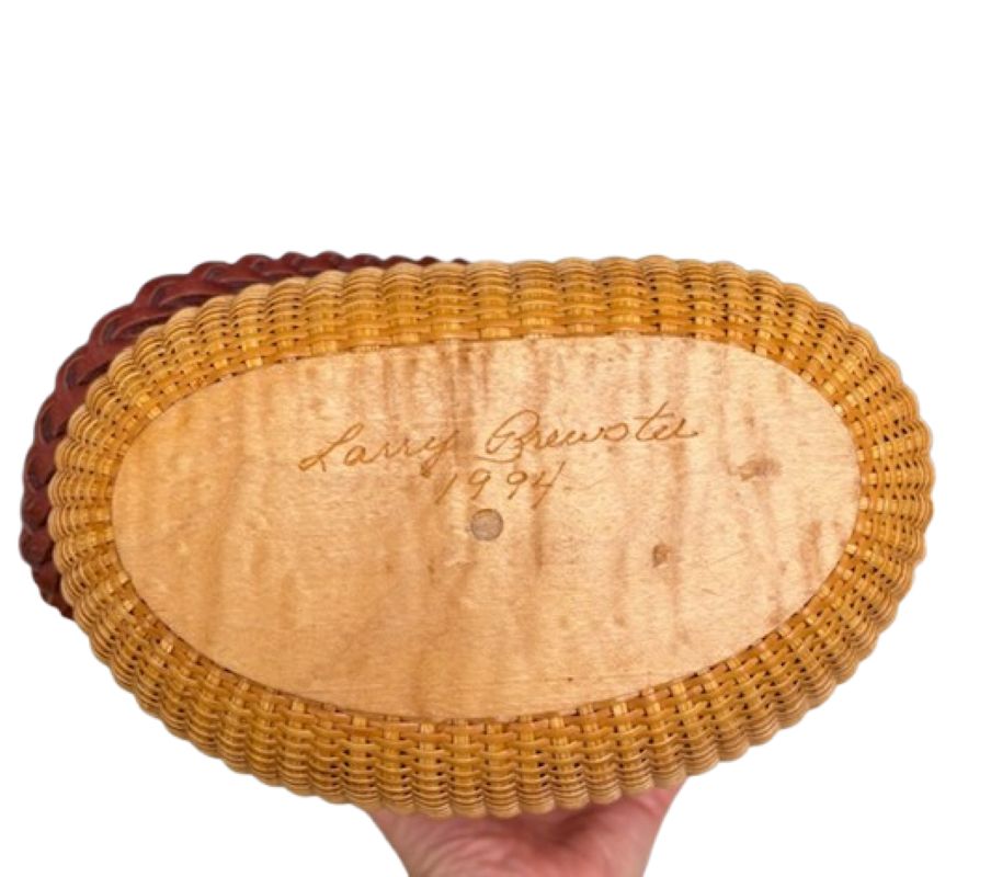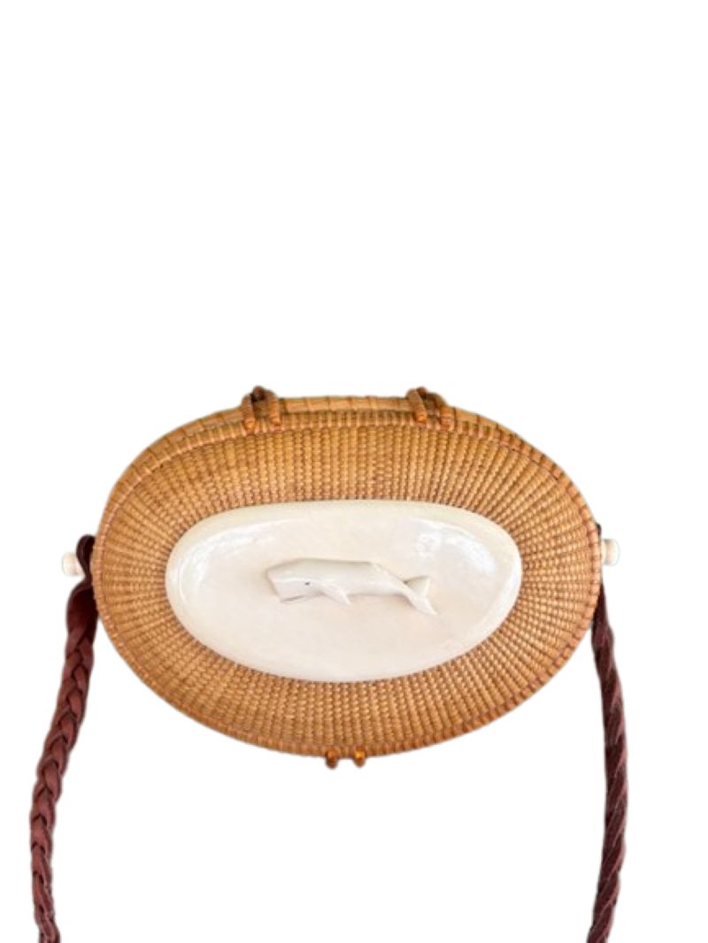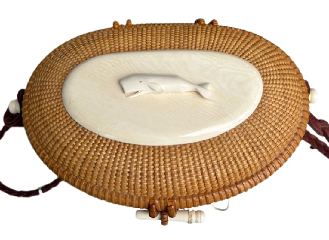 Vintage Nantucket Purse by Larry Brewster, 1994, an oval covered Nantucket basket with cane weave on rattan staves, a scrimshaw carved bone sperm whale atop an ivory top plate, bone peg and knobs holding a braided leather shoulder strap, signed and dated Larry Brewster, 1994 on the maple bottom plate.