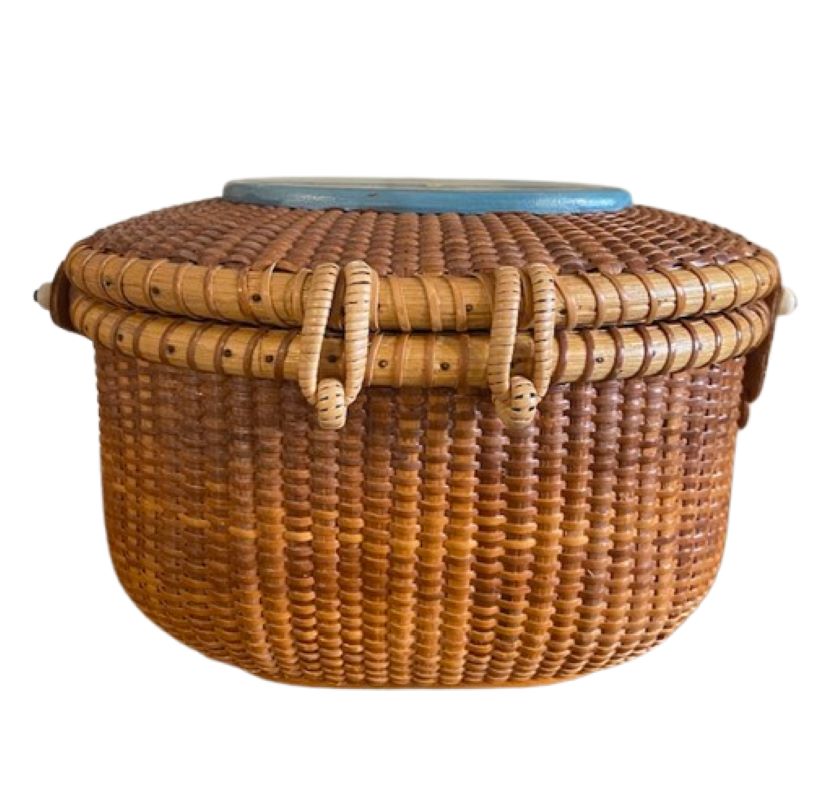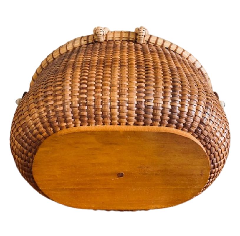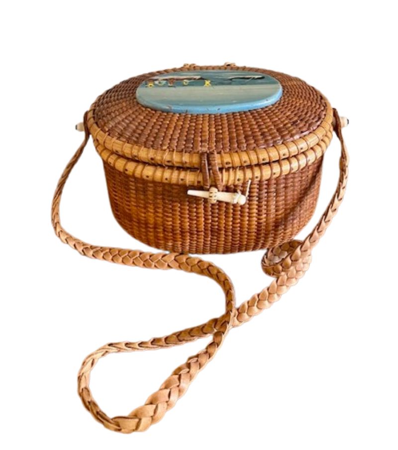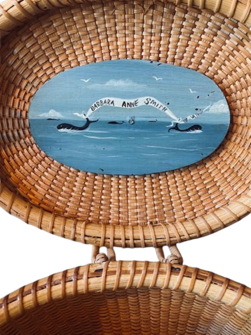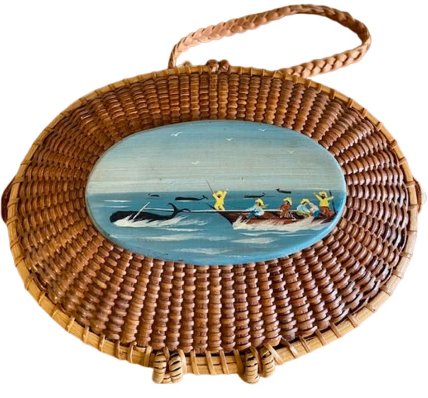 Vintage Nantucket Purse by Barbara Grey, circa 1995, a covered oval Nantucket basket, with cane weave on rattan staves, braided leather shoulder strap, turned bone peg, and having a lovely folk art painted whaling scene on the top plate, painted inside and out, signed by V. Pena, dated with a 1995 penny mounted into the bottom plate.